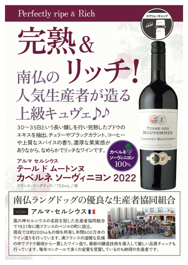 ●生産年:2022年 ●生産者:アルマ・セルシウス ●生産国:フランス ●地域:ラングドック ●品種:カベルネ・ソーヴィニヨン ●種類:赤ワイン ●サイズ:750ml