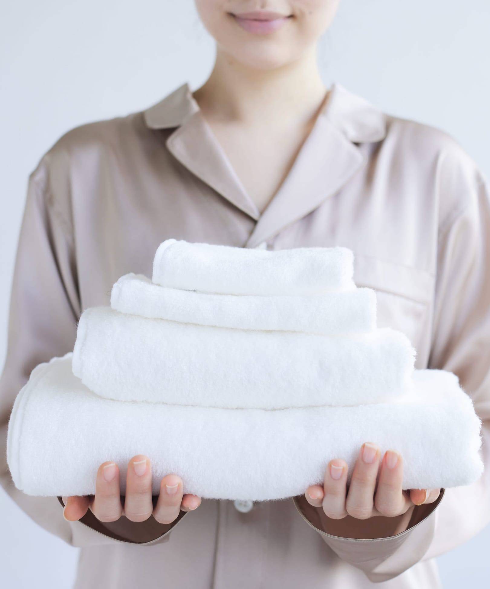 コットンを糸にする段階から柔らかさを損なわないように加工を施しているため、洗濯しても固くなりにくく、ふわふわ感が長く続く特別仕様です。