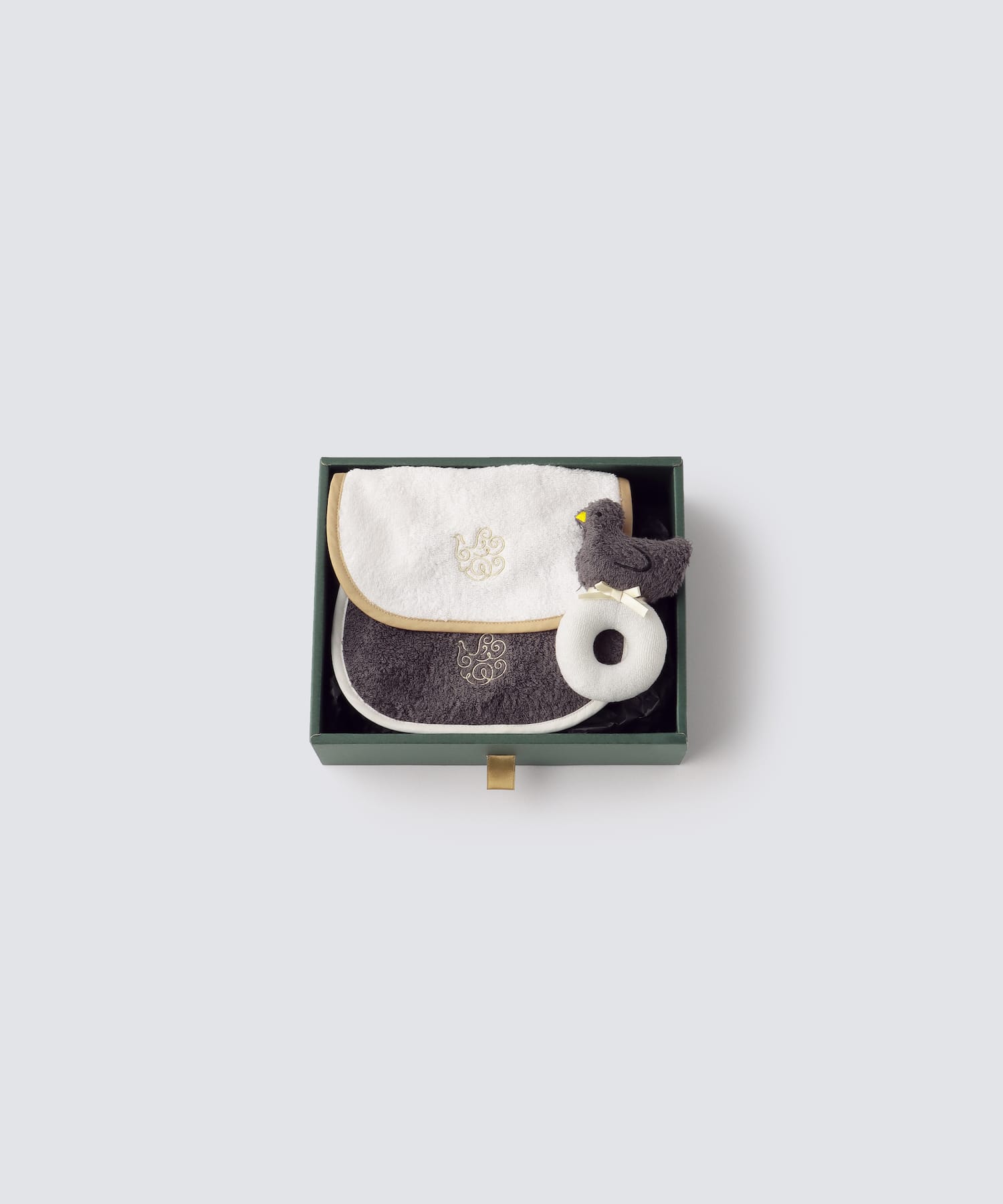 スタイ2個、ガラガラ1個がFoo Tokyoオリジナルのギフトボックスに入っています。