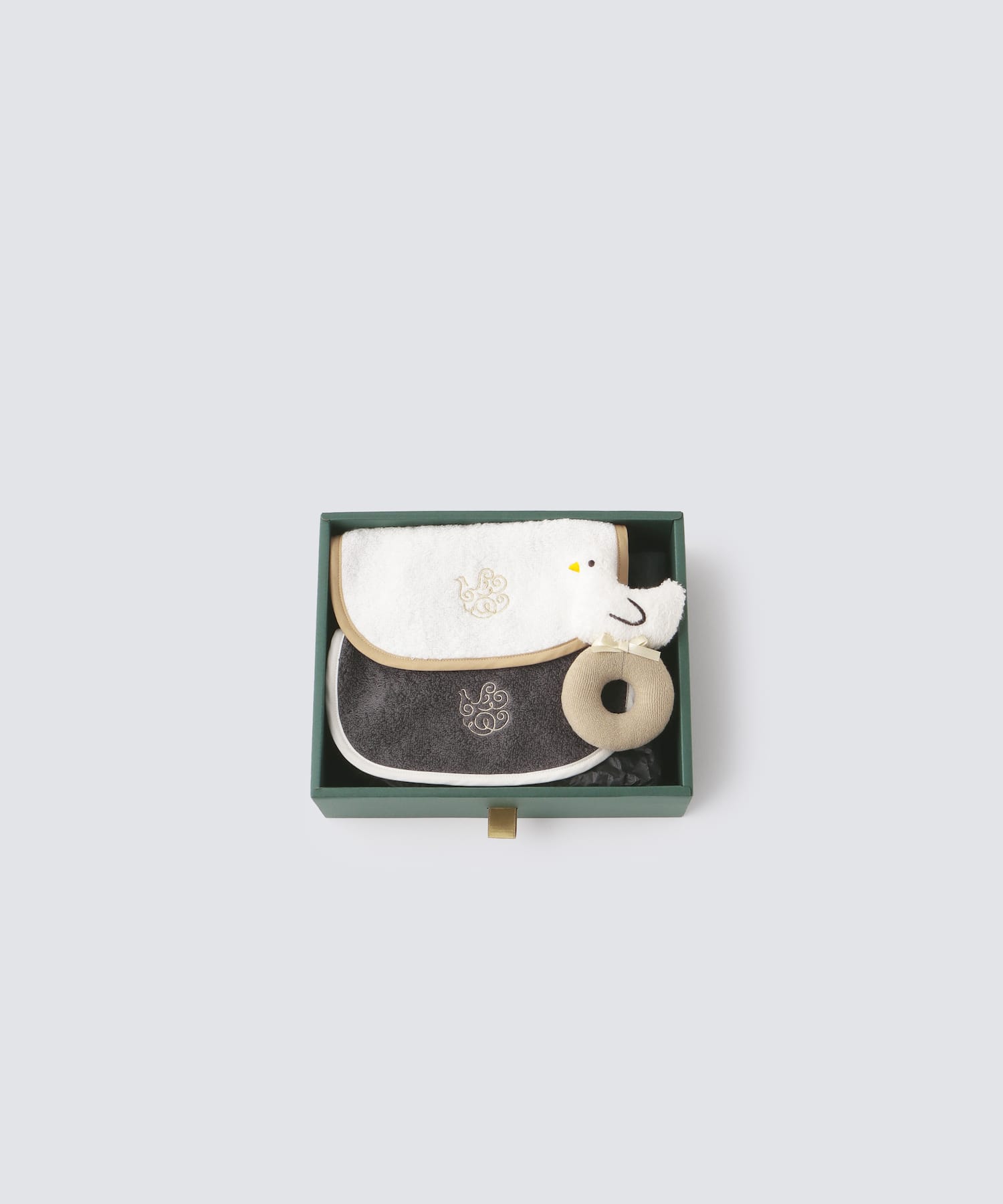 スタイ2個、ガラガラ1個がFoo Tokyoオリジナルのギフトボックスに入っています。
