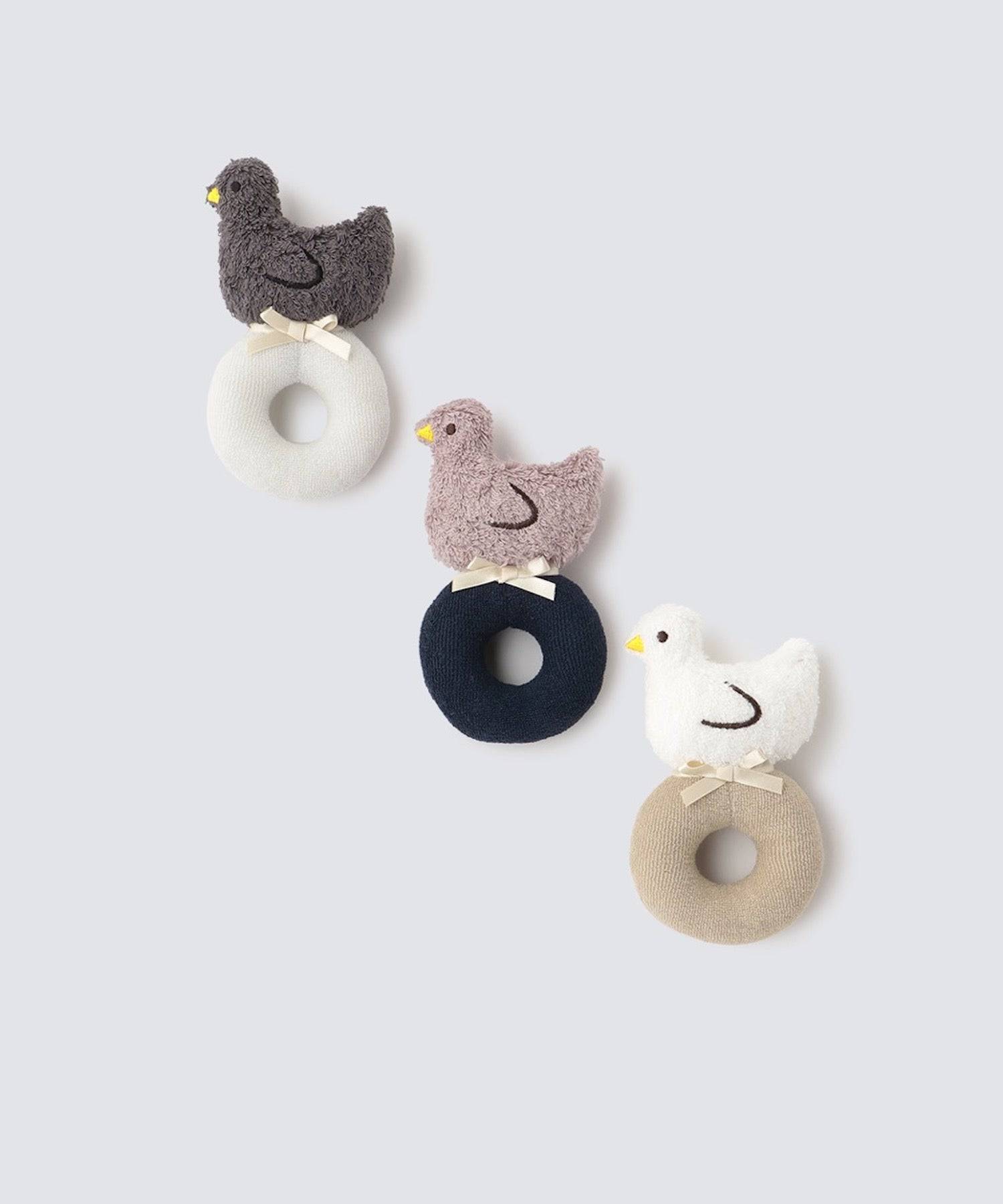 スタイは「よだれ掛け」とも言われ、赤ちゃんのよだれや食べこぼしから服を守る役目があります。 可愛らしい小鳥の形をしたガラガラは、音を鳴らすことで赤ちゃんをあやすアイテム。