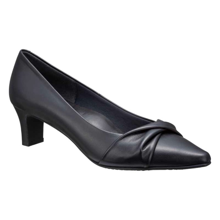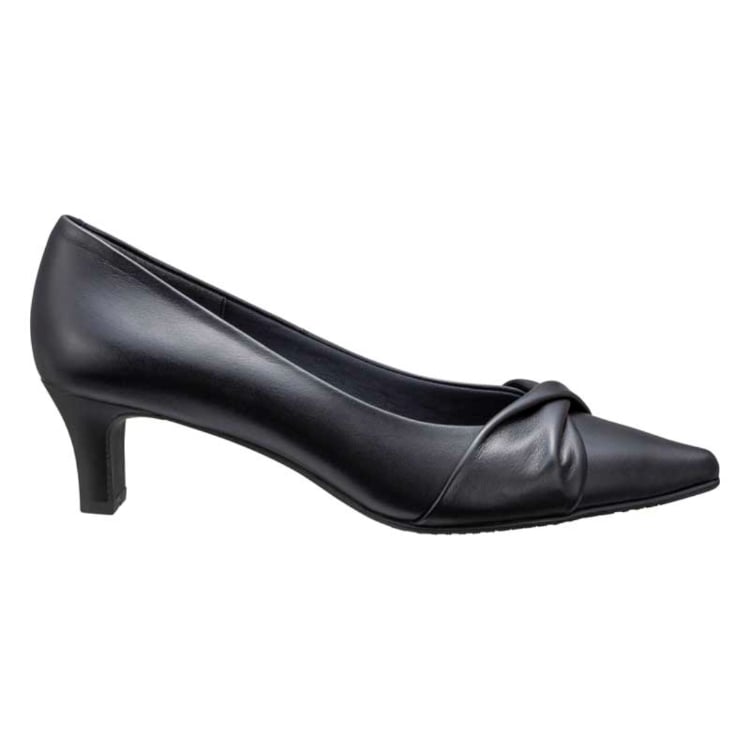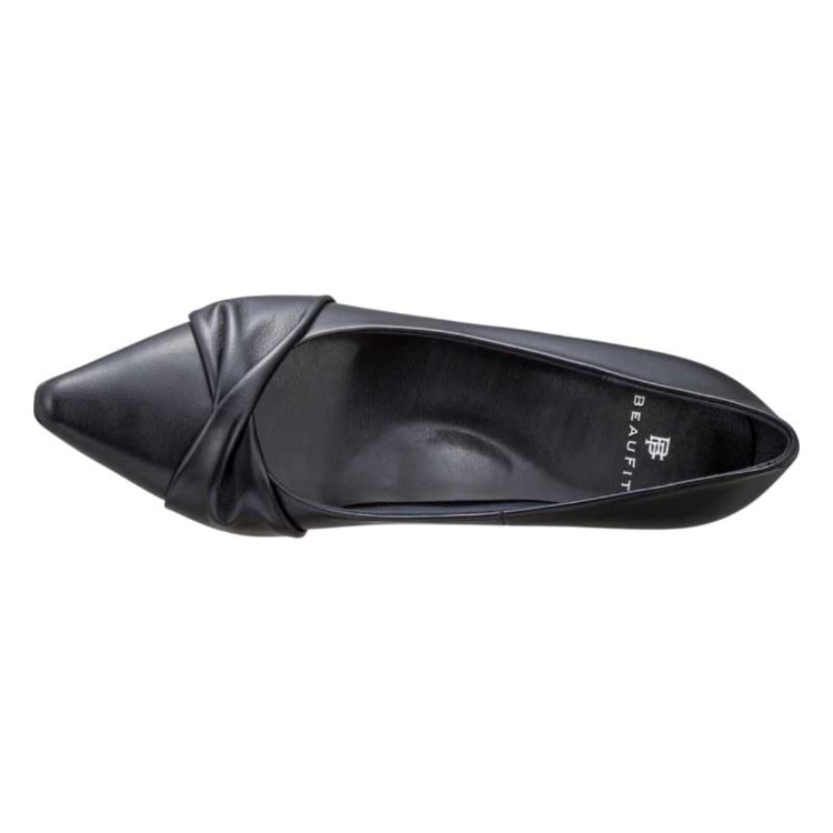 すっきりとしたポインテッドスクエアトウに、ドレープデザインをのせることで女性らしい柔らかな印象を与えてくれる1足。シンプルなデザインのため、オケージョンからデイリーまで幅広く活躍。