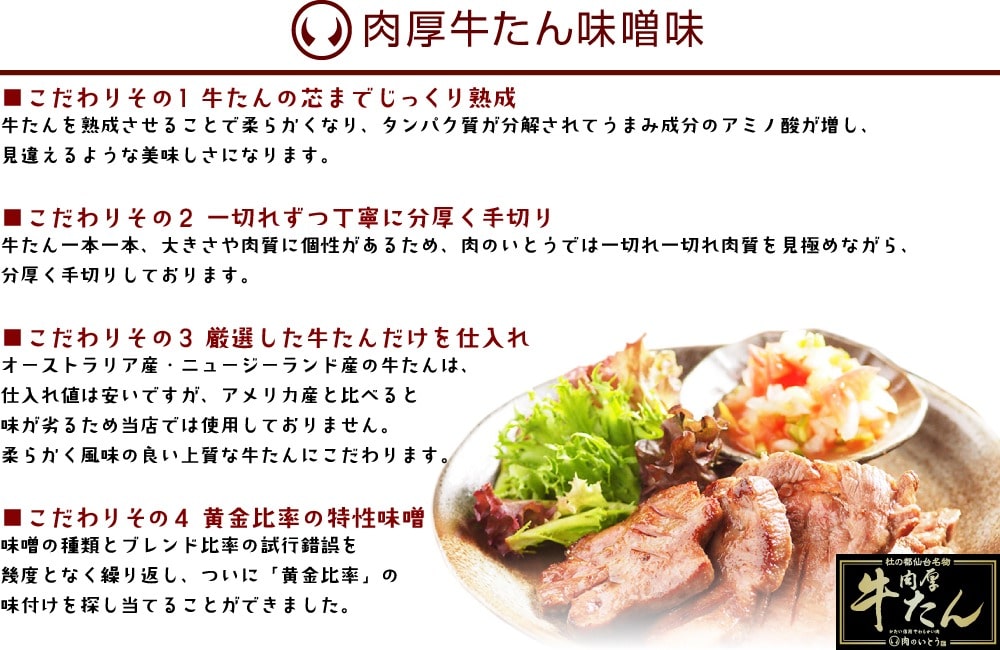 牛タン(豪州産、米国産)、調味みそ、米みそ、酒、醤油、砂糖、塩、こしょう/調味料(アミノ酸等)、着色料(紅麹、カラメル、パプリカ色素)、酸味料、酸化防止剤(ビタミンC)、増粘剤(キサンタン)、(一部に小麦・大豆・牛肉、りんご・ごまをむ) |