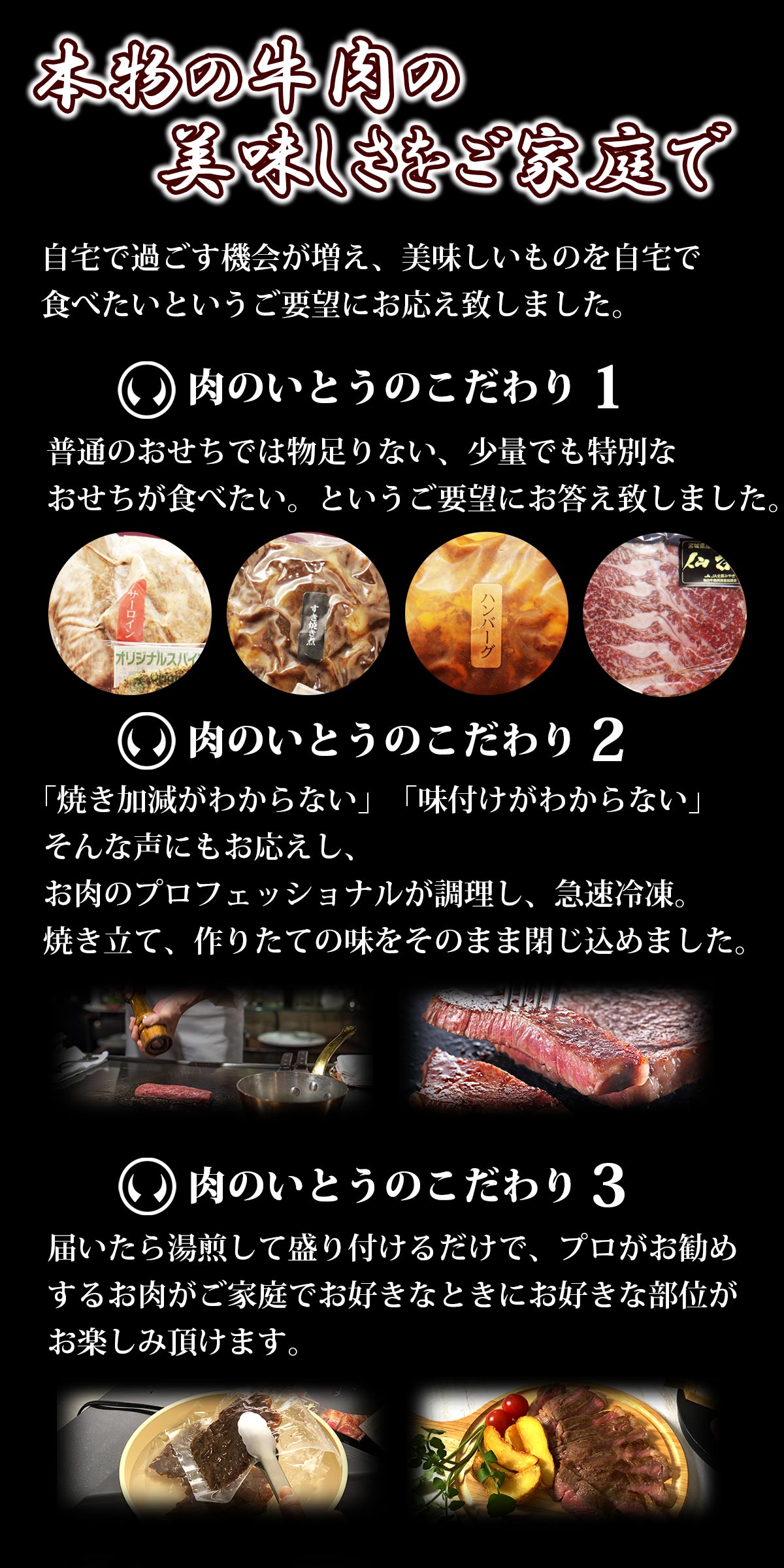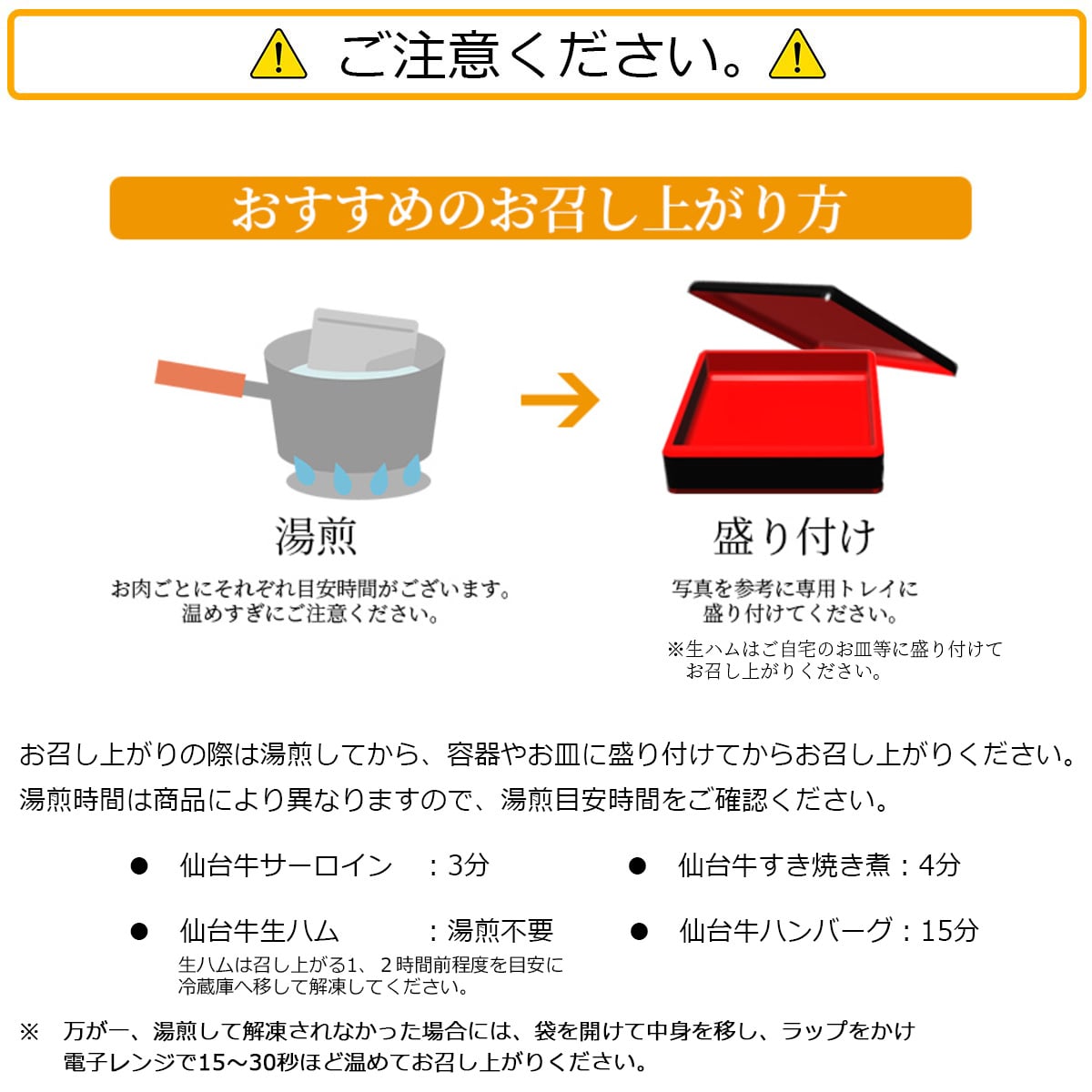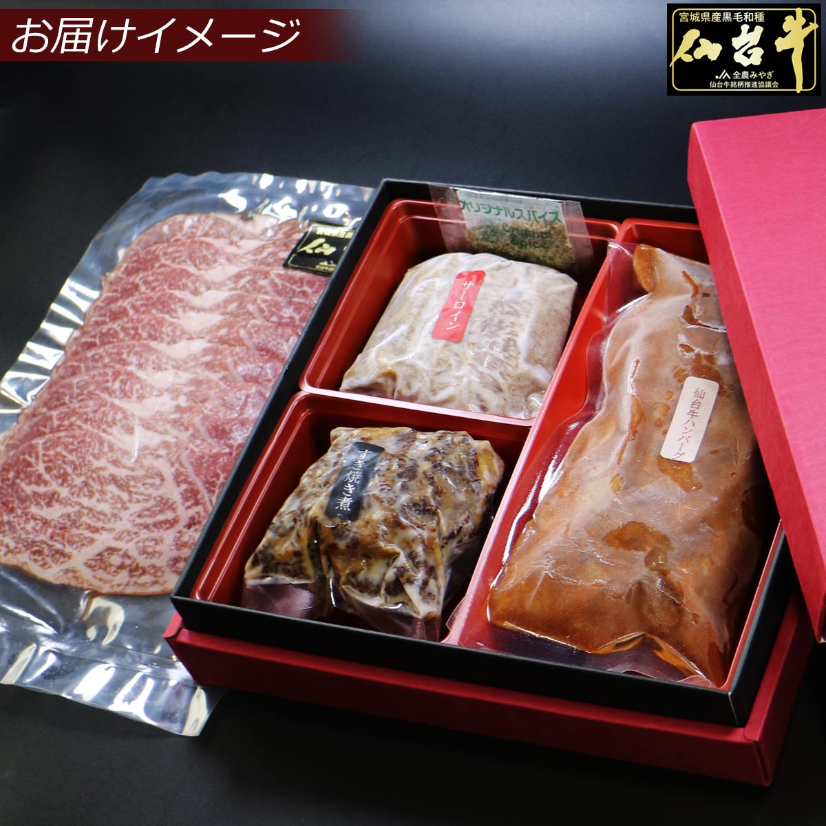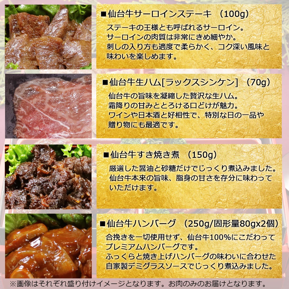 【仙台牛サーロインステーキ】(湯煎目安:3分) 牛肉(仙台牛)、食塩、こしょう、酒、醤油、コーングリッツ、上新粉、馬鈴薯でん粉、酵母エキス/調味料(アミノ酸等)、(一部に小麦・大豆・牛肉を含む) 【仙台牛すき焼き煮】(湯煎目安:4分) 牛肉(仙台牛)、砂糖、醤油、(一部に小麦・大豆・牛肉を含む) 【仙台牛ハンバーグ】(湯煎目安:15分) ハンバーグ(牛肉(仙台牛)、玉ねぎ、全卵、その他)、デミグラスソース(野菜ソテー(たまねぎ、にんじん、赤ワイン、その他)、 小麦粉、ラード、トマトペースト、ぶどう糖加糖液糖、その他)/増粘剤(加工デンプン、カラギナン)、カラメル色素、調味料(アミノ酸等)、 乳化剤、香料、pH調整剤、(一部に小麦、乳、大豆、牛肉、豚肉、鶏肉、ゼラチンを含む) 【仙台牛生ハム】(湯煎不要) (牛ラックスシンケン 非加熱食品製品) 牛肉(国産)、塩、ぶどう糖、水飴/甘味料(ソルビット)、リン酸塩(Na、K)、発色剤(硝酸K、亜硝酸Na)、酸化防止剤(V、C)水分活性0.95未満 |