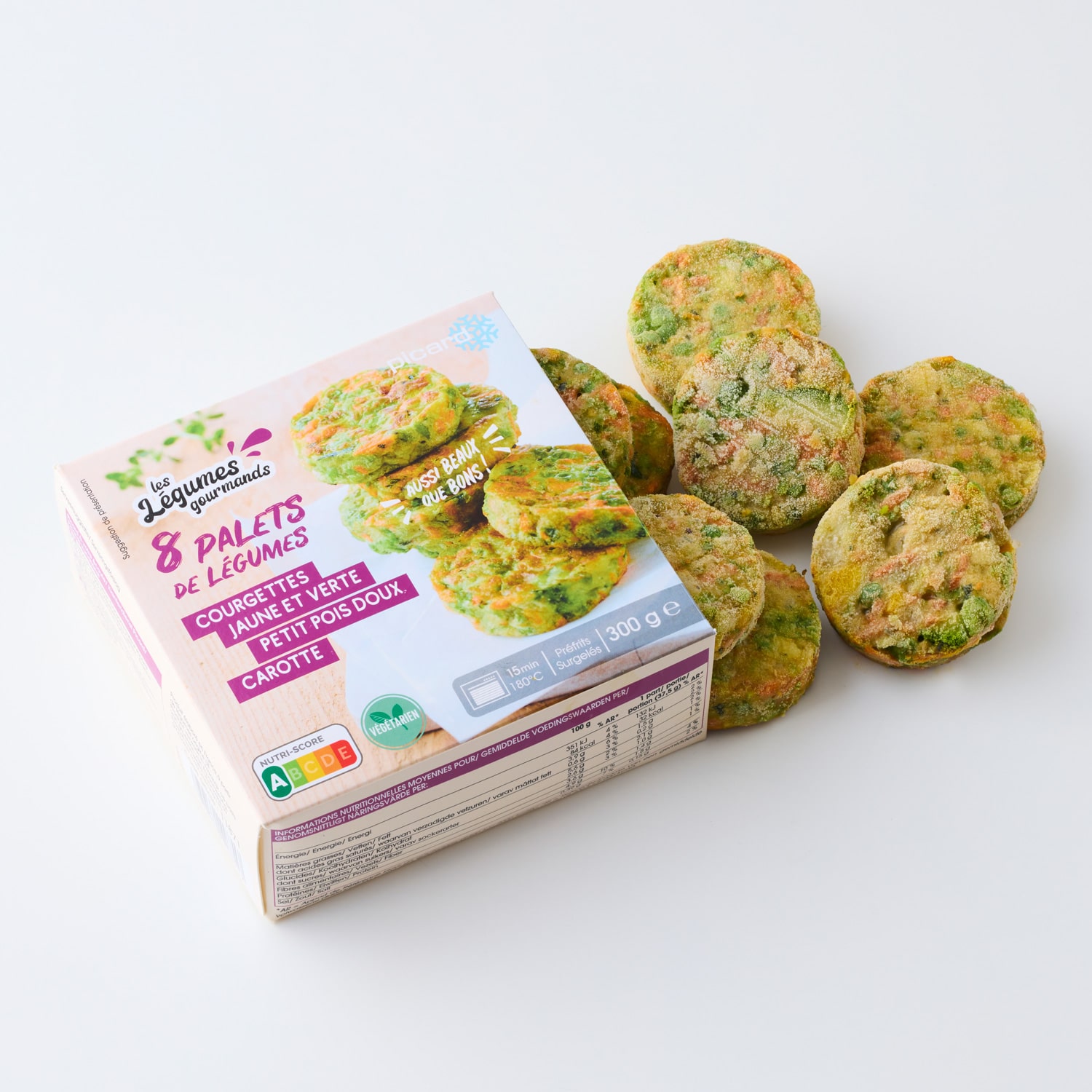 ズッキーニ、グリンピース、にんじん、玉ねぎ、植物油脂、アマニ粉末、卵白粉(卵を含む)、全卵粉、バジル、食塩、ニンニクパウダー、白こしょう、ローズマリー、オレガノ