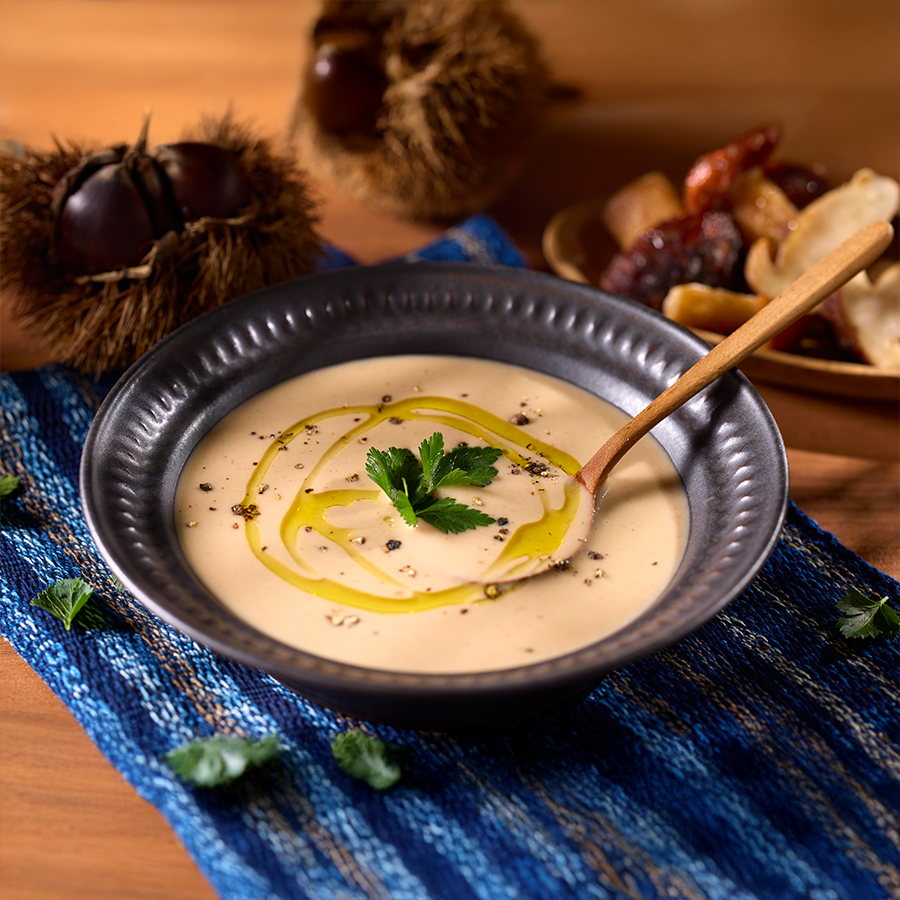 西洋栗、ポルチーニ茸、クリーム(乳成分を含む)、じゃがいも、バター、にんじん、食塩、にんにく、黒コショウ