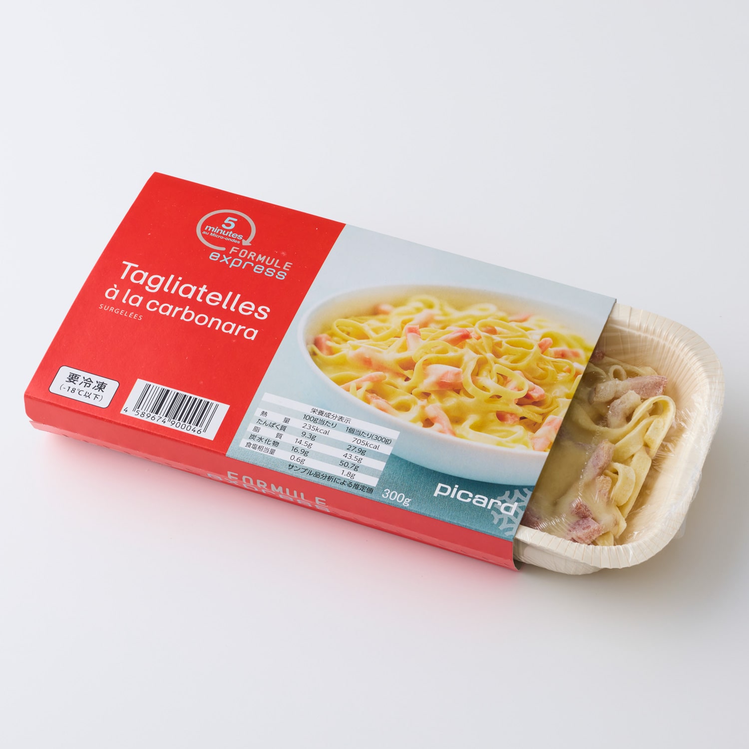 ゆでパスタ、生クリーム、ベーコン、チーズ、牛乳、オリーブオイル、ホワイトルウ、粉末卵黄、食塩、香辛料 / 増粘剤(キサンタン)、発色剤(亜硝酸Na)、酸化防止剤(V.C)、(一部に小麦・卵・乳成分・豚肉を含む)