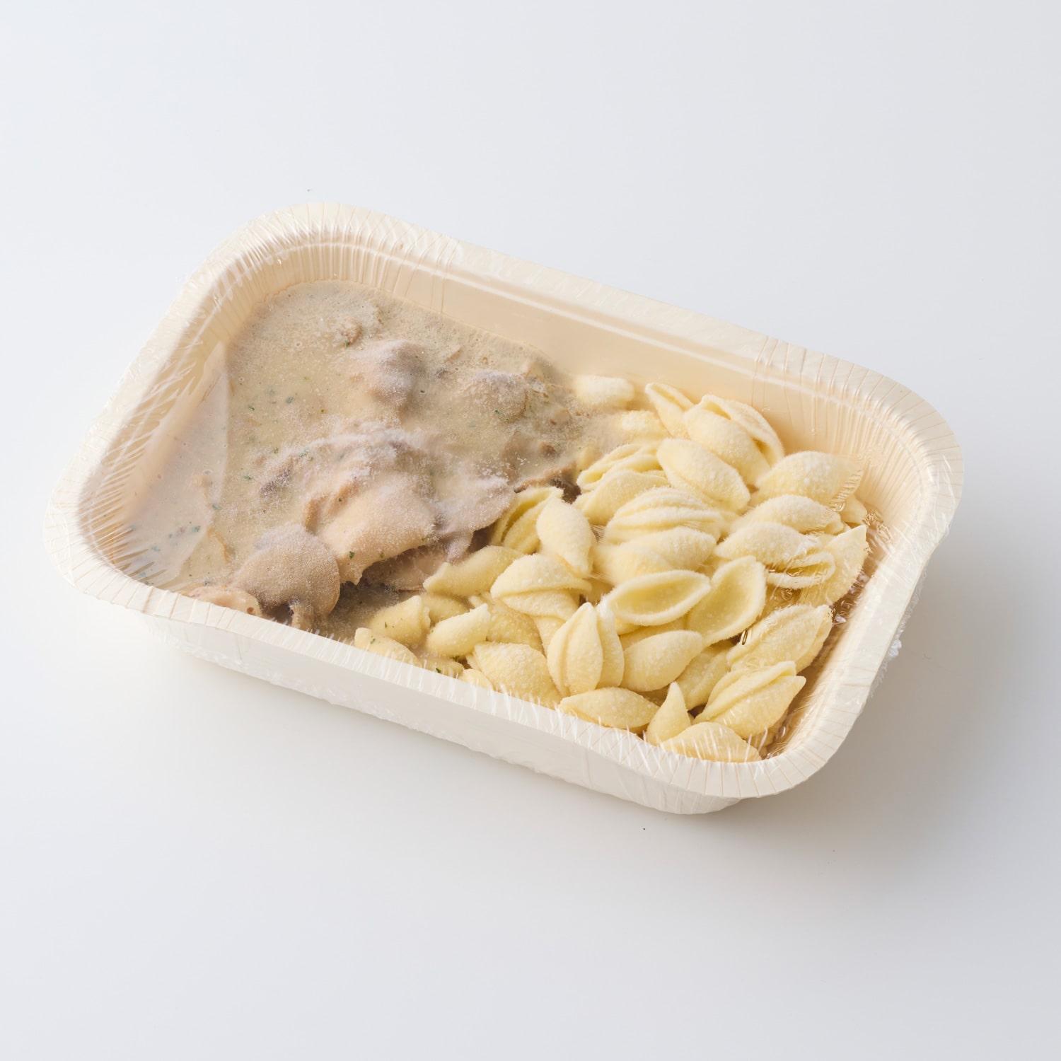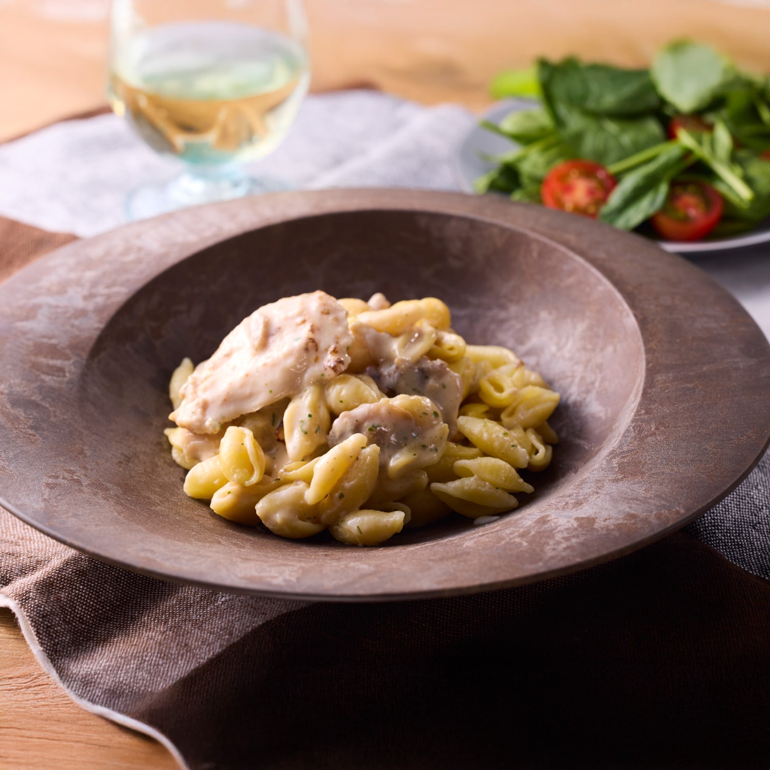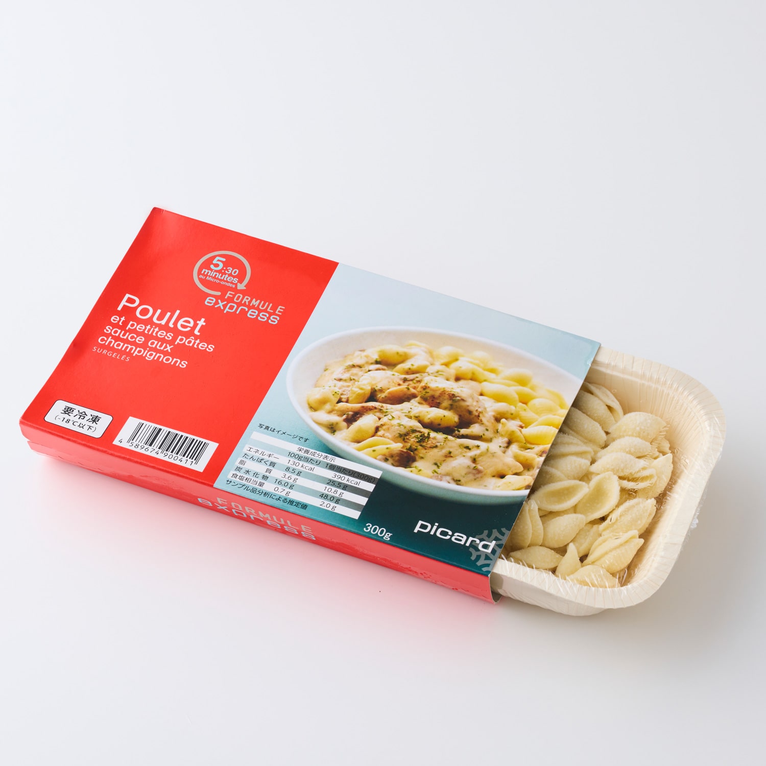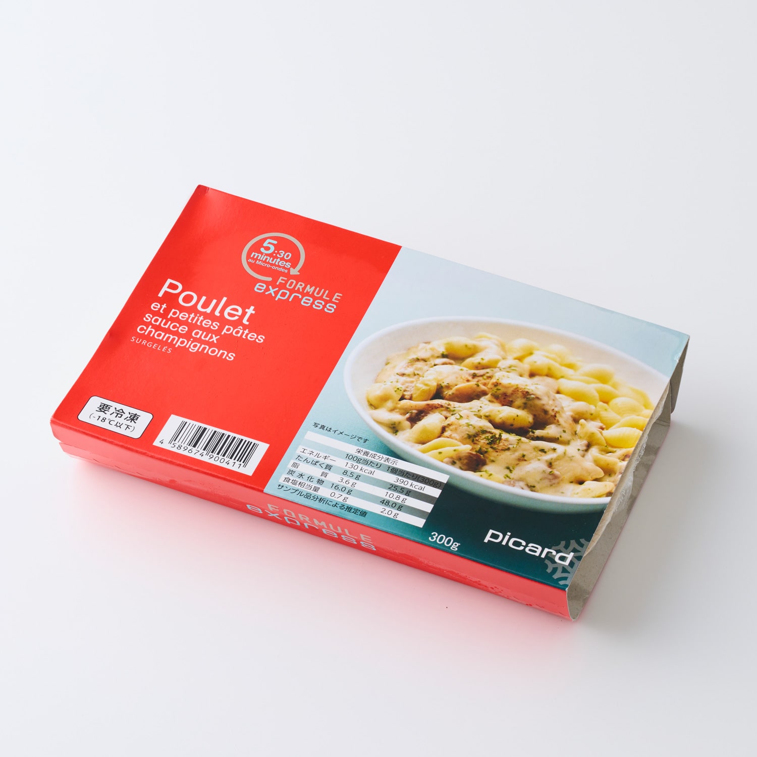 マッシュルーム(オランダ産)、鶏肉(国産)、マカロニ、牛乳、乳等を主要原料とする食品、生クリーム、ホワイトルウ、植物油脂、食塩、レモン果汁、チキンエキス、チーズ、ポルチーニパウダー、果実調味料、香辛料/乳化剤、pH調整剤、ポリリン酸Na、香料、(一部に小麦・乳成分・大豆・鶏肉を含む)