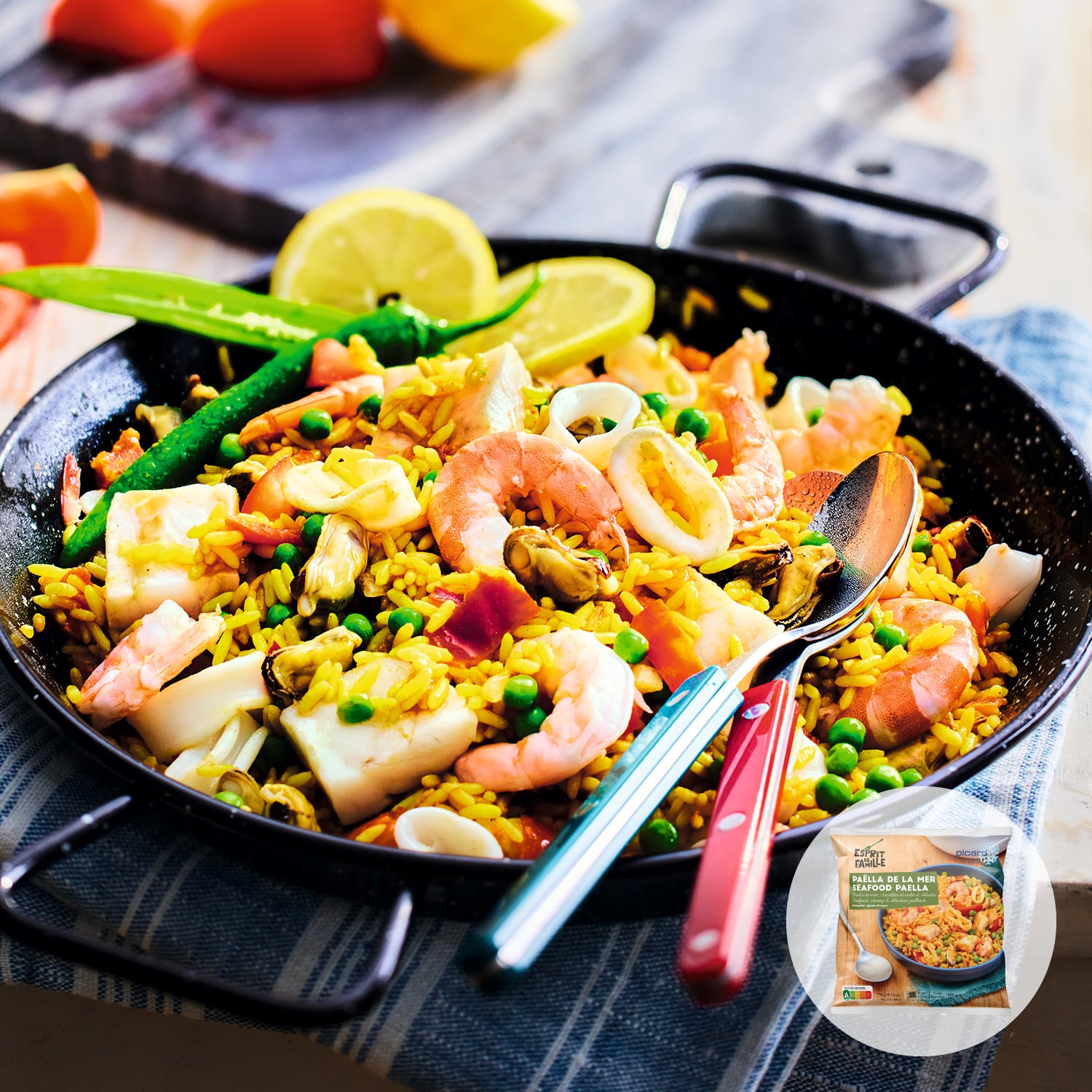 4種類のシーフード(エビ・イカ・タラ・ムール貝)がたっぷり入った、彩りの良いパエリアです。生のまま冷凍されたシーフードから加熱するときに出る風味が、パエリアの味わいをより深めてくれます。