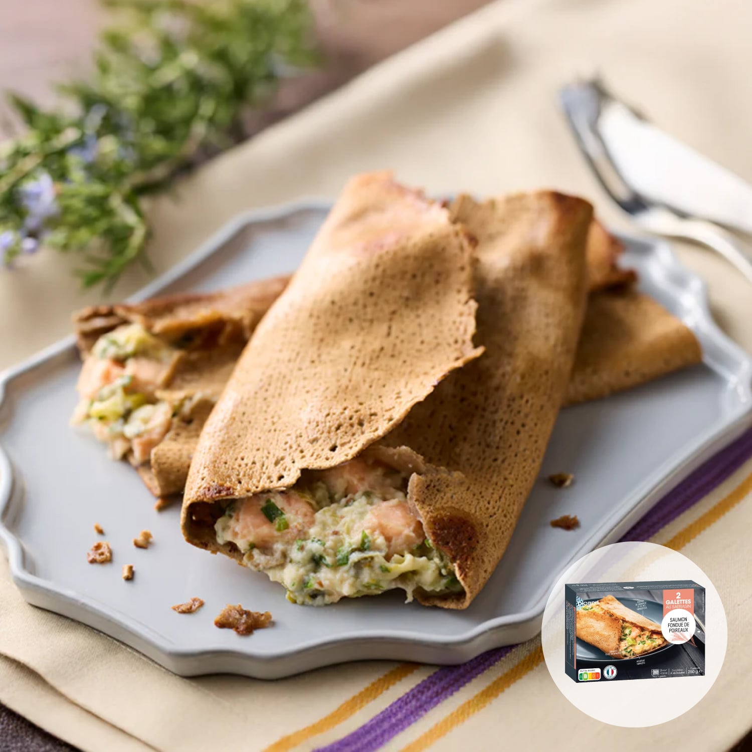 ノルウェー産のサーモンとフランス産のポロネギを、生クリーム、粒入りマスタード、フロマージュブランのソースで味付けし、そば粉のガレットのフィリングにしました。軽めのお食事に最適です。