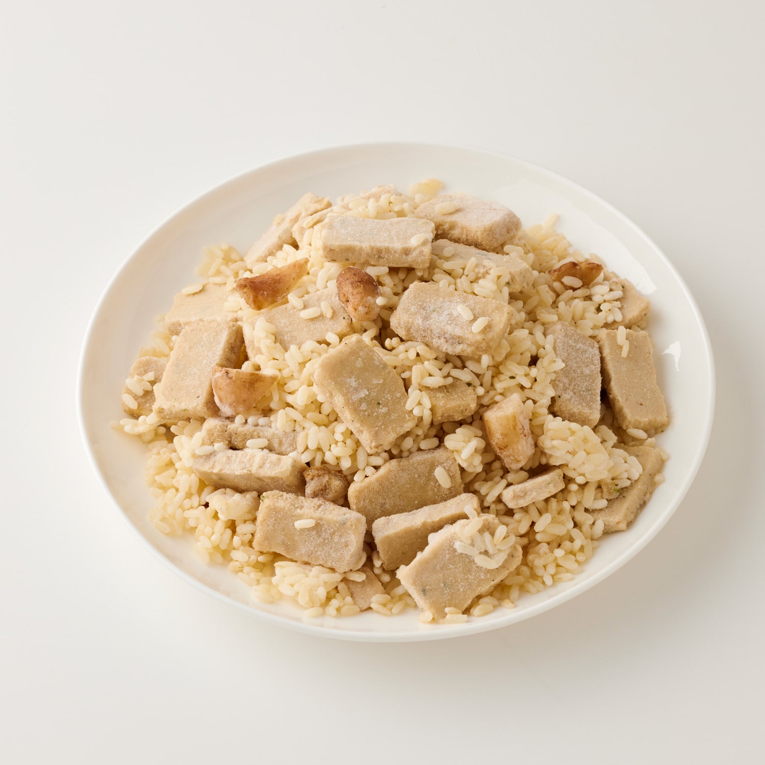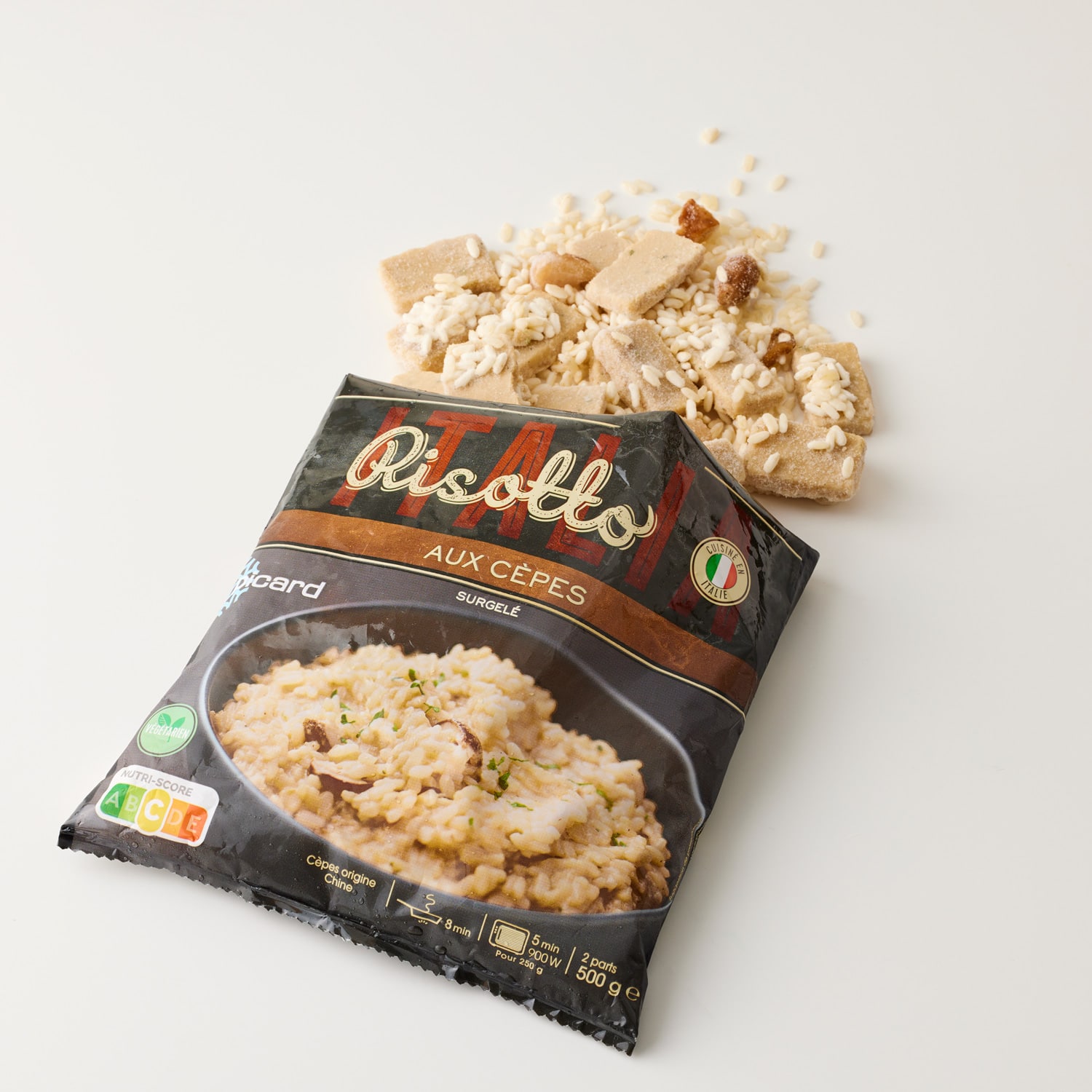 米(イタリア)、ポルチーニ茸、クリーム、ミックスチーズ(ハードチーズ)、バター、玉ネギ、白ワイン、脱脂粉乳、キノコブイヨン(ポルチーニ茸、マッシュルーム、食塩)、食塩、パセリ、野菜エキス、にんにく、乾燥ポルチーニ茸、黒こしょう/増粘剤(加工でん粉)、香料、酵素(卵由来)