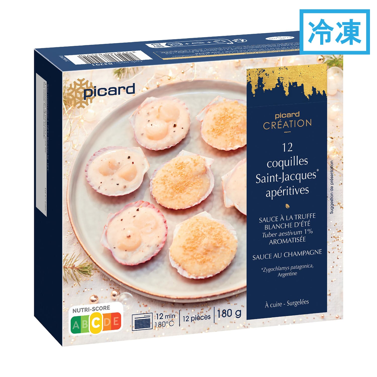 【サンジャックのアペリティフ シャンパンソース】貝柱、野菜スープ(セロリ、トマト、にんじん、マッシュルーム、ポロネギ、ジュニパーベリー)、魚フュメ(魚、洋酒、にんじん、セロリ、玉ねぎ、ポロネギ、バター)、クリーム(乳成分)、洋酒、パン粉、バター、ムール貝エキス、でん粉、小麦粉、白ワインビネガー、エシャロット、バターオイル、全粉乳、食塩、白こしょう