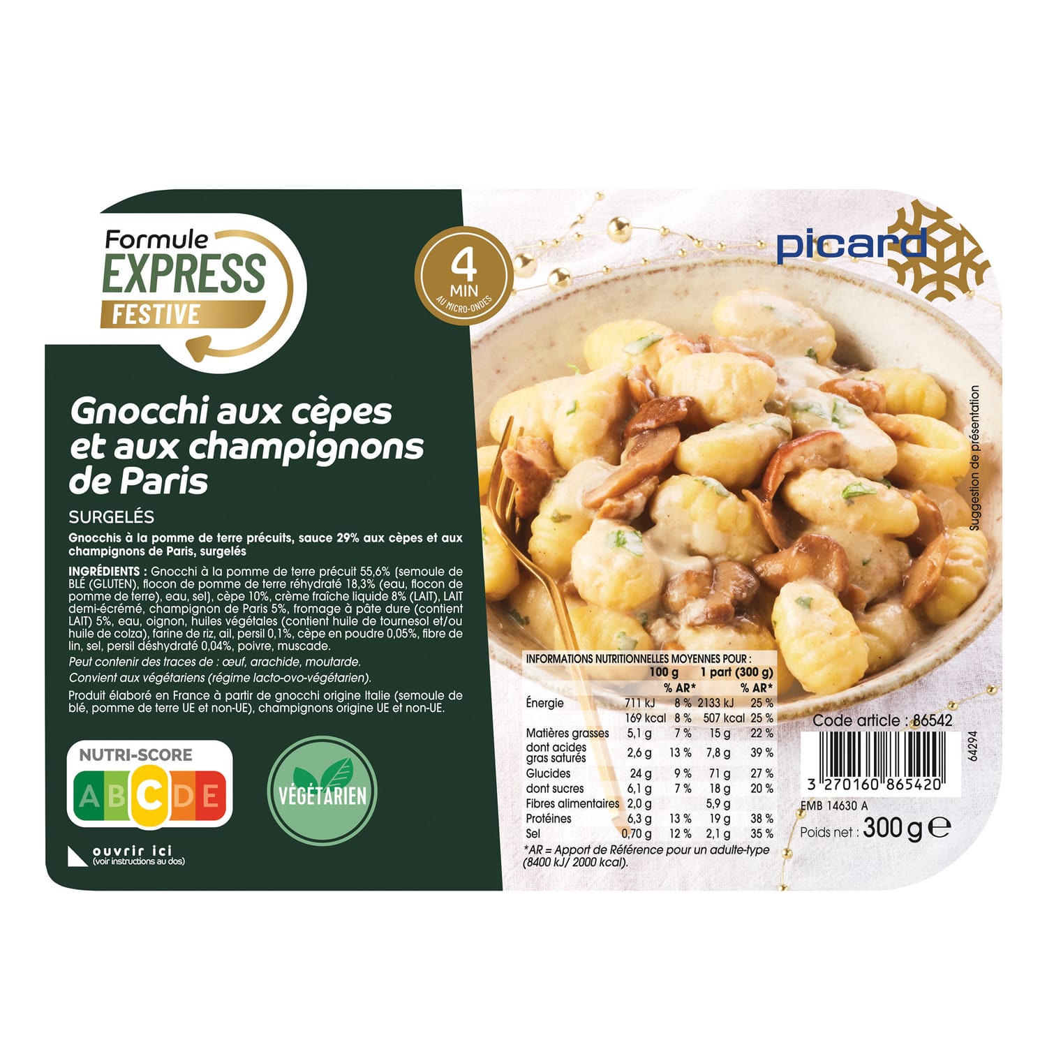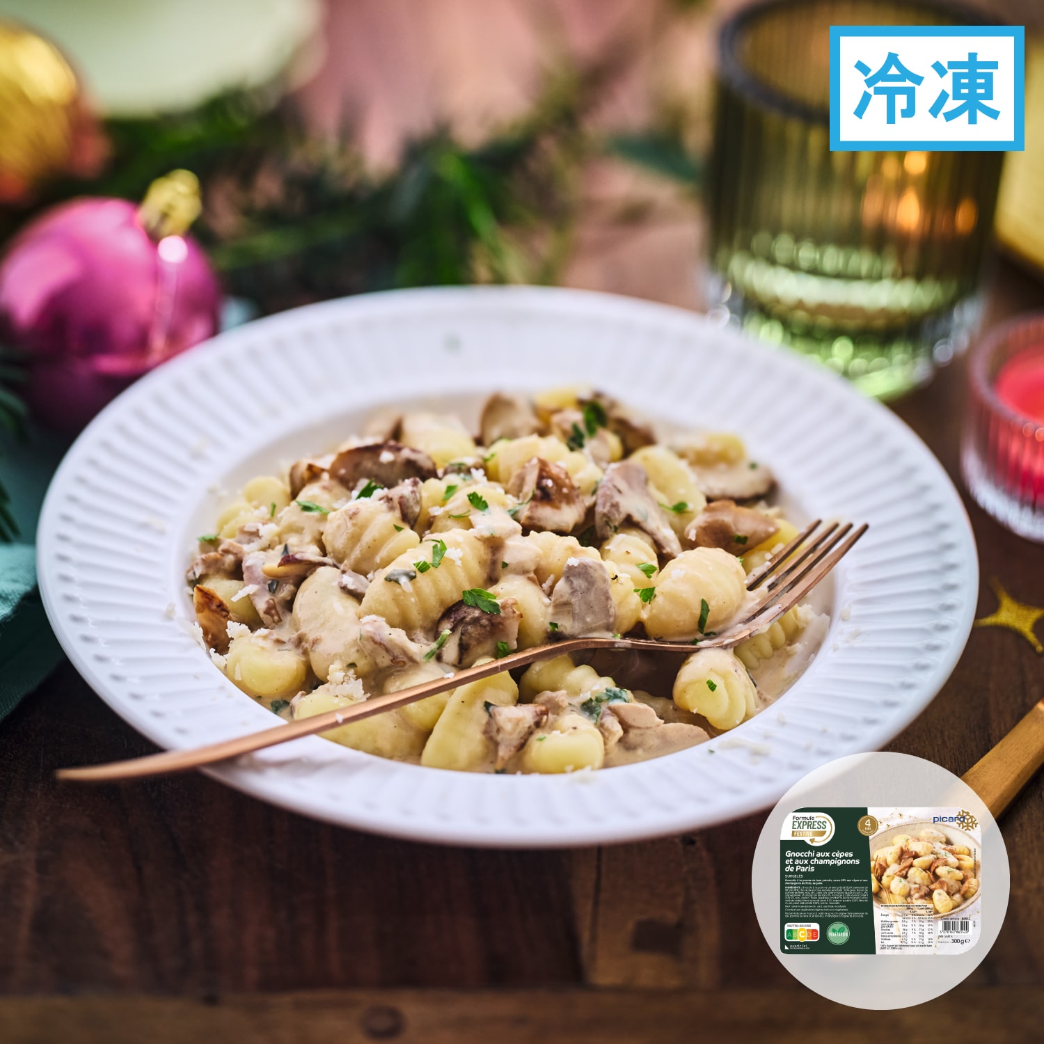 ニョッキ(小麦粉、じゃがいもフレーク、食塩)、ポルチーニ茸、クリーム、低脂肪牛乳、マッシュルーム、ナチュラルチーズ、玉ねぎ、植物油脂、米粉、にんにくピューレ、パセリ、ポルチーニ粉末、食塩、アマニ繊維、白こしょう、ナツメグ