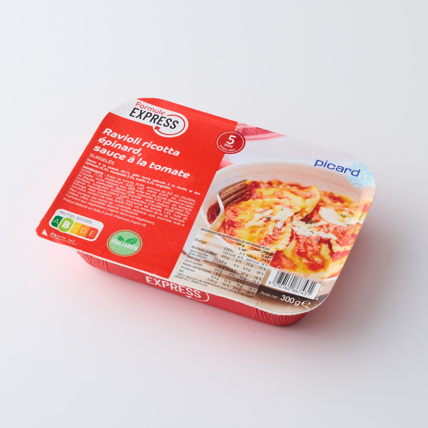 トマトパルプ、デュラム小麦のセモリナ、乳等を主要原料とする食品(リコッタ)、ナチュラルチーズ、全卵液、グリルオニオン、ほうれん草、玉ねぎ、濃縮トマト、植物油脂、でん粉、バジル、食塩、にんにく、ナツメグ