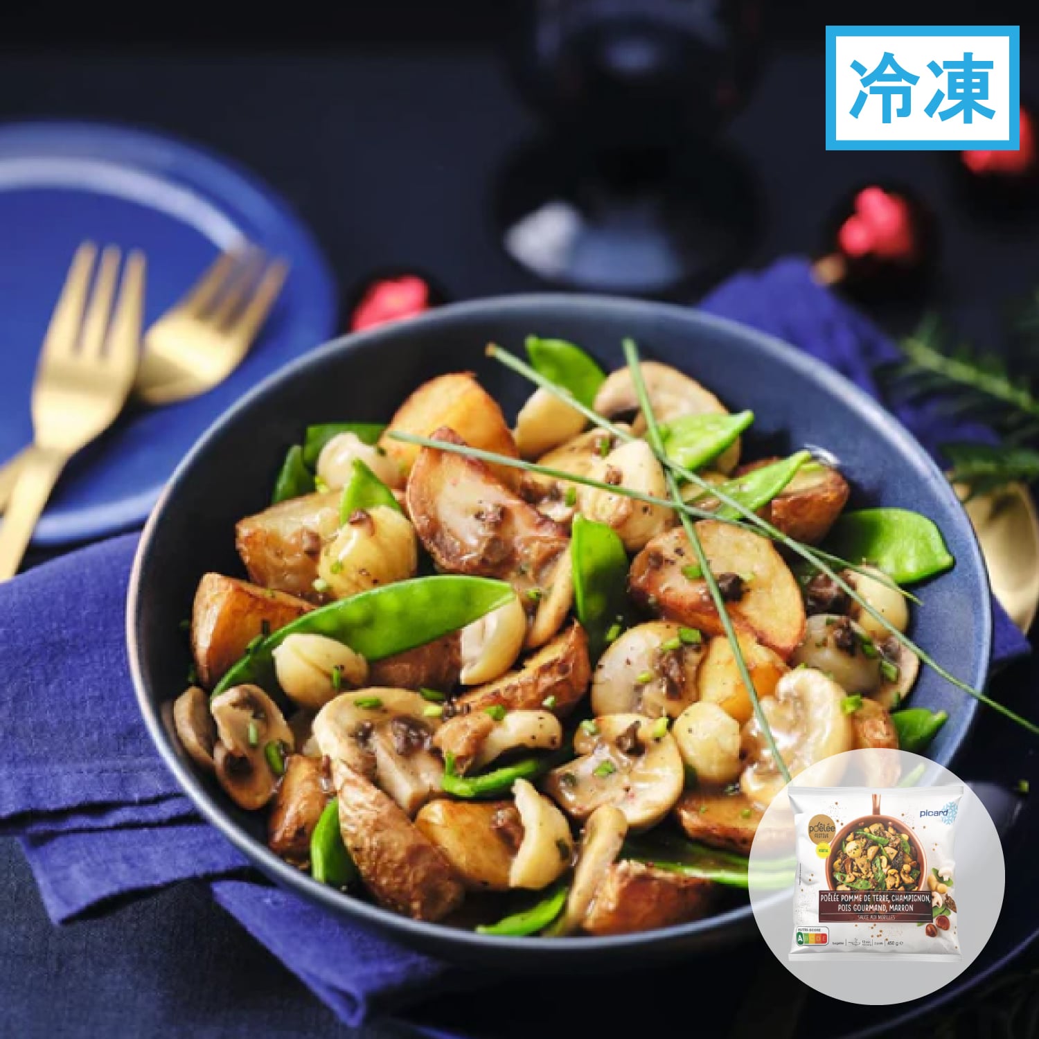 揚げじゃがいも(じゃがいも、植物油脂)、マッシュルーム、スナップえんどう、栗、白ワイン、オリーブオイル、エシャロット、にんにく、アミガサタケ、チャイブ、野菜ブイヨン(玉ねぎ、食塩、長ねぎ、パースニップ、にんにく、にんじん、ラベージ)、ヤマドリ茸パウダー、食塩