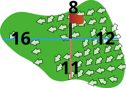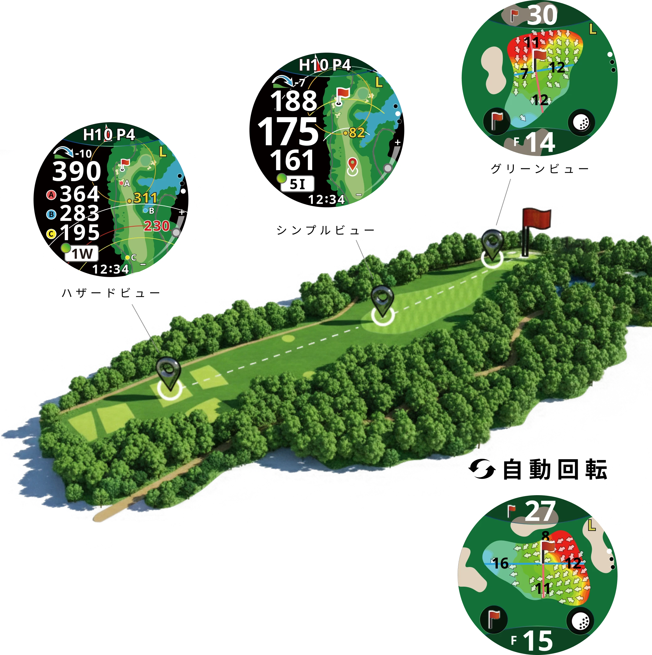 グリーンのアンジュレーションや傾斜の方向、 フロントエッジの表示、また現在地から見た形状に回転。 アプローチ時の実際の狙いどころが明確に