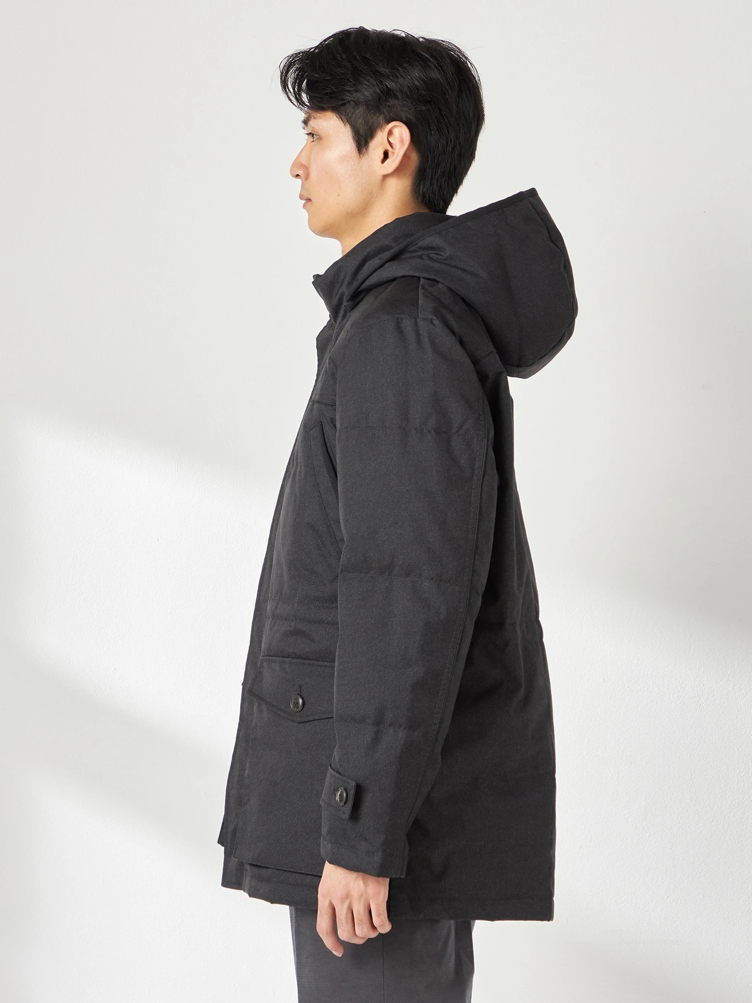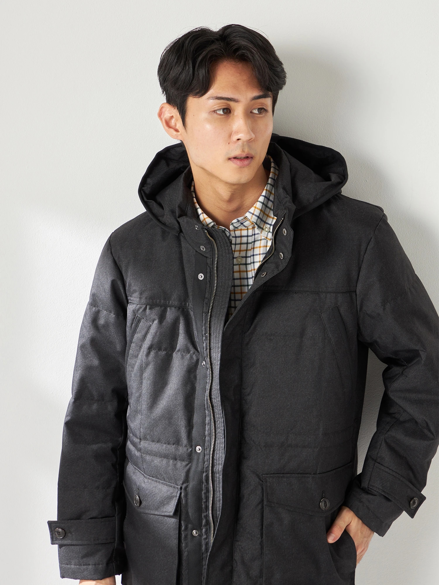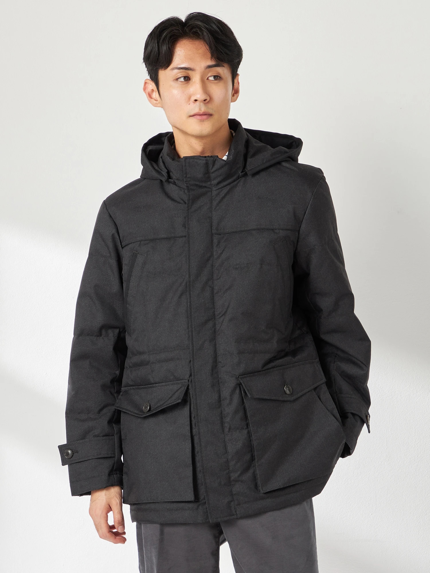 メランジ調の素材で大人の都会的なスタンドカラーダウンコートです。フード端、胸ポケット口の異素材使いや胸、ヨーク袖切り替えに配したパイピングが見た目のアクセントになっています。