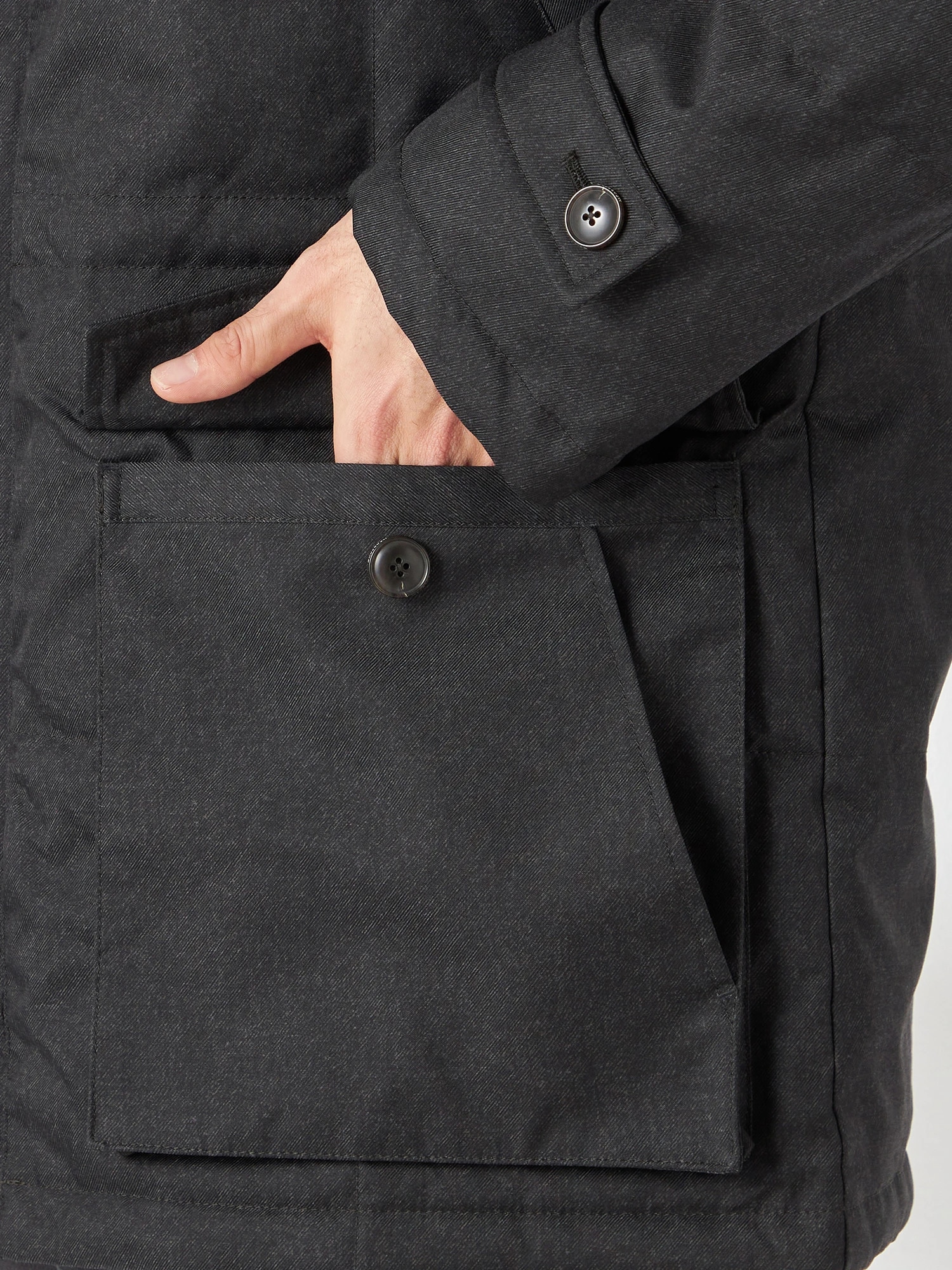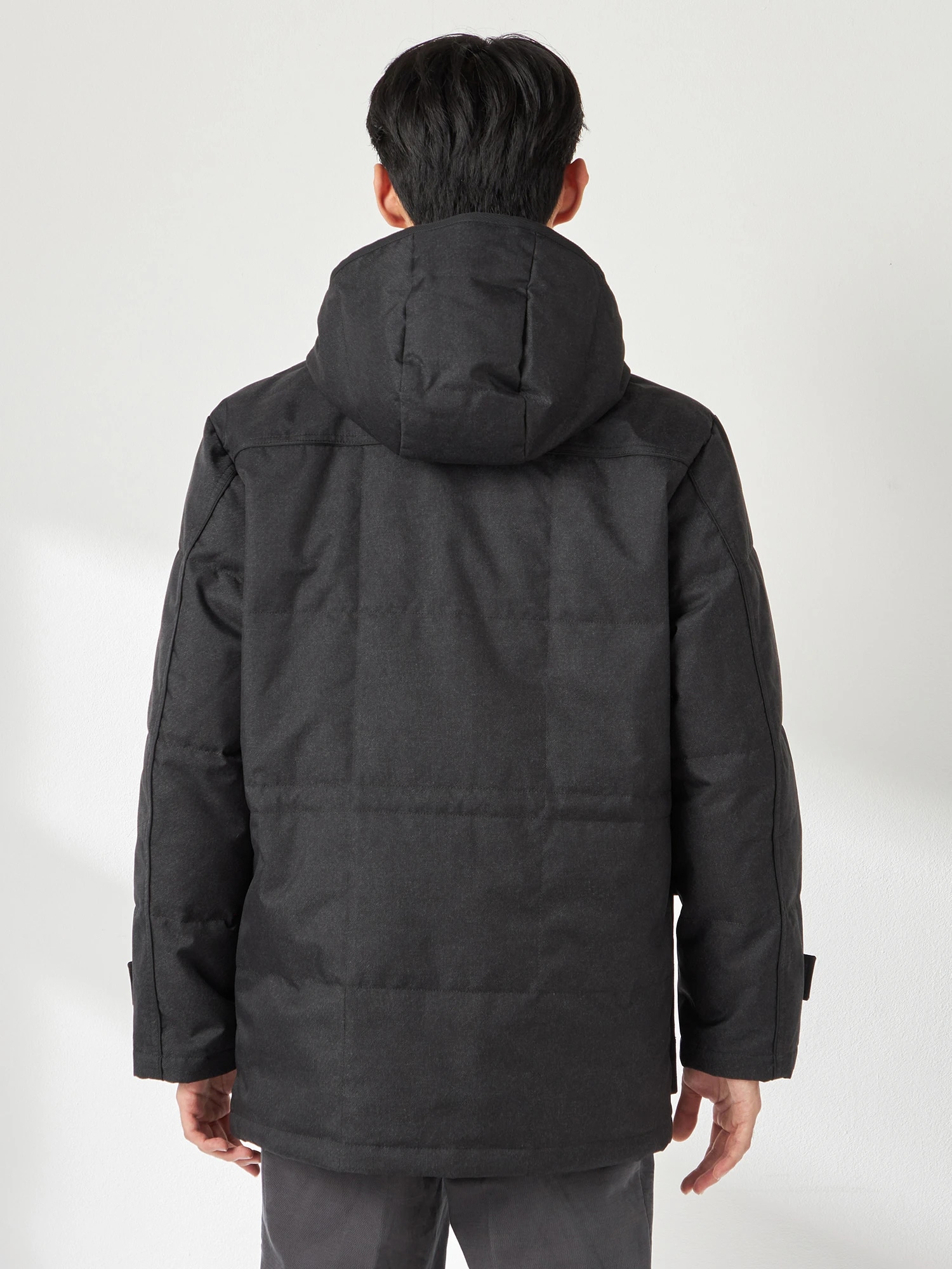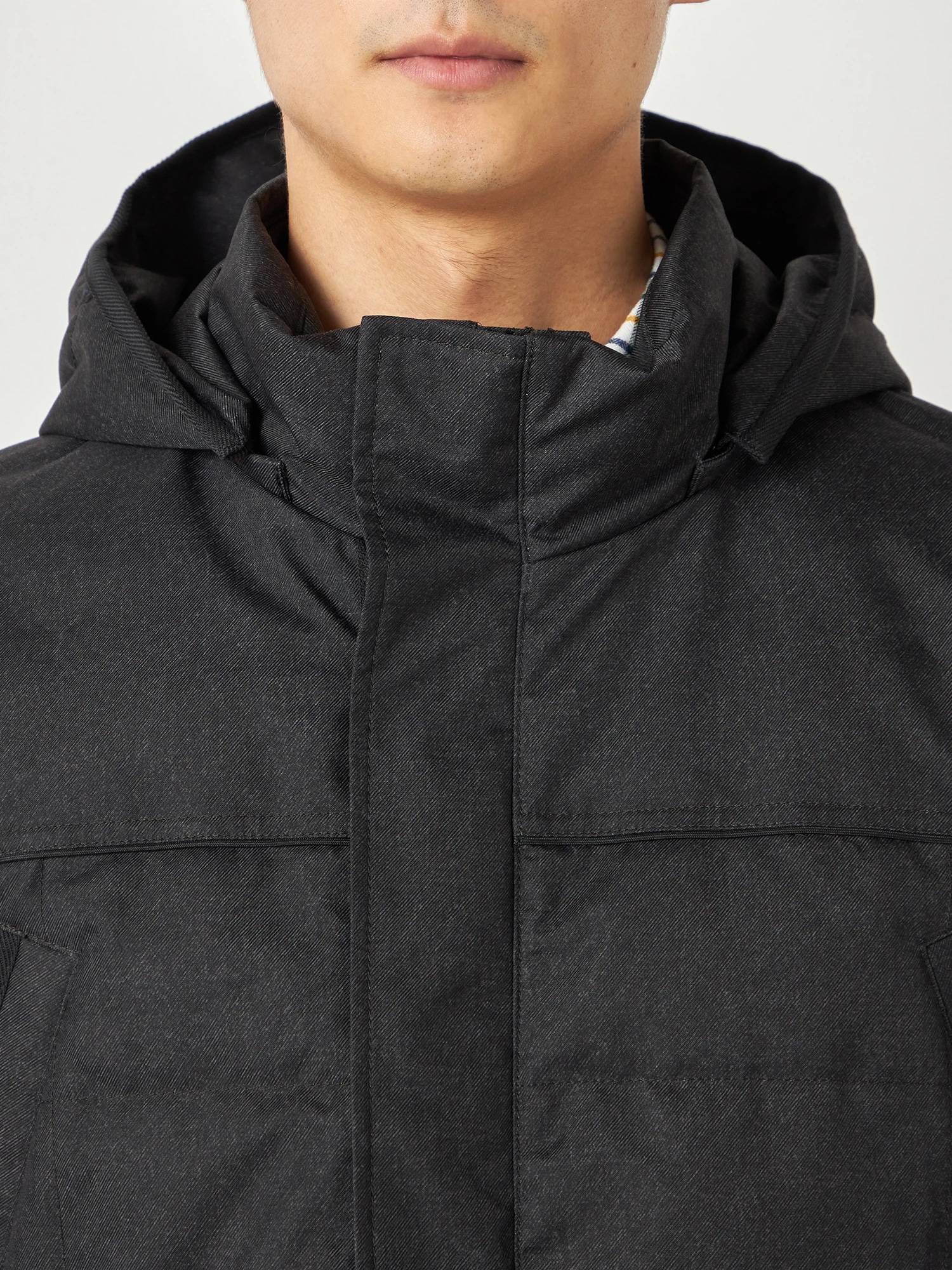 メランジ調の素材で大人の都会的なスタンドカラーダウンコートです。フード端、胸ポケット口の異素材使いや胸、ヨーク袖切り替えに配したパイピングが見た目のアクセントになっています。