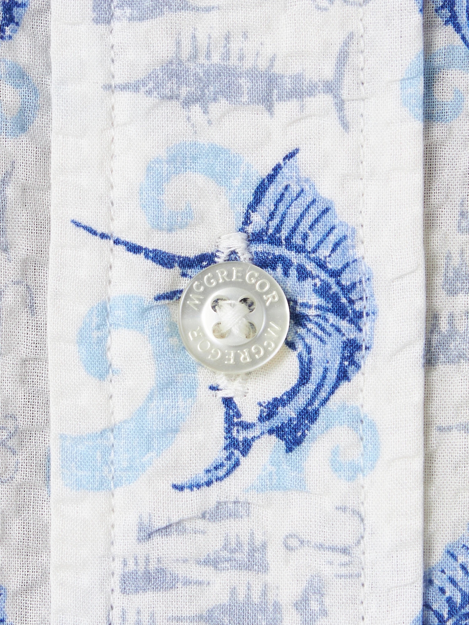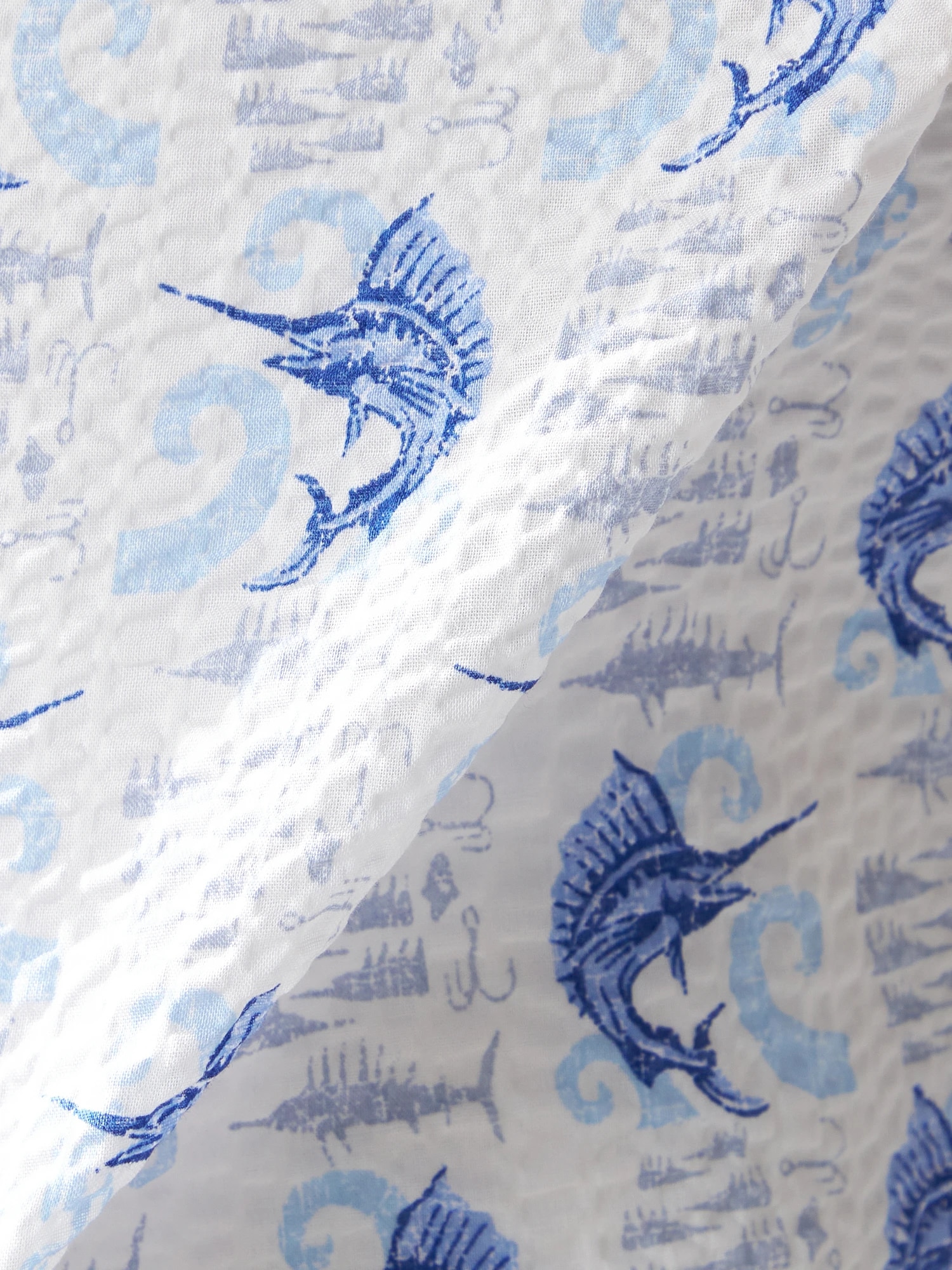 海を感じさせるカジキと波の組み合わせの爽やかな総柄プリントシャツ。(通常のシャツのサイズよりも若干ゆったりとしたサイズ感:着丈+1cm、巾で+2cm)