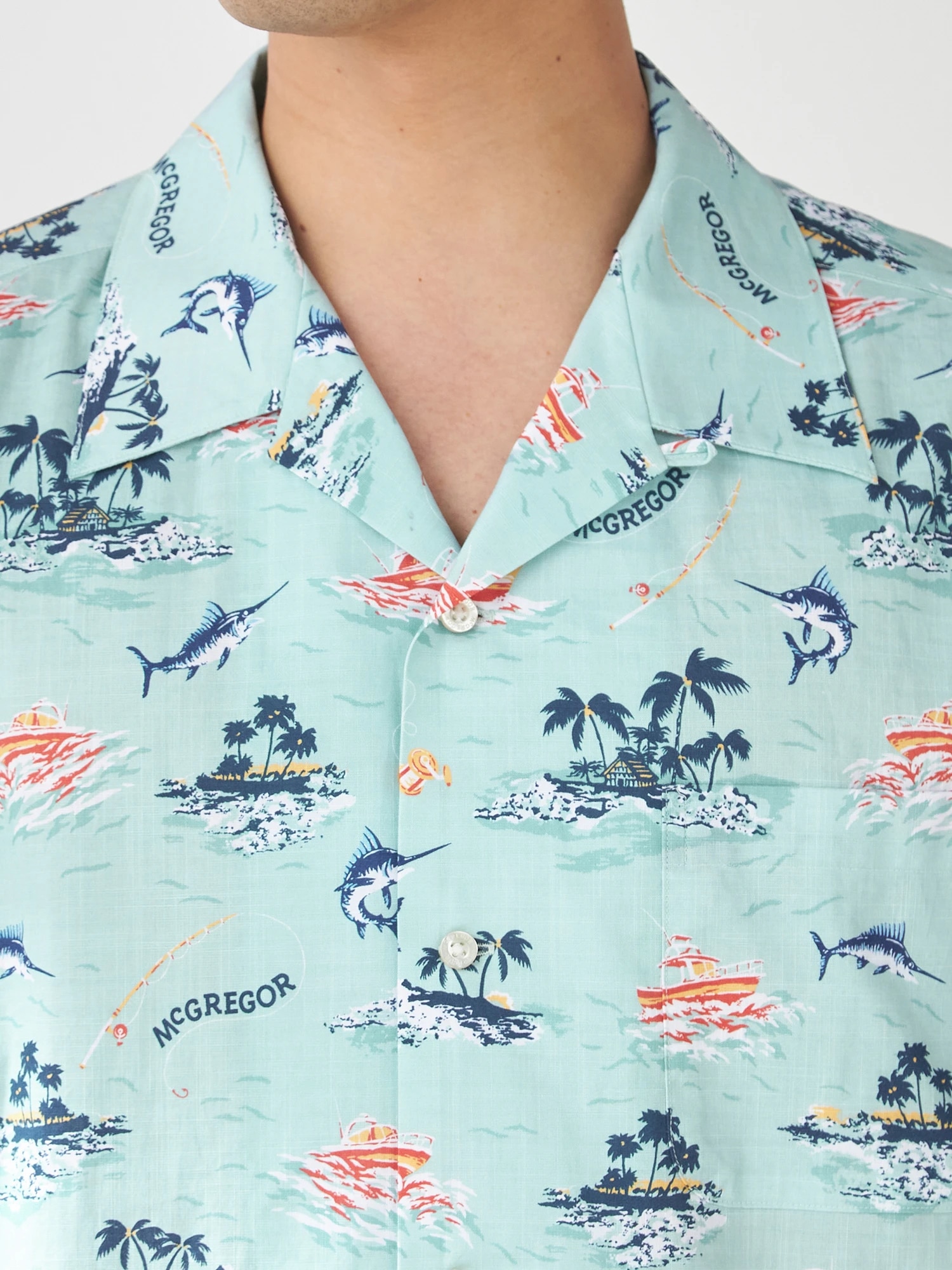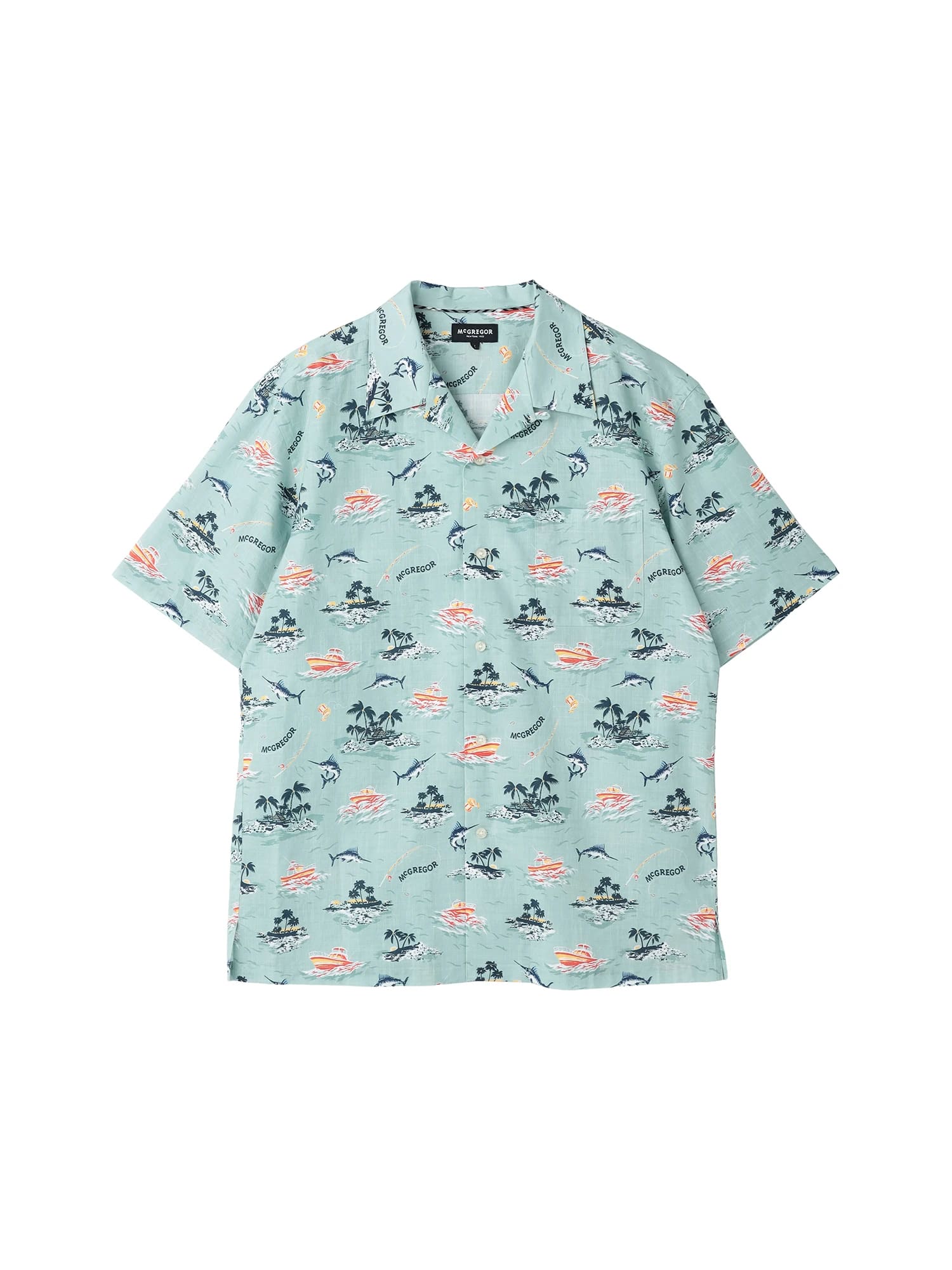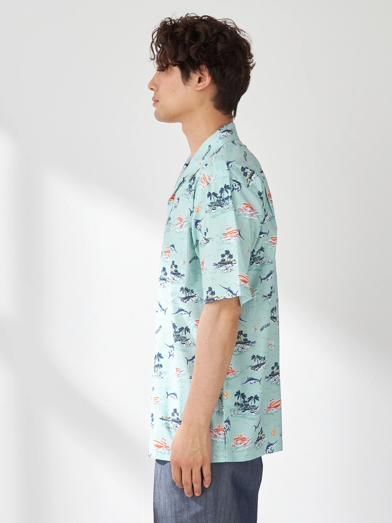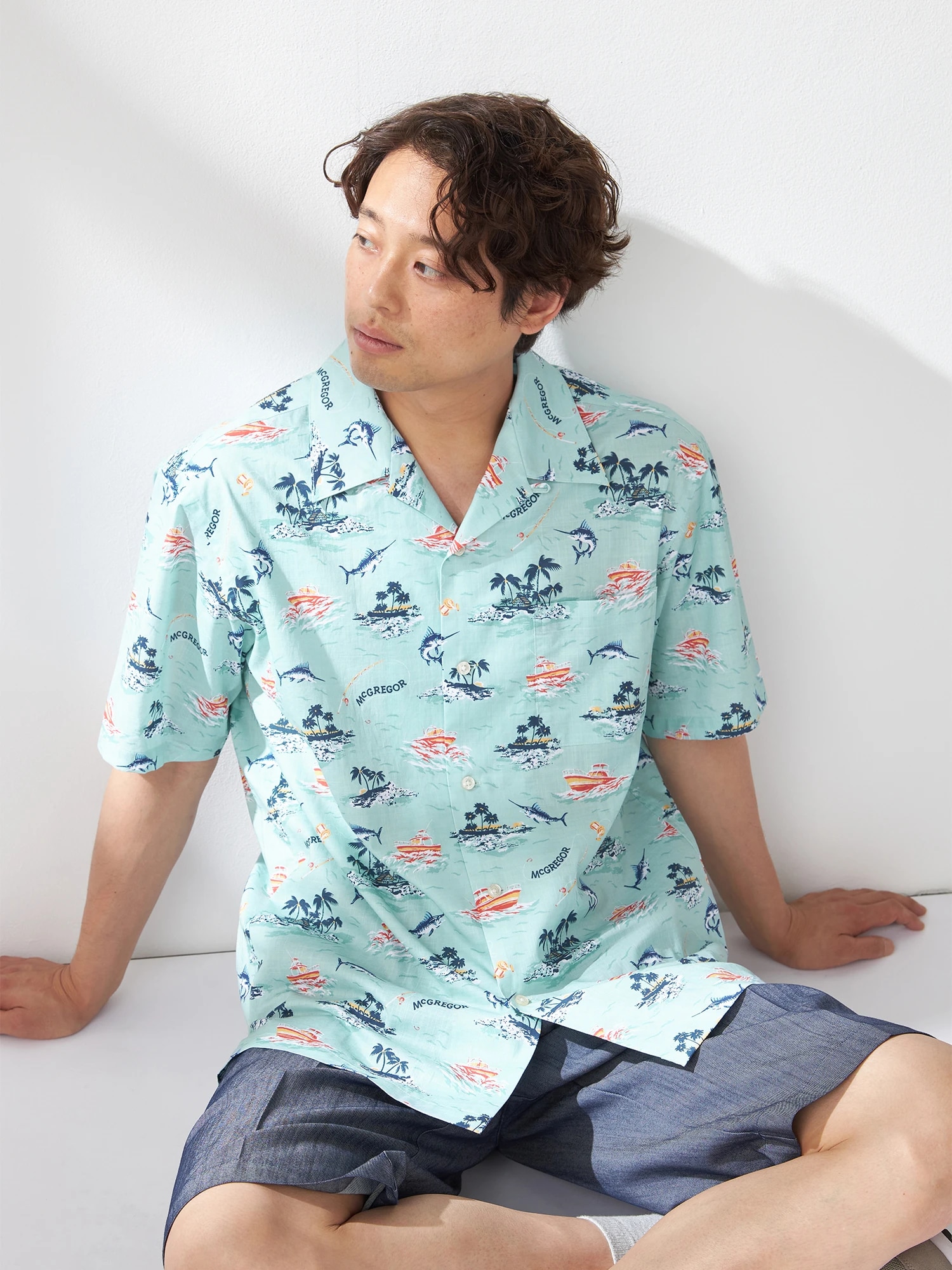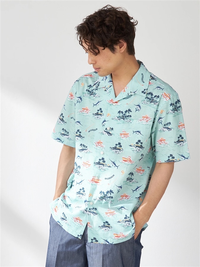 夏の海をダンガリー調のプリントで表現。マリンフィッシングをイメージしたオープンカラーシャツ。(通常のシャツのサイズよりも若干ゆったりとしたサイズ感:着丈+1cm、巾で+2cm)