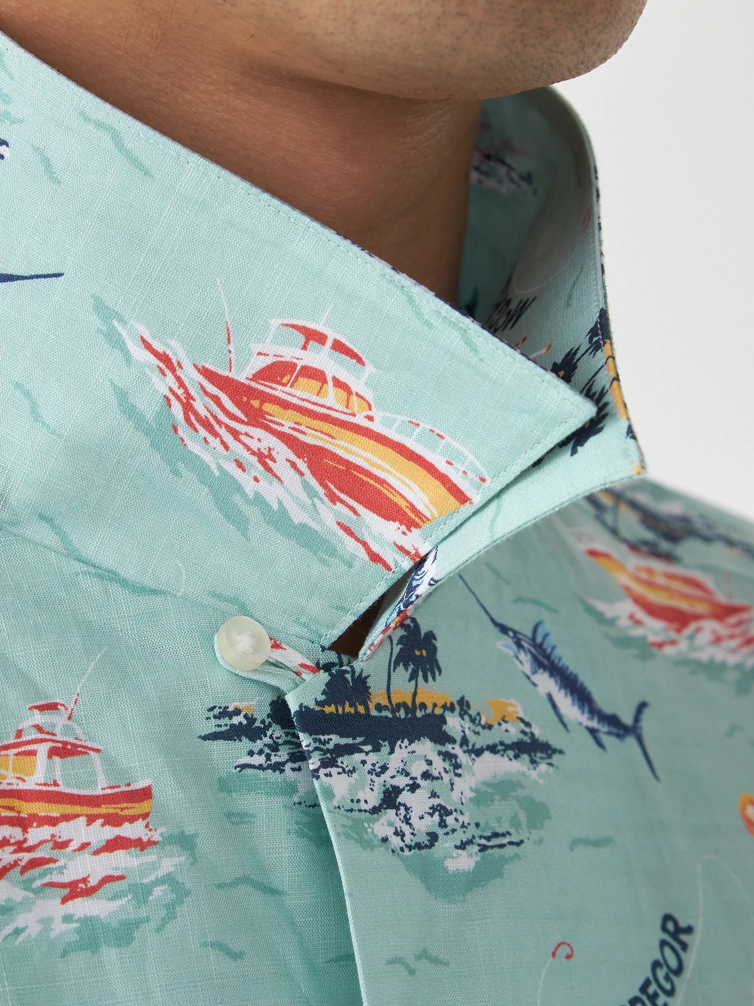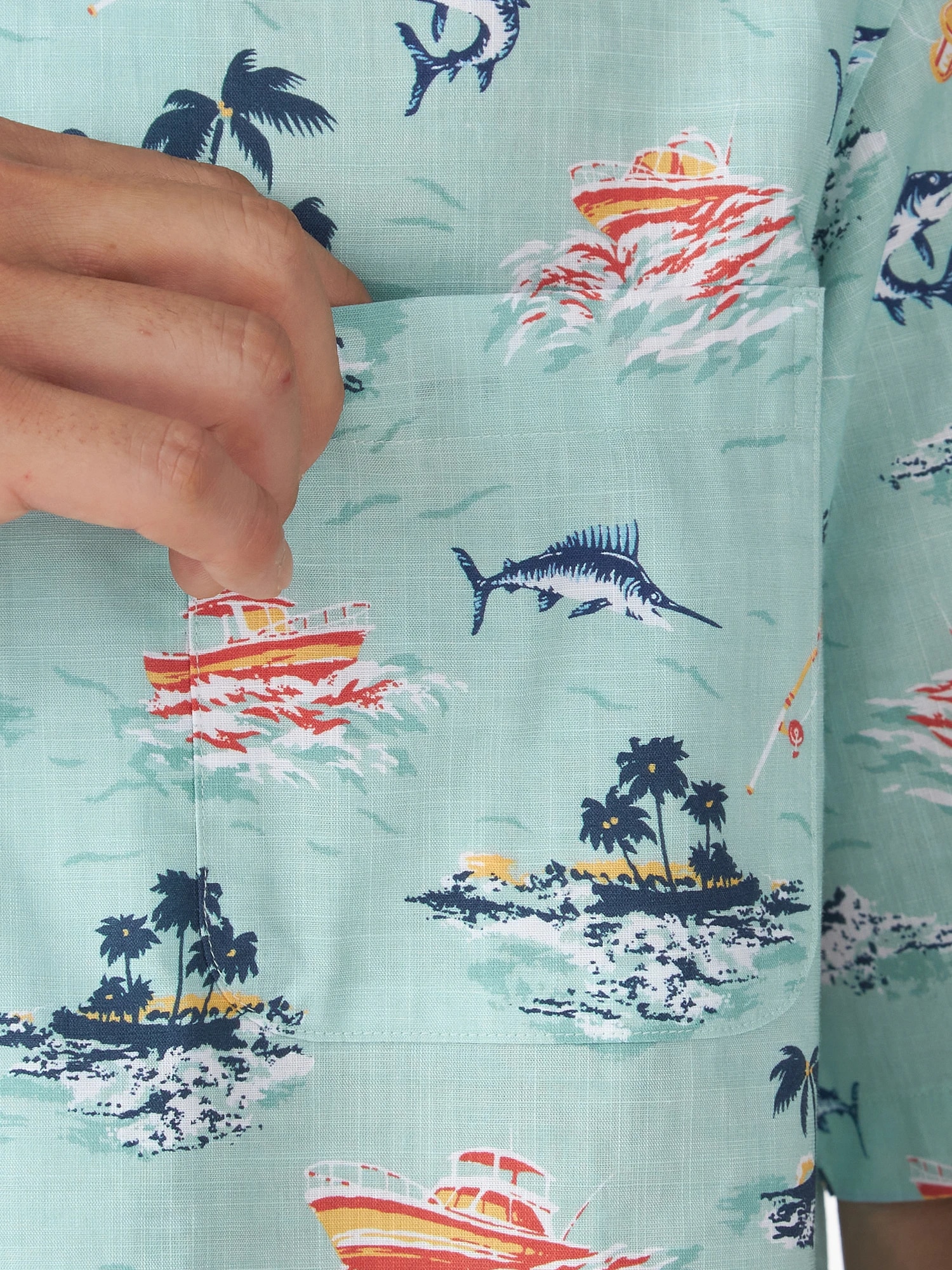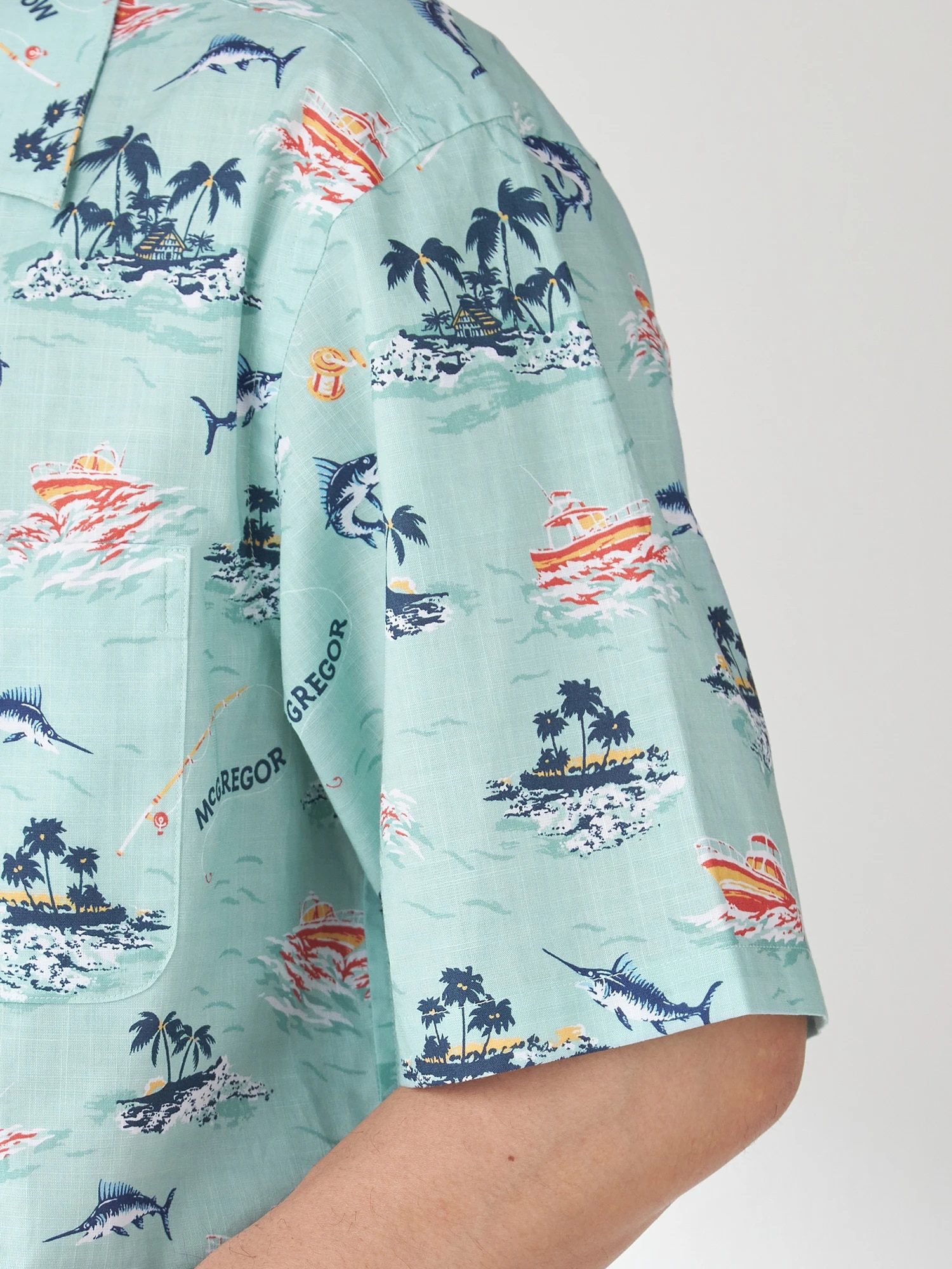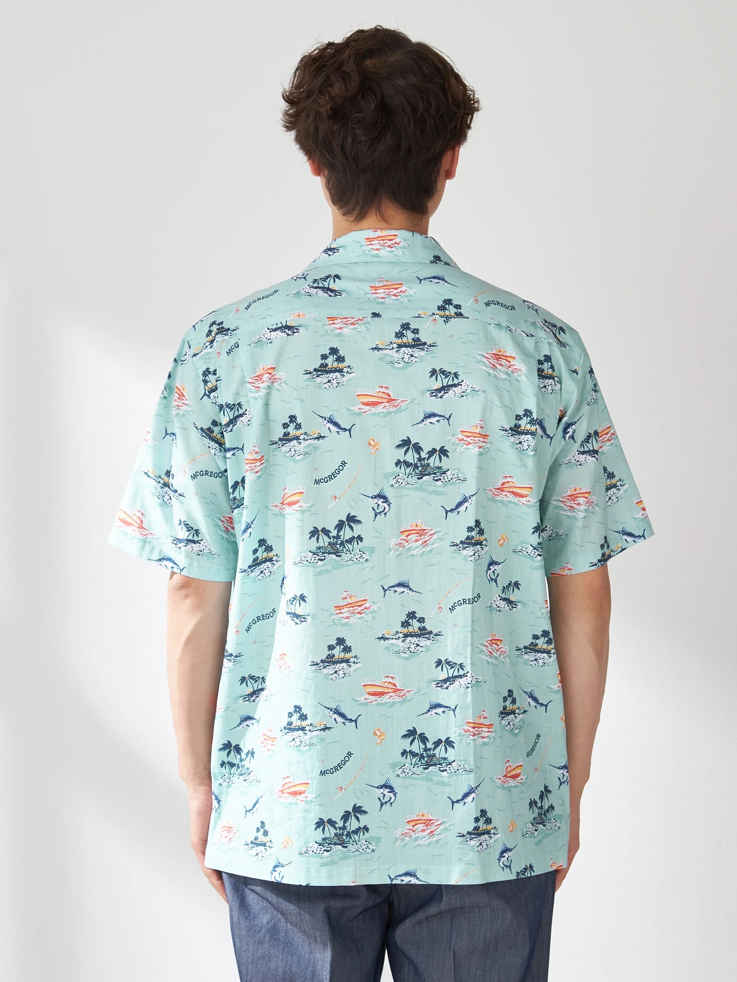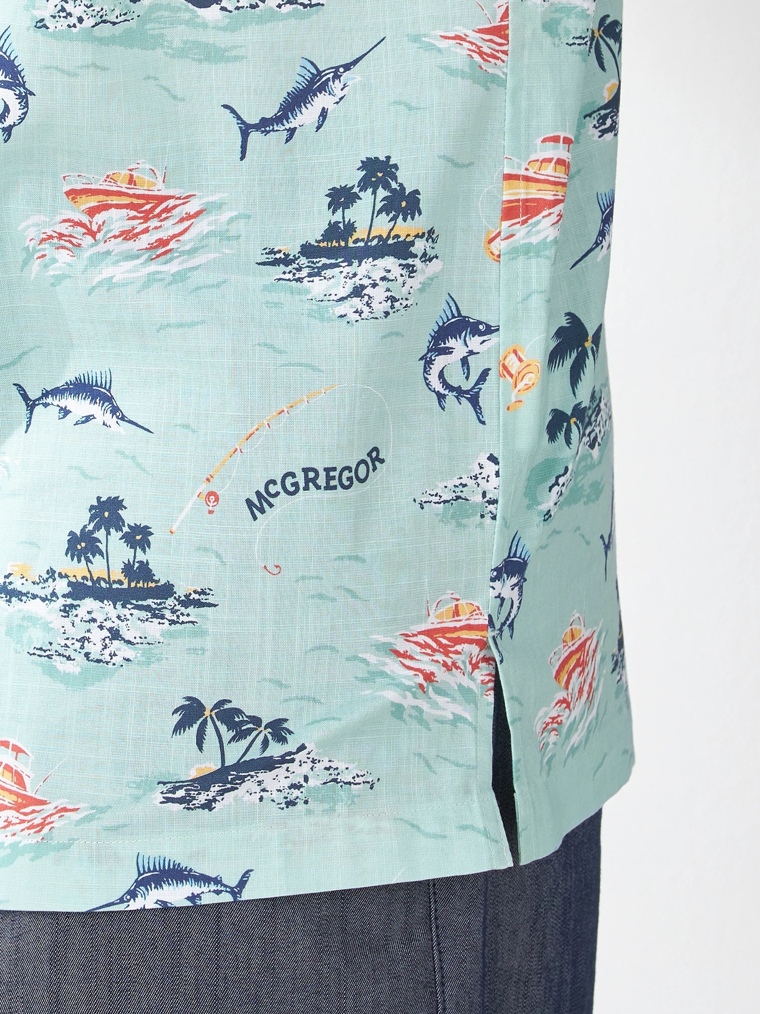 夏の海をダンガリー調のプリントで表現。マリンフィッシングをイメージしたオープンカラーシャツ。(通常のシャツのサイズよりも若干ゆったりとしたサイズ感:着丈+1cm、巾で+2cm)