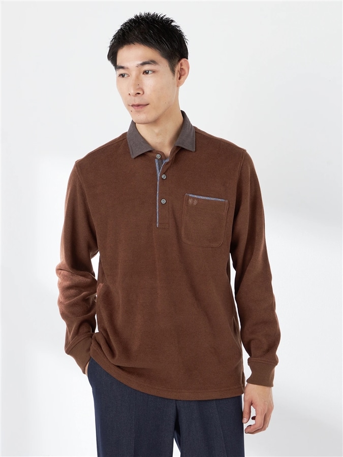 ソフトで滑らか。肌触りの良い上品ポロシャツ。■デザイン襟に使用した杢使いの起毛チェックが見た目にも暖かです。配色感をおさえた大人っぽい仕上がりのポロシャツです。■素材好評いただいているアクリル混スムース素材。温かみがあり滑らかな風合いが魅力です。■コーディネート一枚で着るのはもちろんの事、カジュアルアウターだけでなく、ジャケブルやコートのインナーにもおすすめの一枚です。