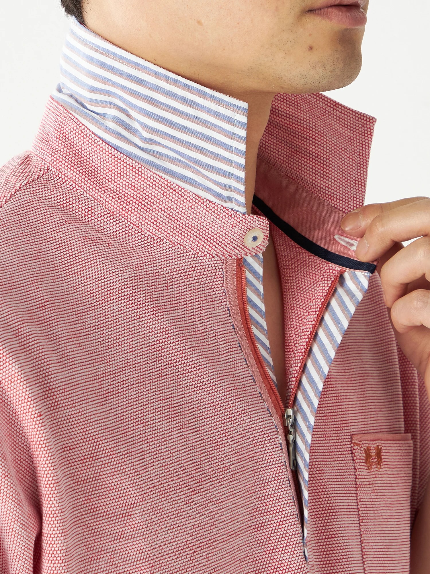 ■デザイン 襟裏や袖裏に配したシャツ生地はさり気ない拘りを感じさせるポイント。ポケット口や裾スリットのカン止めにも色糸を使用しデザインポイントに。