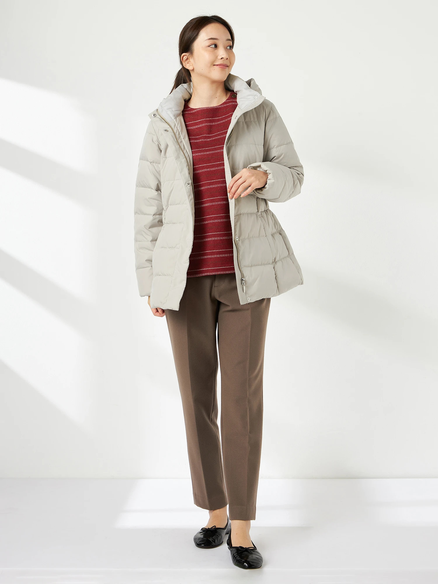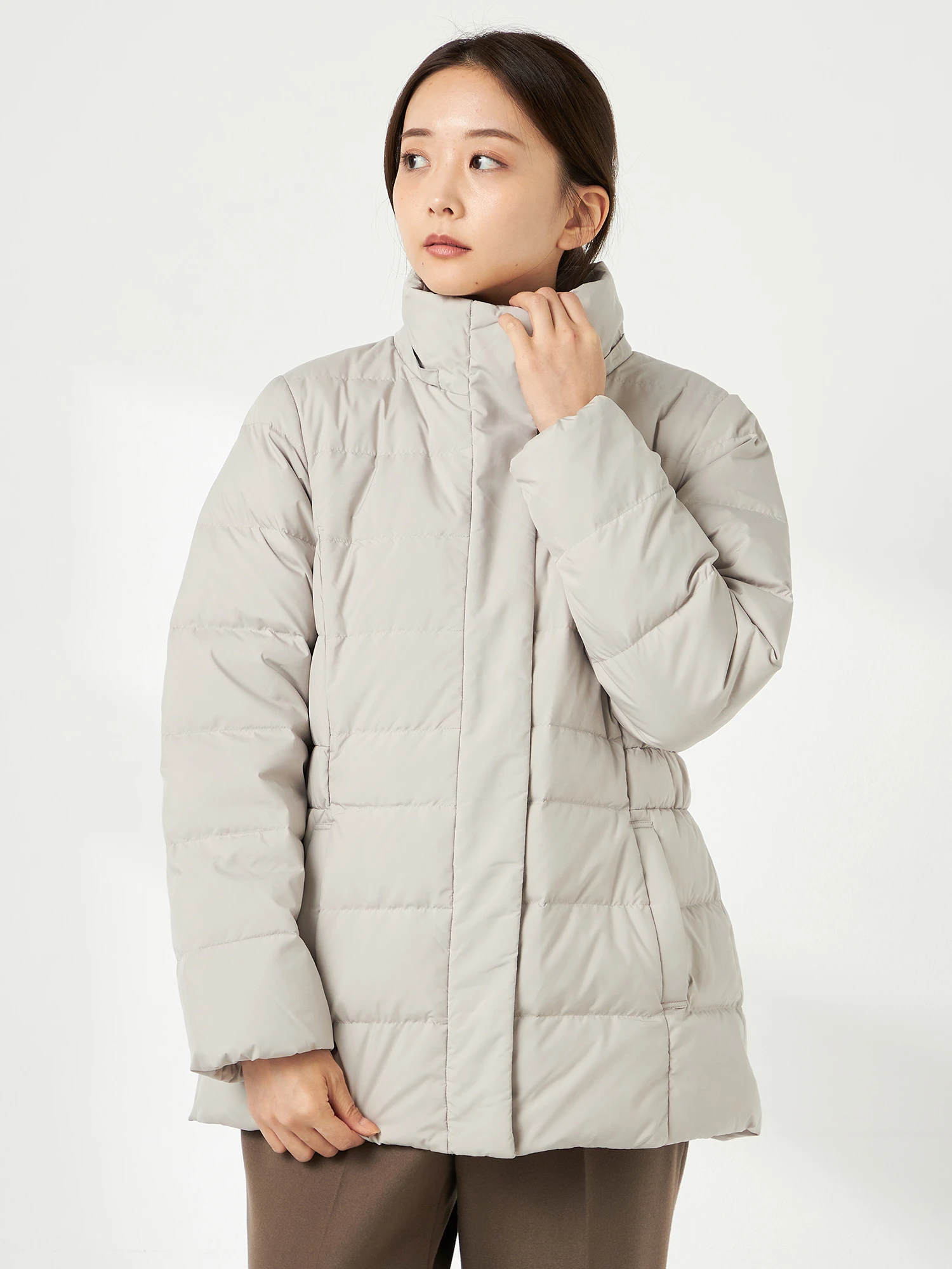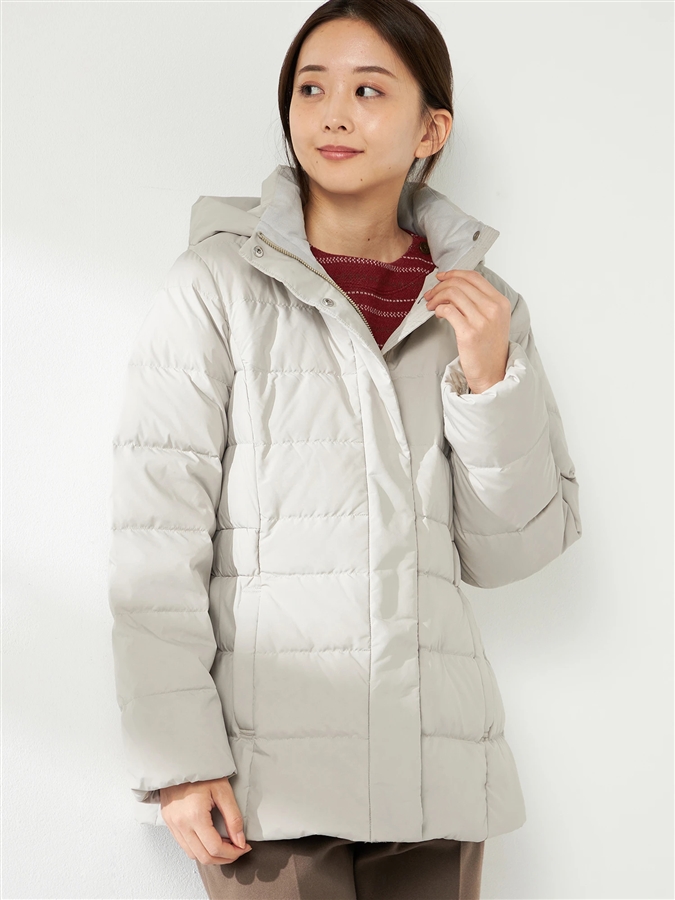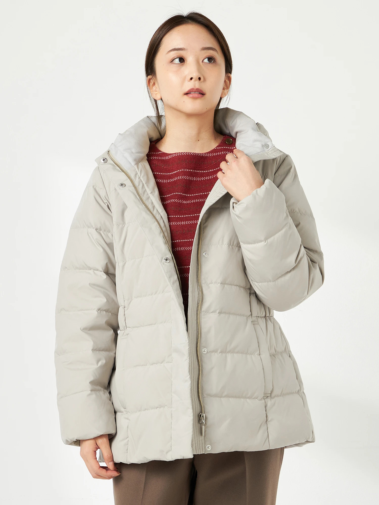 【撥水加工】ショートレングススポーティダウン■デザインウエストにアクセントのあるスポーティな印象のダウンです。フード脱着可能な2way仕様です。■素材しなやかで上品なマット感のあるポリエステル素材で、撥水効果を施しています。■コーディネート女性らしさも保ちながら、羽織るだけで軽快な印象を与えます。スポーティながらも大人きれい目アクティブスタイルもお楽しみいただける一着です。