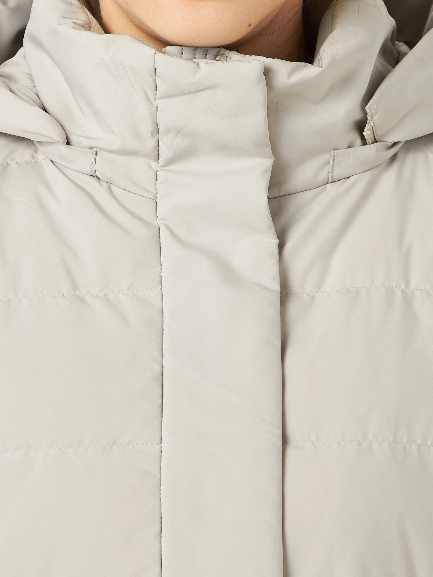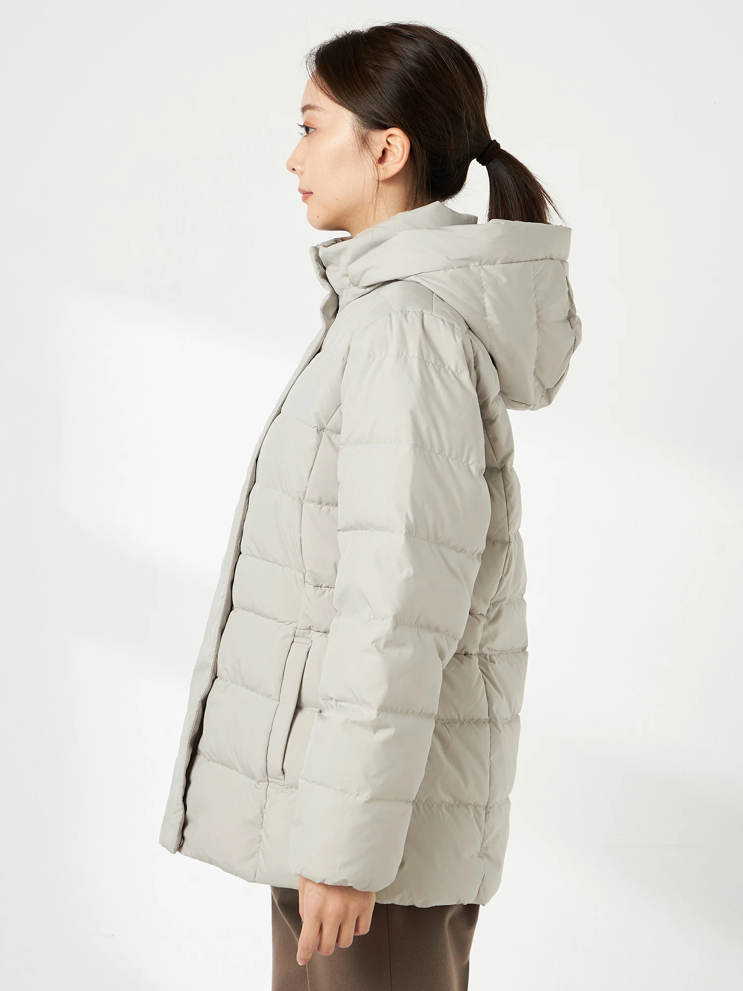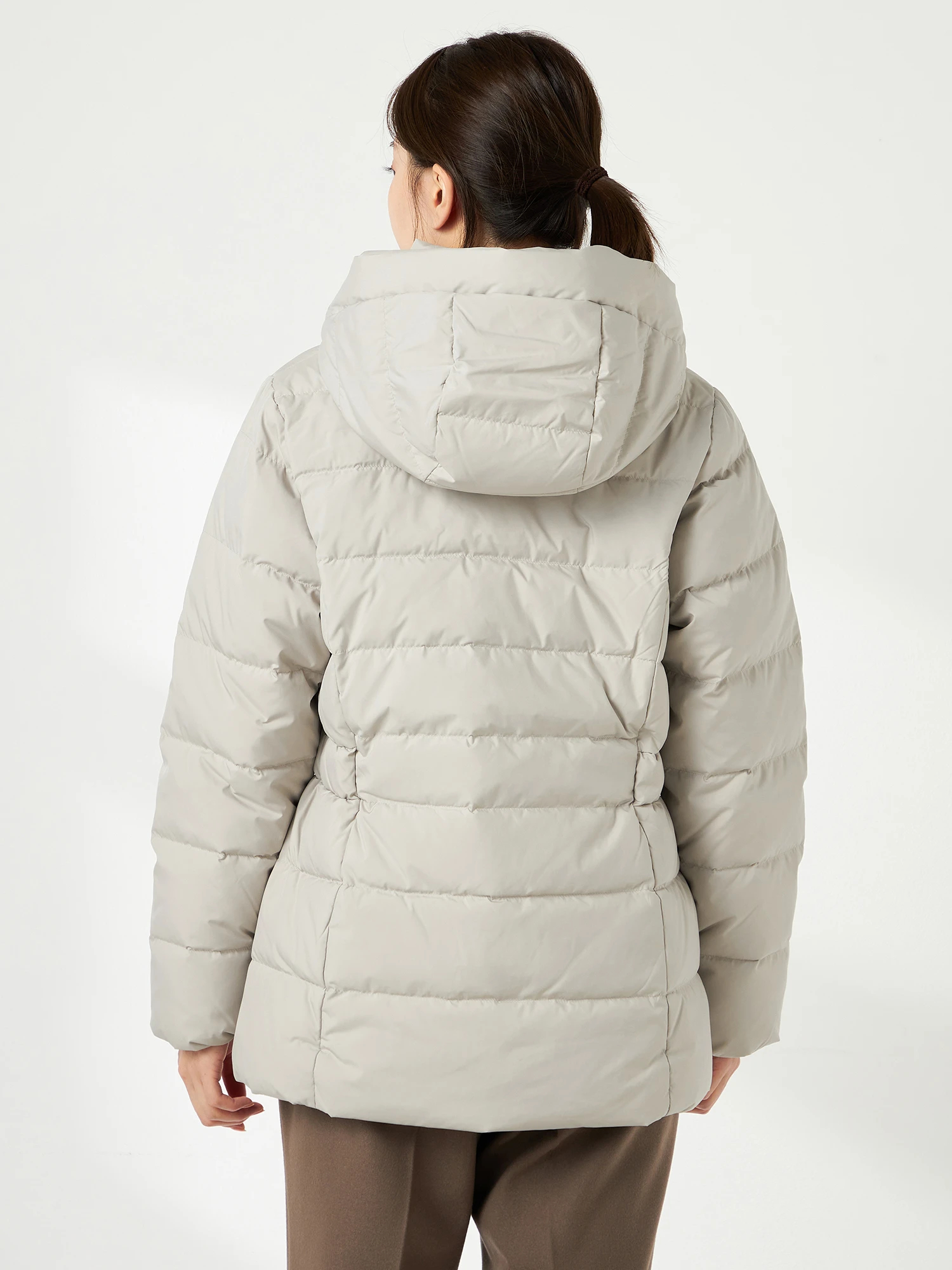 【撥水加工】ショートレングススポーティダウン■デザインウエストにアクセントのあるスポーティな印象のダウンです。フード脱着可能な2way仕様です。■素材しなやかで上品なマット感のあるポリエステル素材で、撥水効果を施しています。■コーディネート女性らしさも保ちながら、羽織るだけで軽快な印象を与えます。スポーティながらも大人きれい目アクティブスタイルもお楽しみいただける一着です。