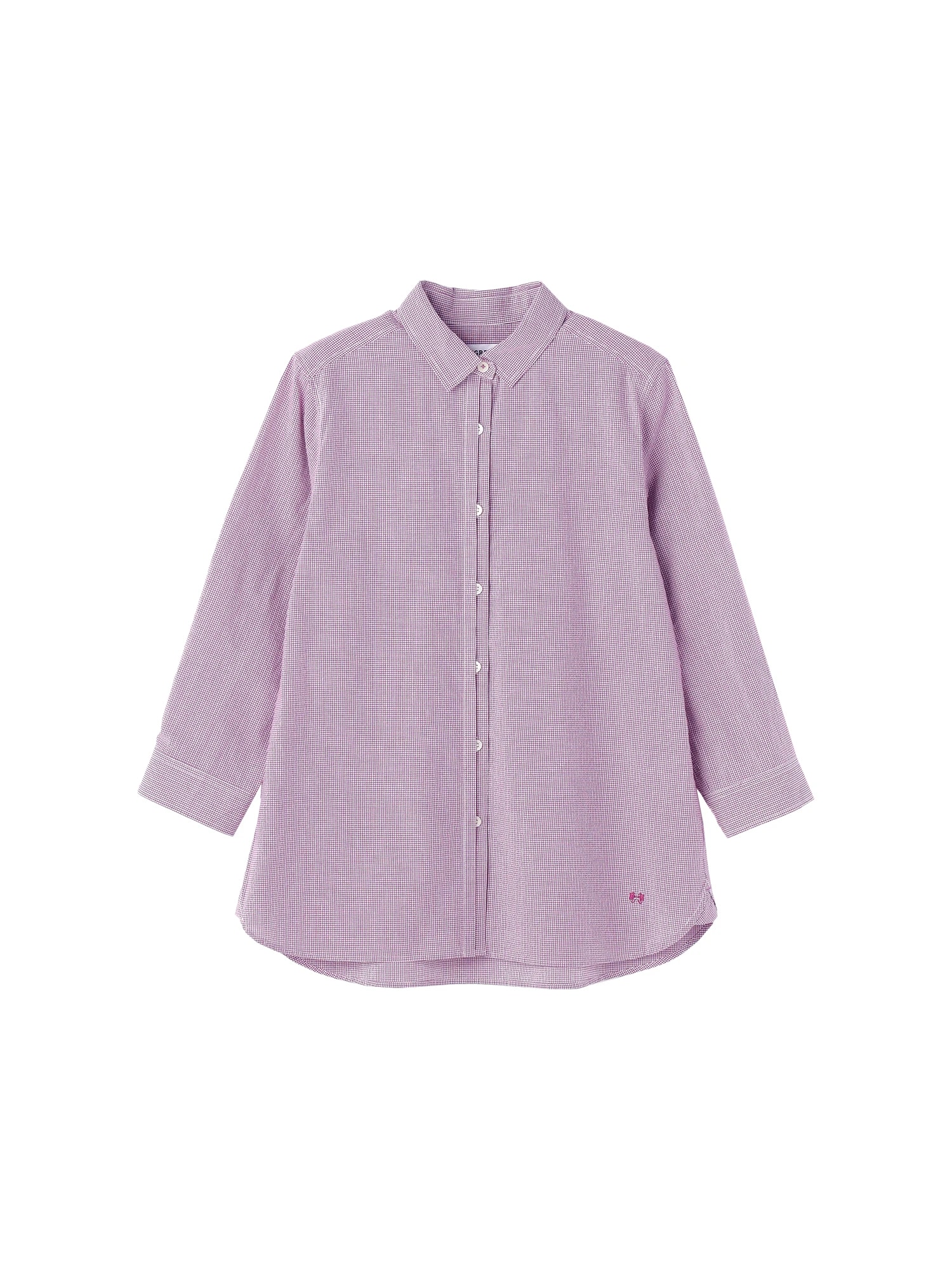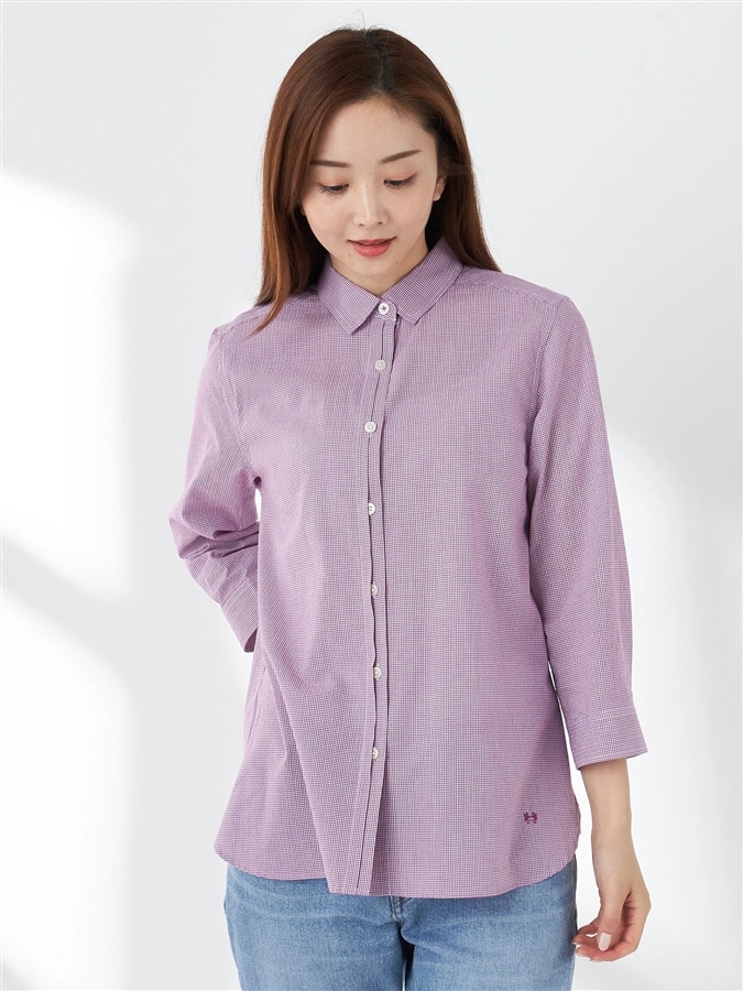 ■デザインシンプルなレギュラーカラーの7分袖チュニックです。前立て部分のボタンが半分隠れるミニタックが上品なデザインポイントです。