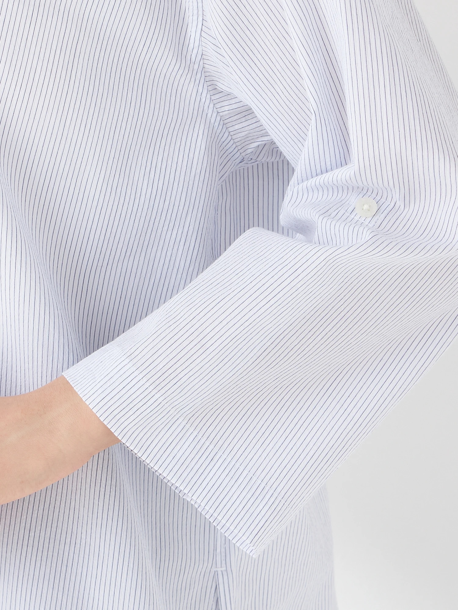■デザインセーラーカラーのように見える襟デザインが新鮮なシャツです。ゆったりした作りの七分袖で、ロールアップタブを利用して5分袖にもアレンジ可能、暑い時期にも重宝するアイテムです。肌寒いときは襟を立てたアレンジも可能です。