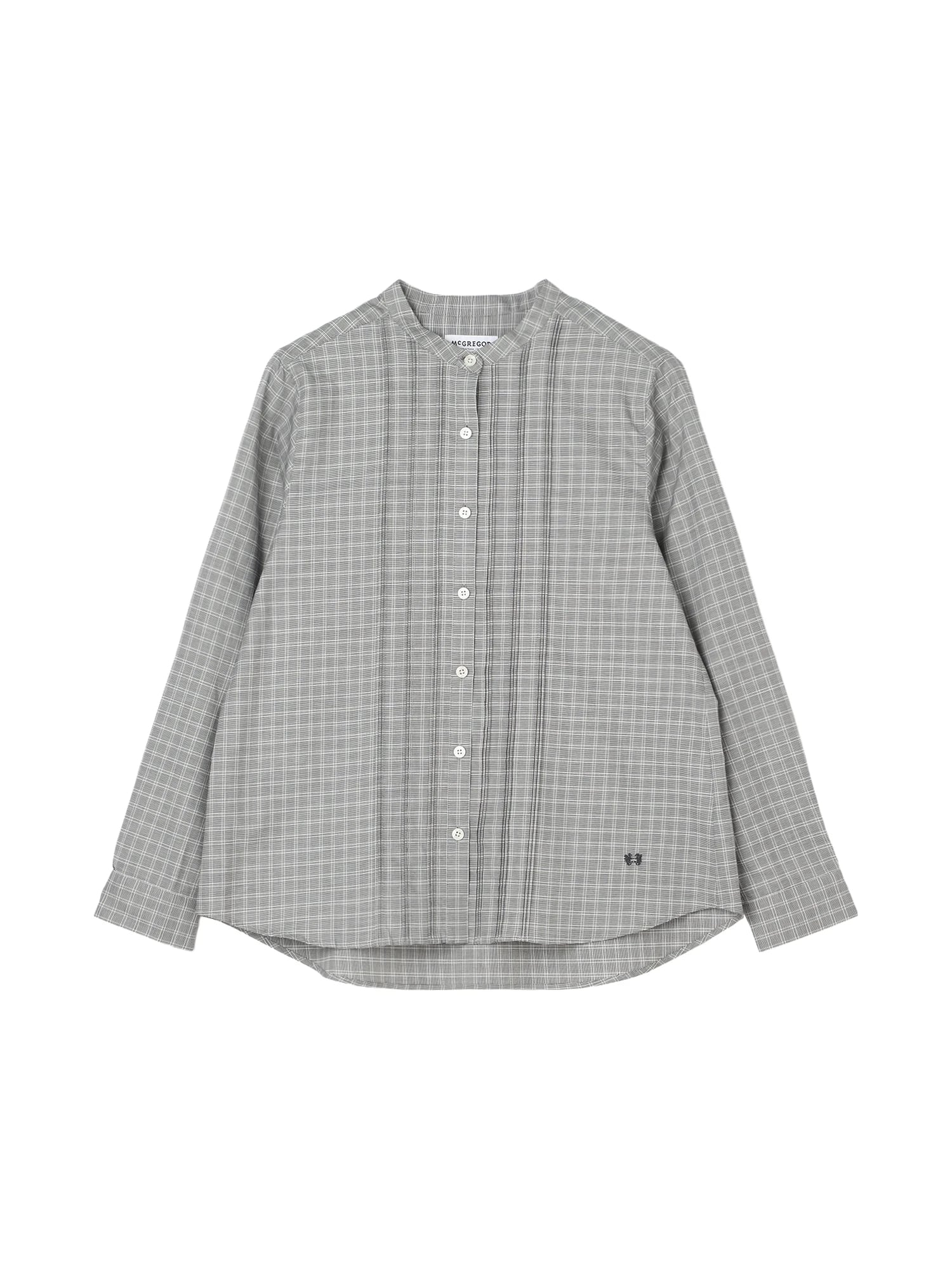 アレンジピンタックのモノトーンバンドカラーシャツ■デザイン裾まで入った繊細なピンタックがデザインポイントで、一枚着としても存在感のあるバンドカラーブラウスです。■素材滑らかな肌触りのコットンツイル素材です。■コーディネート一枚着としてはもちろんですが、フロントピンタックをアクセントに、ニットやカットソーのインナーにも活躍するアイテムです。