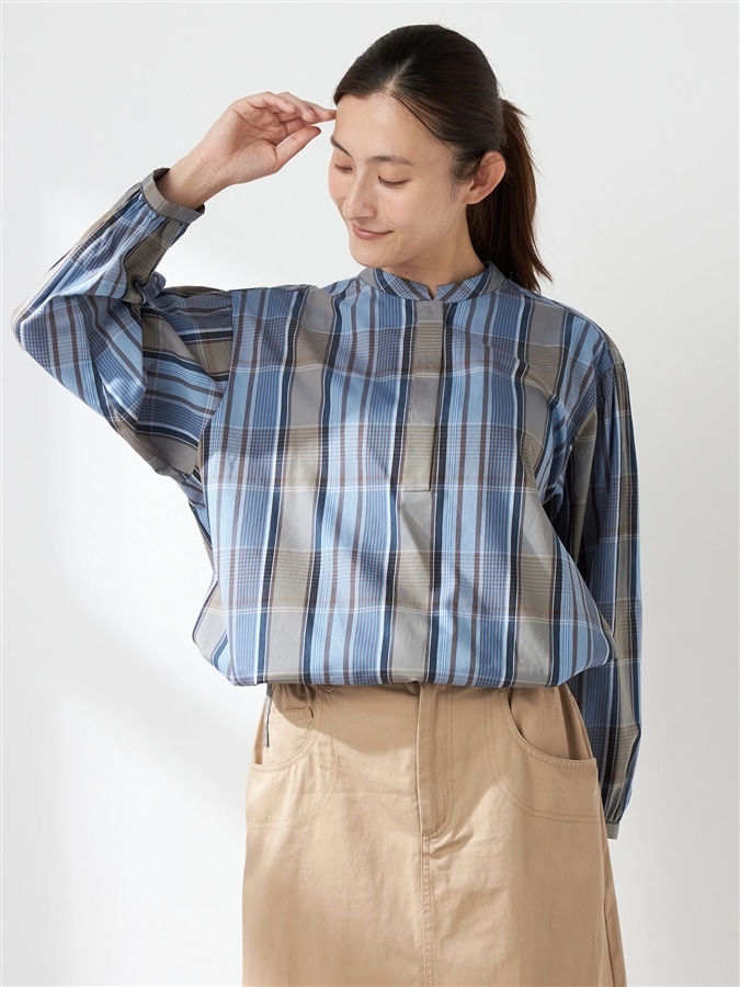 ■素材細番手・高密度のコットンチェック素材は、ハイクオリティでしなやかな肌ざわりが魅力です。マルチカラーが織りなすチェック柄で、秋ムード漂うアイテム。一味違った洗練された印象のプルオーバーブラウスです。