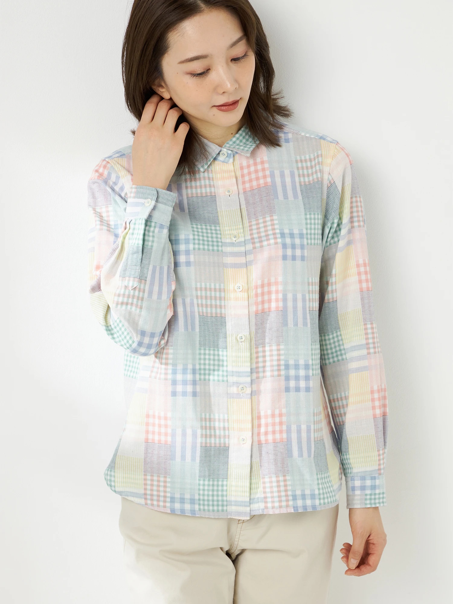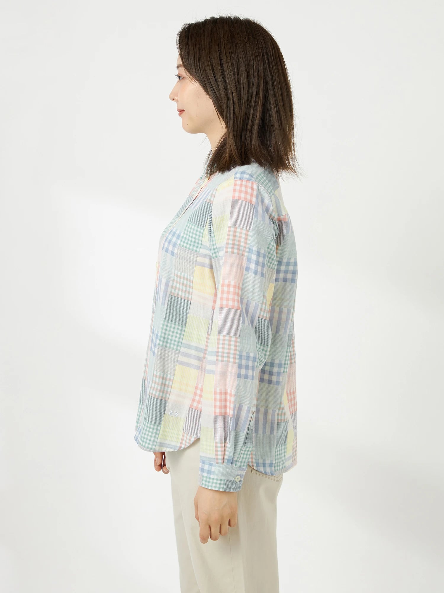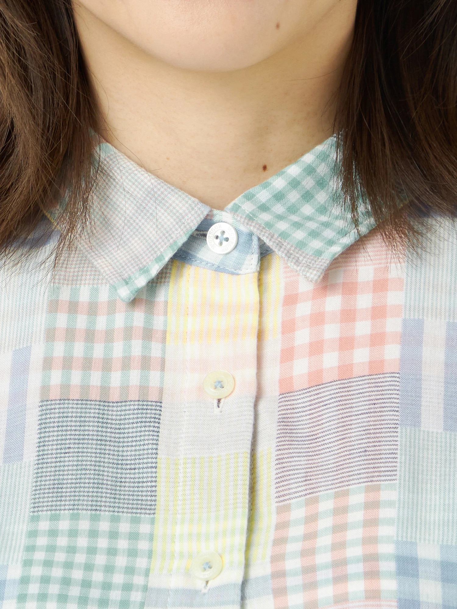 ギンガムチェックをベースにパッチワークしたようなオリジナルチェック柄のダブルガーゼ素材です。ふんわりと空気をはらんだような生地は着心地もよく、綿ポリエステルでシワになりにくい点も魅力です。71カラーのみ、表裏柄違いの小柄チェックでよりベーシックなカラーです。