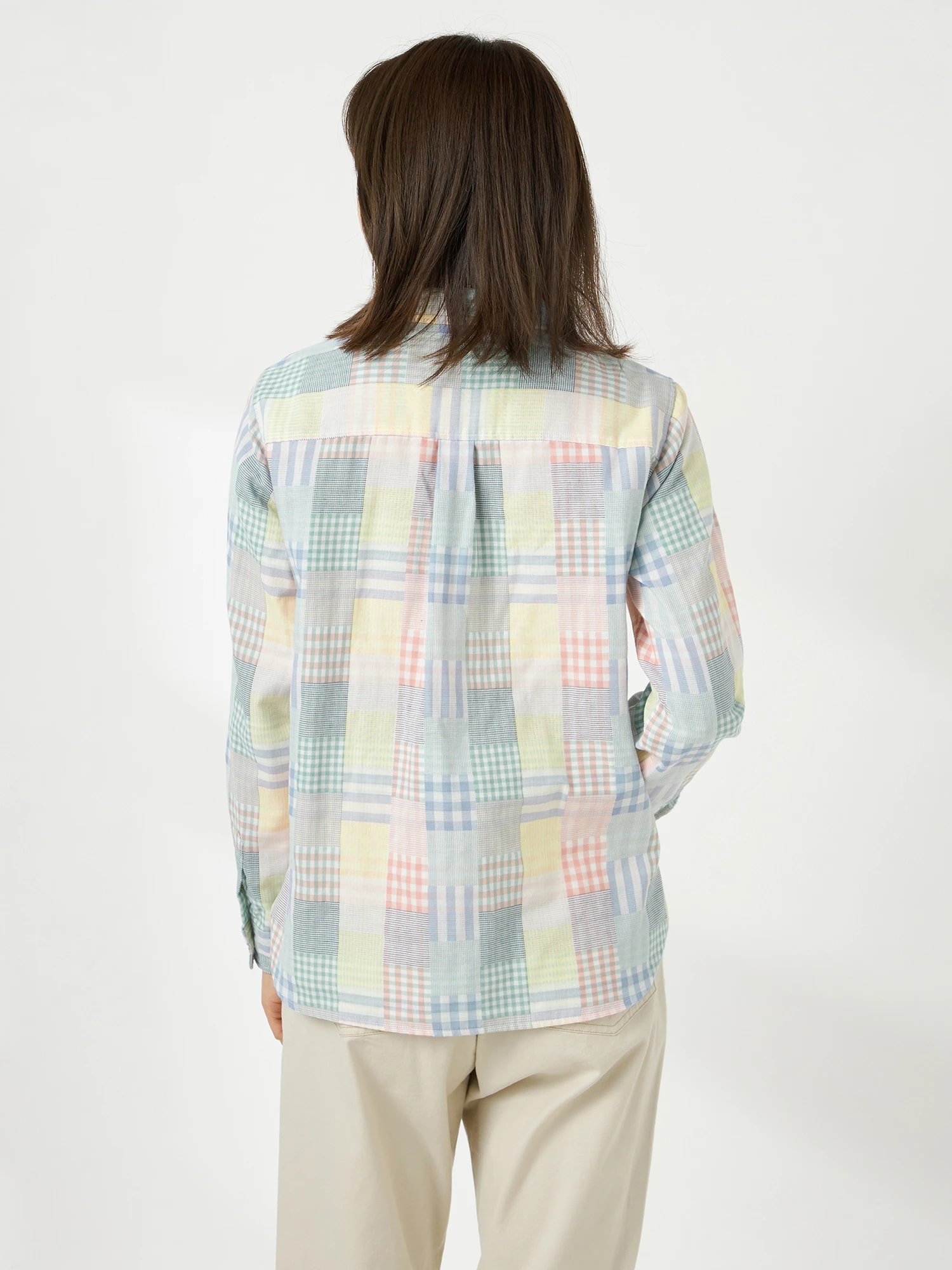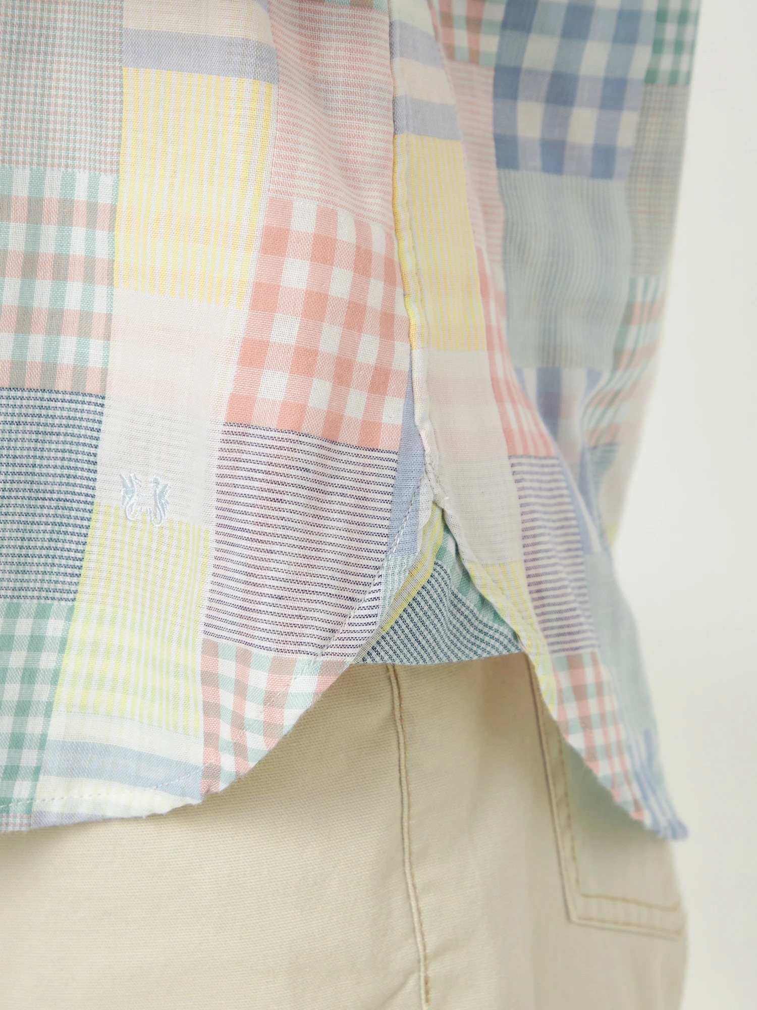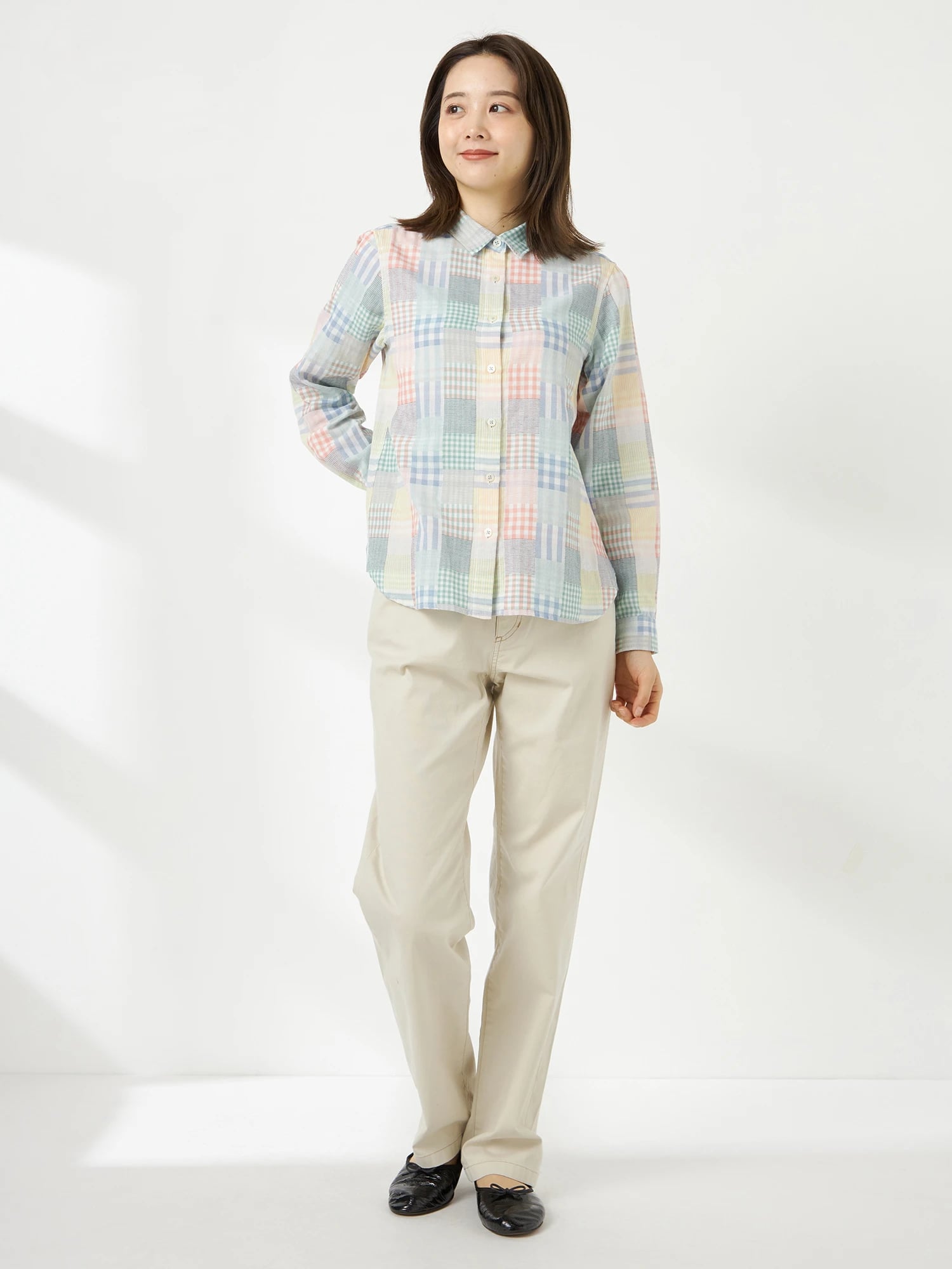ギンガムチェックをベースにパッチワークしたようなオリジナルチェック柄のダブルガーゼ素材です。ふんわりと空気をはらんだような生地は着心地もよく、綿ポリエステルでシワになりにくい点も魅力です。71カラーのみ、表裏柄違いの小柄チェックでよりベーシックなカラーです。