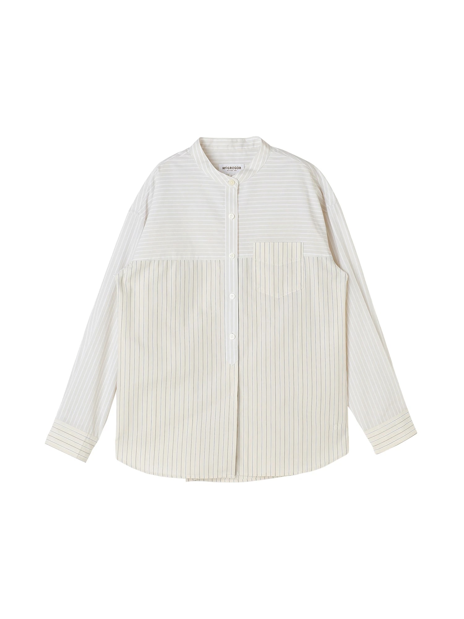 ややゆったりとしたシルエットのバンドカラーシャツです。前後のヨーク・袖・前立てを異なる柄でアレンジしたクレイジーパターンですが、近いトーンの色・柄で組み合わせることで、コーディネートに馴染みすっきりと着用できるアイテムです。