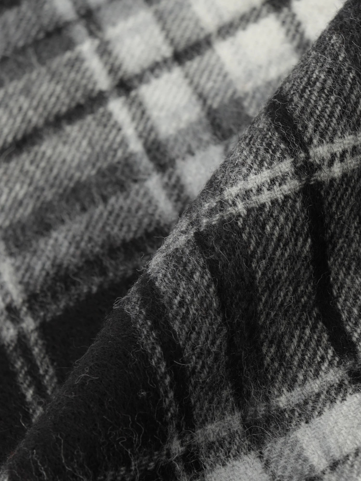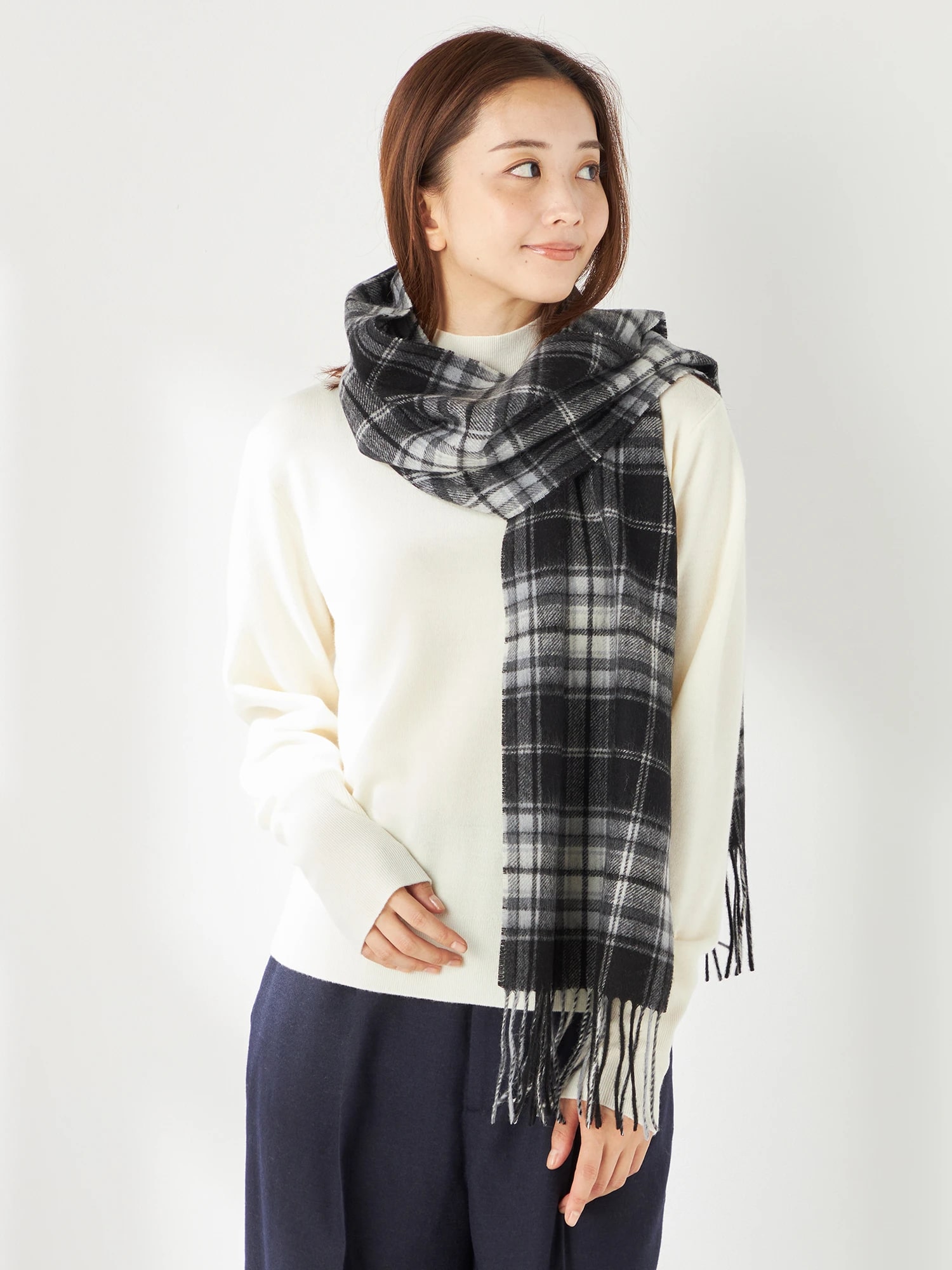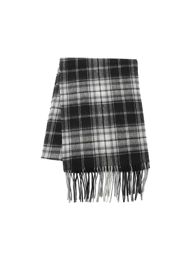 ■デザインブランドオリジナルのチェック柄ストール。オーソドックスなデザインで、首や肩に巻いても。ひざ掛けとしても活躍するサイズ感です。