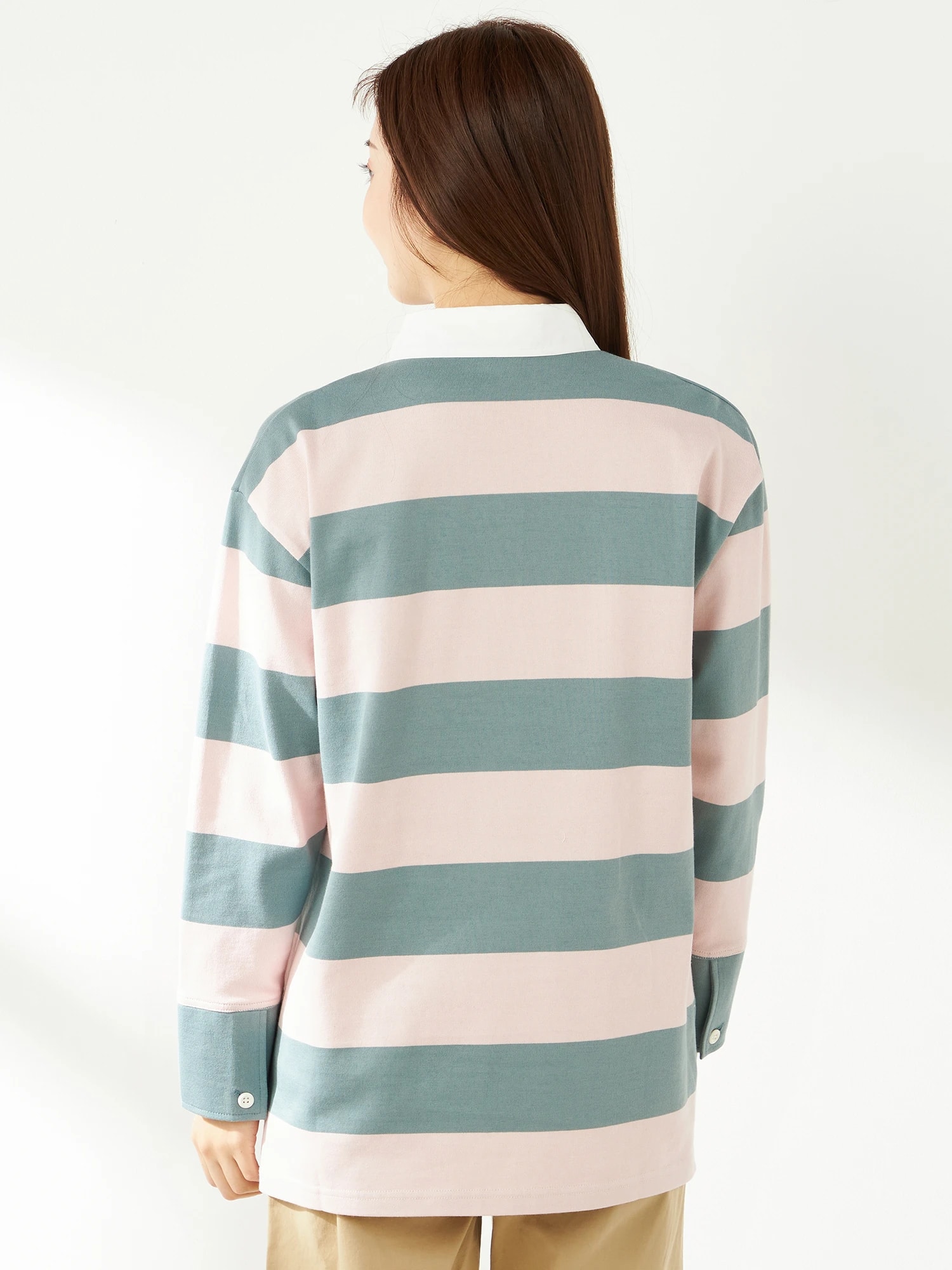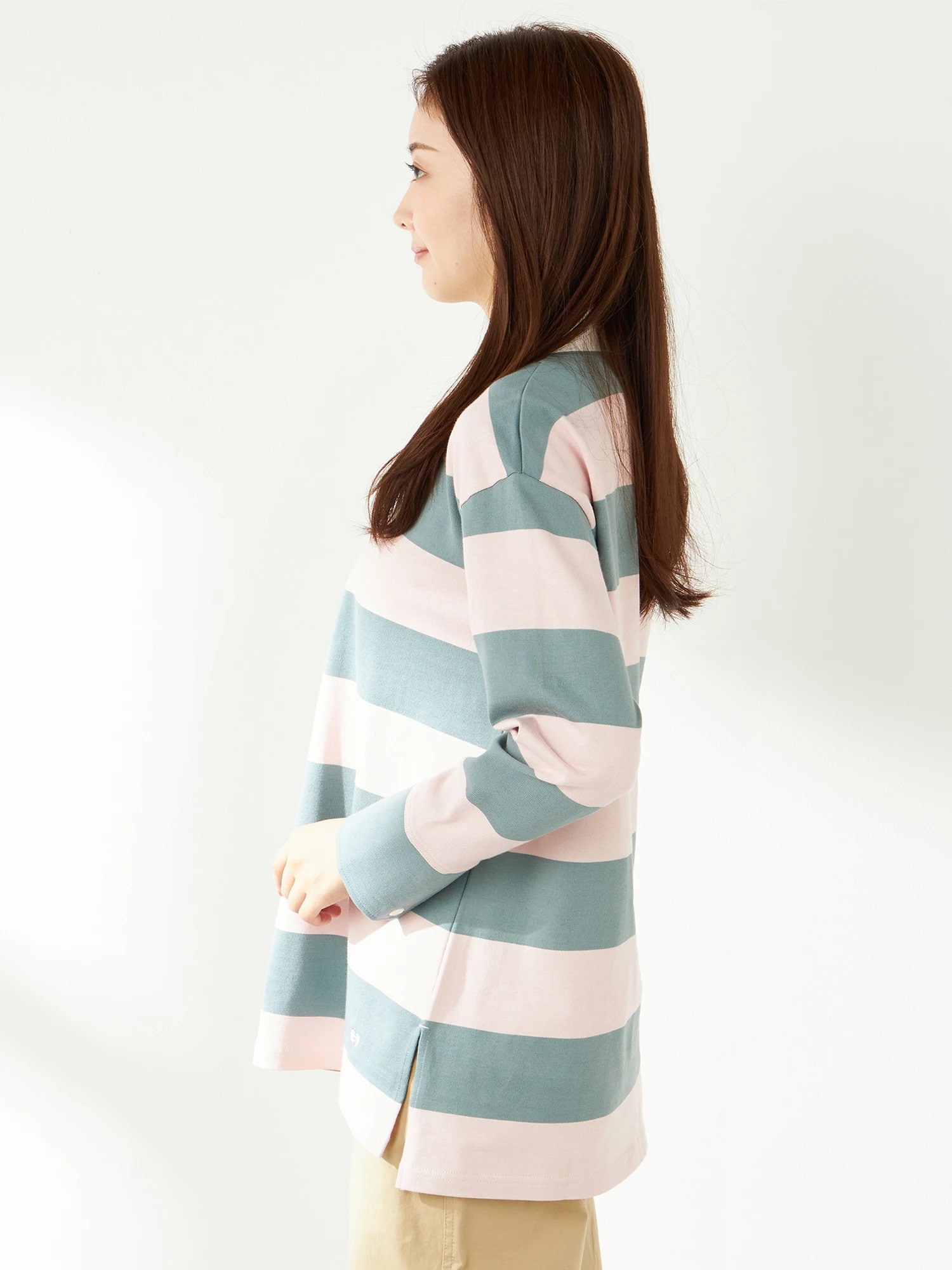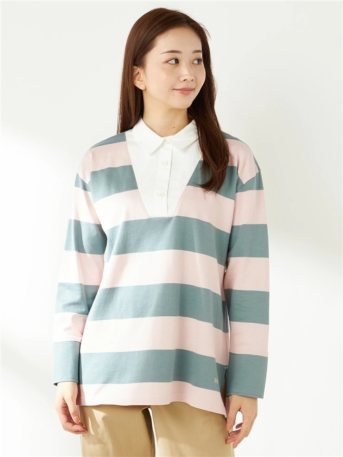 大人の女性にぴったりなラガーシャツ■デザインカジュアルな太ボーダーのカットソーに、シャキッとしたタイプライター素材のヨークと襟をドッキングしたチュニックプルオーバーです。袖口は長めのカフス風デザインで、釦をはずして折り返す着こなしがおすすめです。■素材毛羽の少ない太番手の糸でしっかりと編み上げたコットン100%の天竺ボーダーと、ワッシャータイプライターのドッキングです。洗いざらしでも味があり、雰囲気のあるアイテムです。■コーディネートトップスとして、1枚でコーディネート要らずのアイテムです。ストレートやテーパードなどのパンツ合わせがおすすめです。