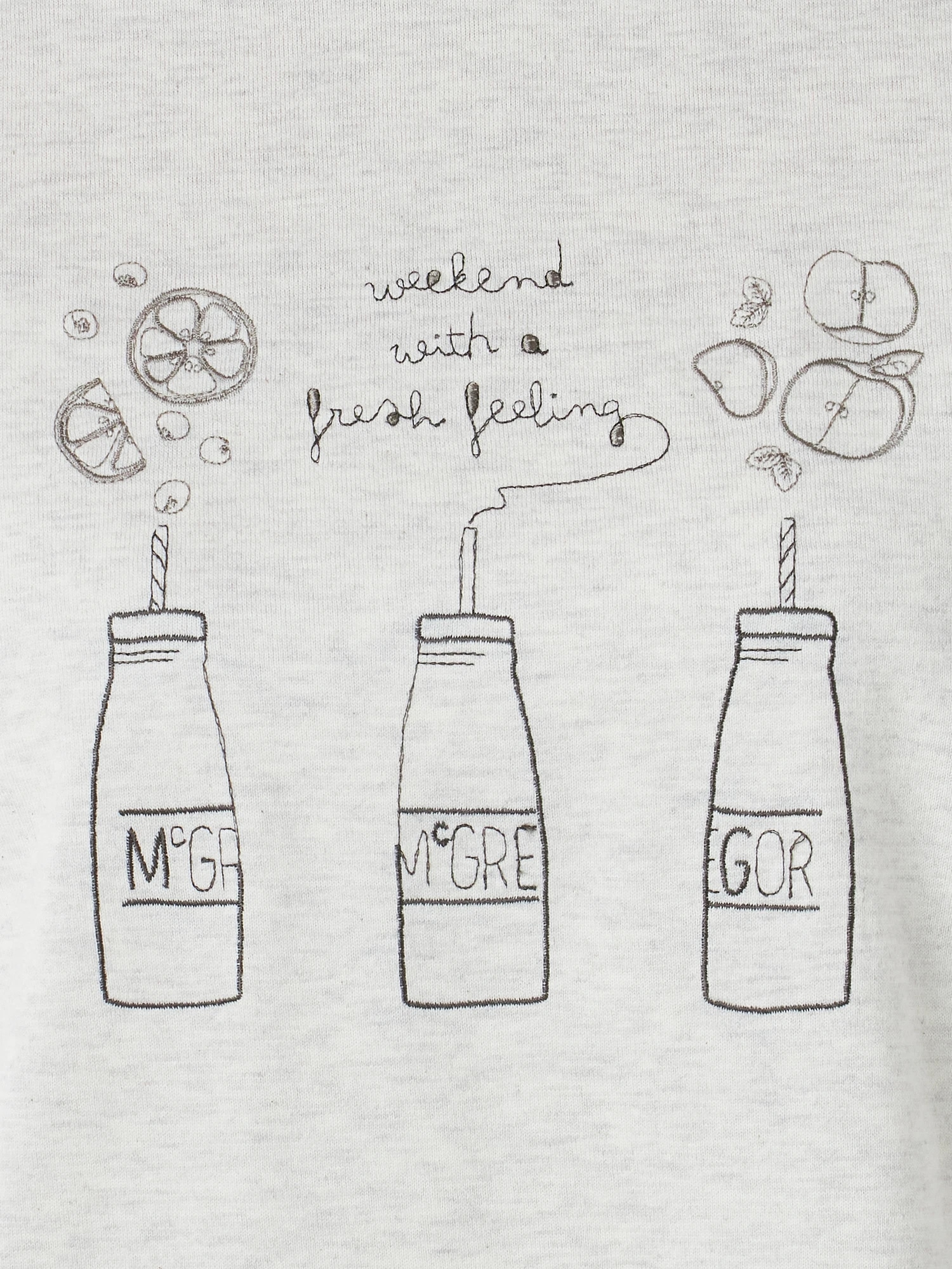 ■デザインスムージーから連想したさまざまなフルーツを手書き風の繊細な刺繍で表現しています。袖口の折り返し、閂配色がさりげないアクセントです。