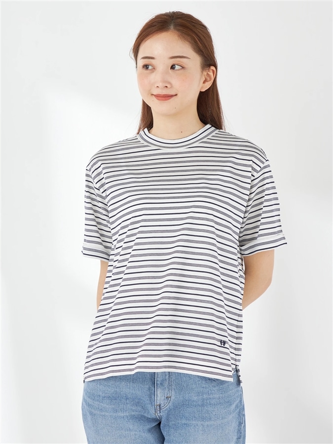 ■素材ガス焼きシルケット糸を使用し毛羽を抑えたなめらかな肌触りのコットン素材です。薄手でありながら光沢感のある上質なカットソーです。接触冷感機能付きで、暑い夏でも快適な着用感です。