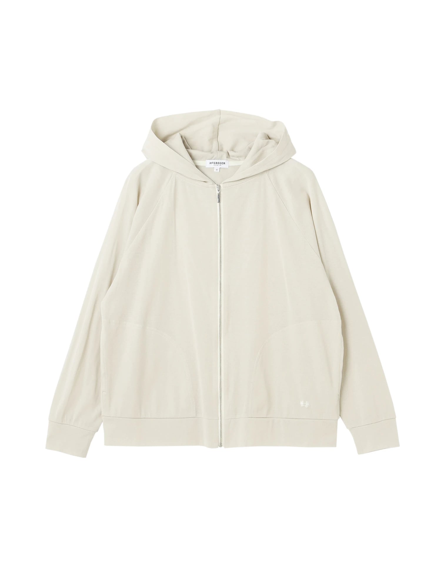 ■デザインシアーな透け感のある前開きフードパーカ。ラグラン切替とポケット周りなどの配色ステッチがポイントです。ほどよいゆとりとレングスで何にでも合わせやすい万能アイテムです。