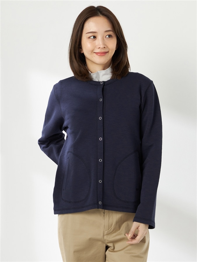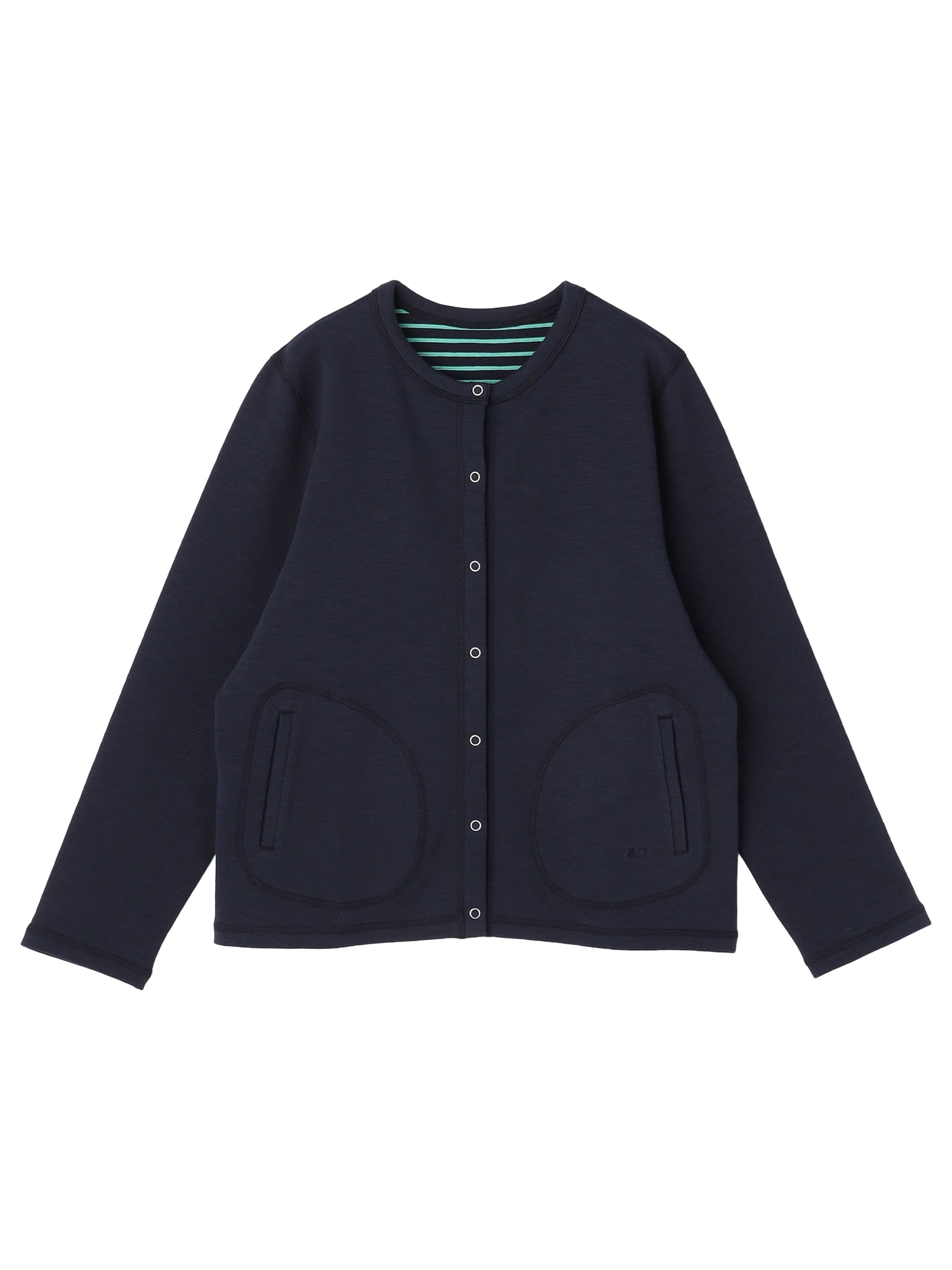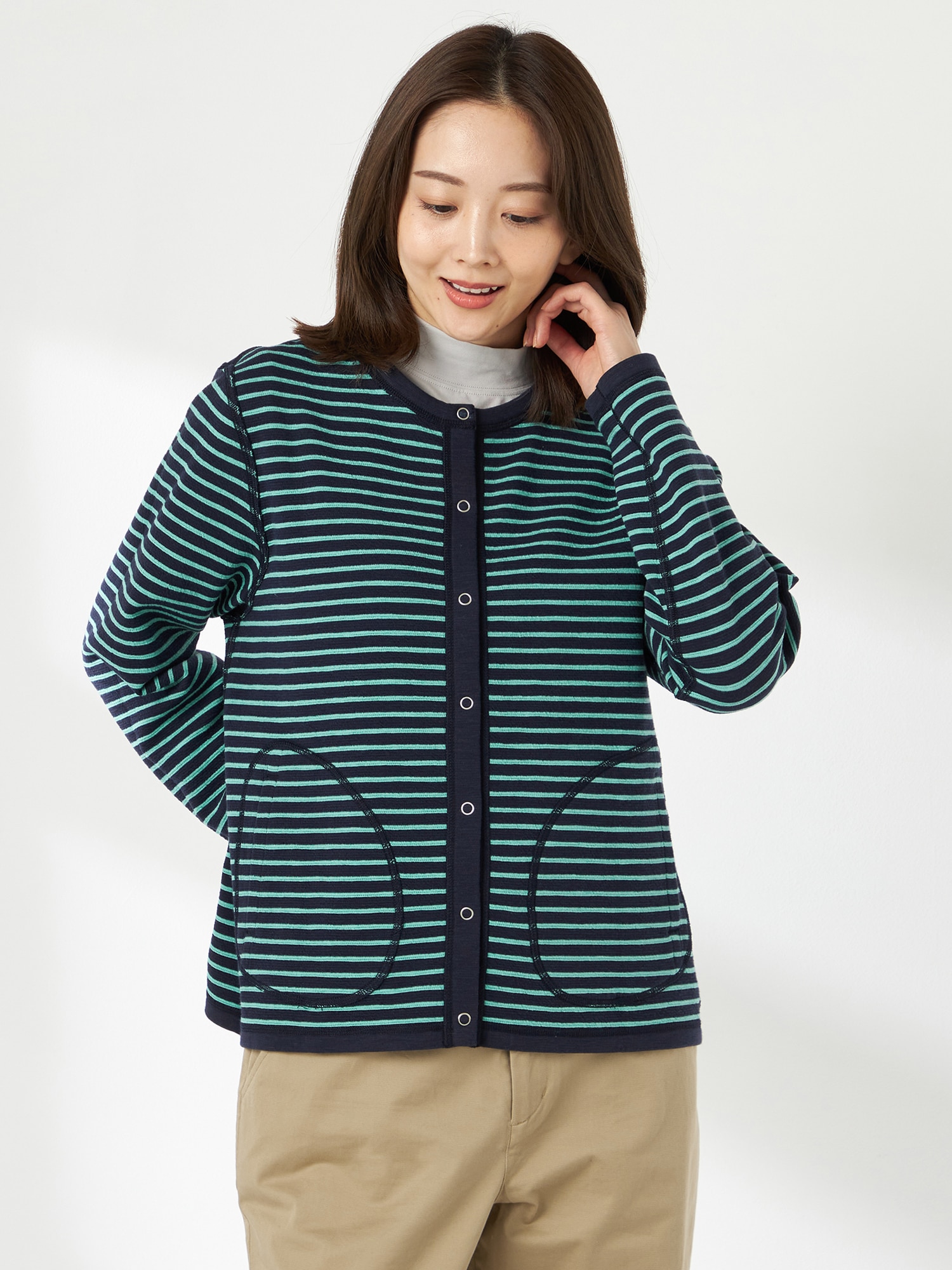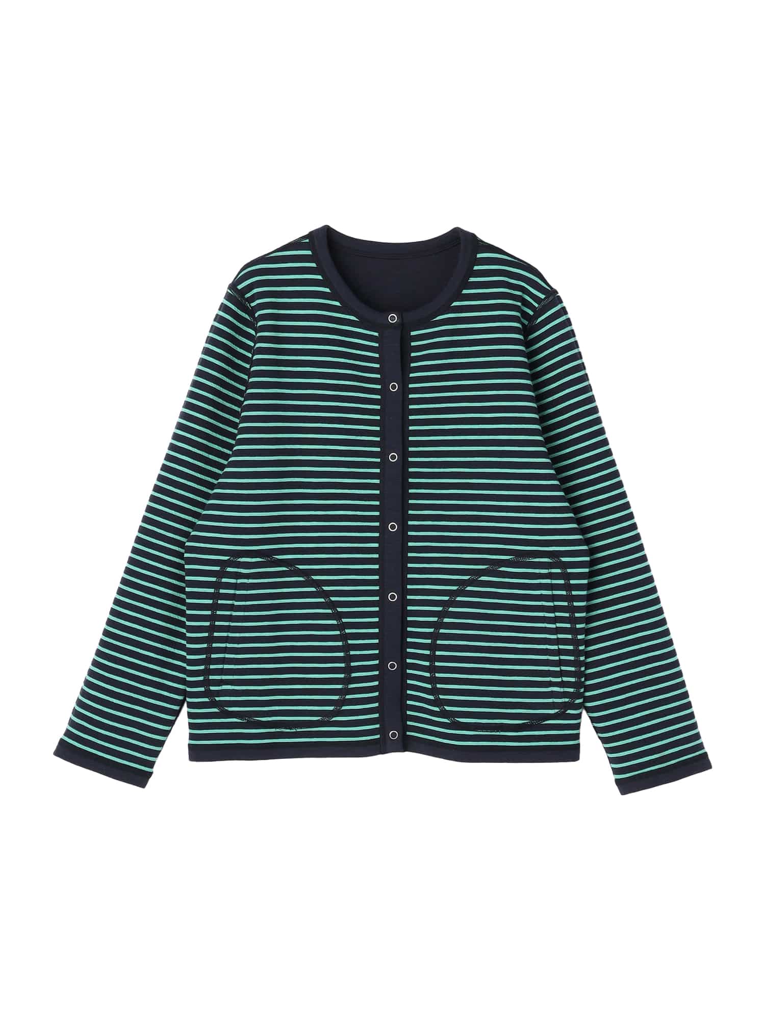 表面が無地、裏面がボーダーのリバーシブルカーディガンです。着回しのきくフロントドットボタンで、ベーシックなデザインです。