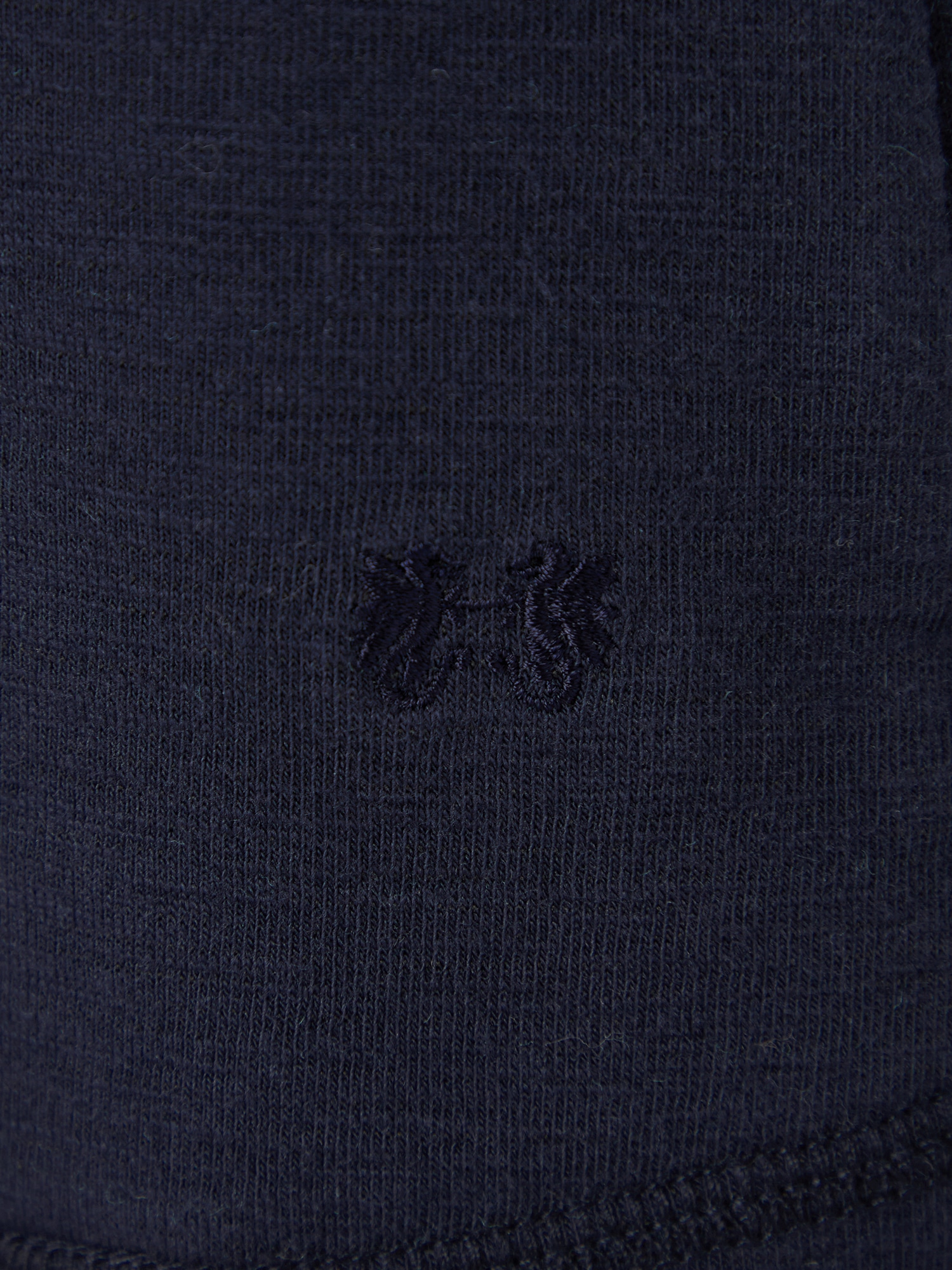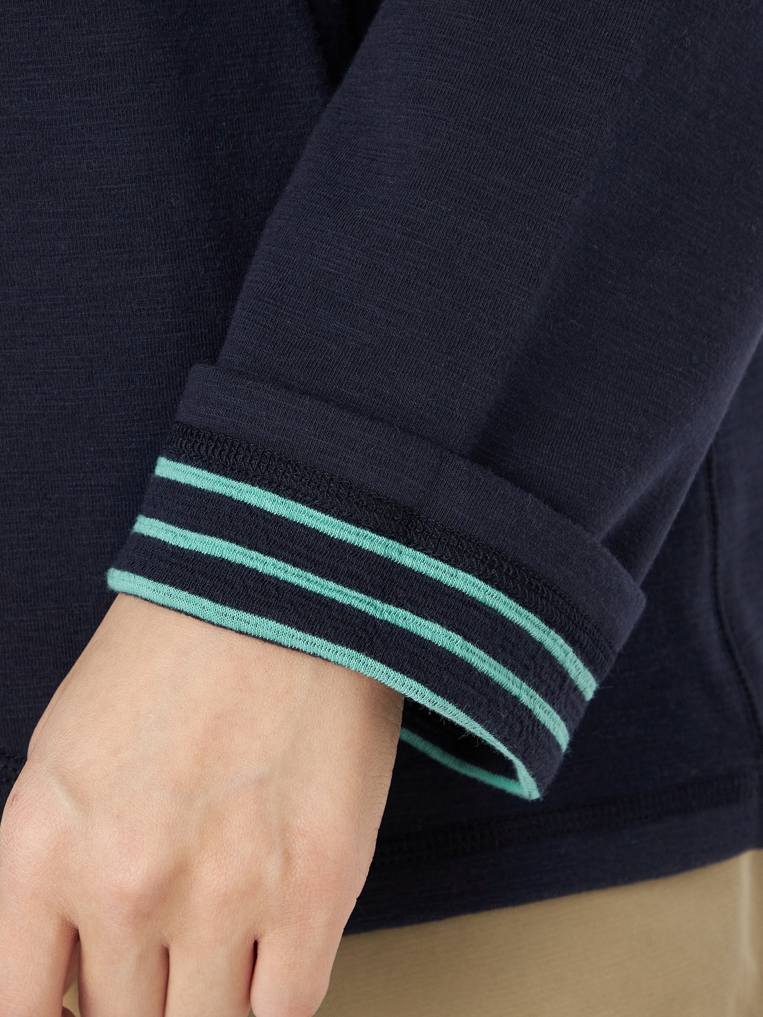 万能なベーシックデザインで、アウターのインナーなどにも便利な一着です。表面は無地でベーシックスタイルに、裏面のボーダーはカジュアルスポーティなスタイルを楽しめます。