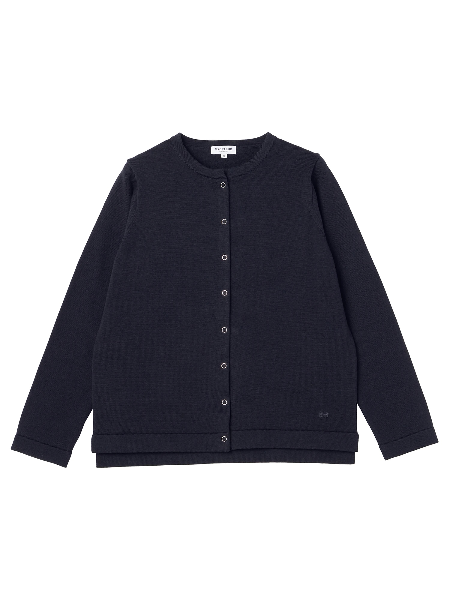 ■デザインベーシックなクルーネックのニットカーディガンです。前立て裏のグログランテープ配色と裾の前後差、ちびスリットがポイントです。
