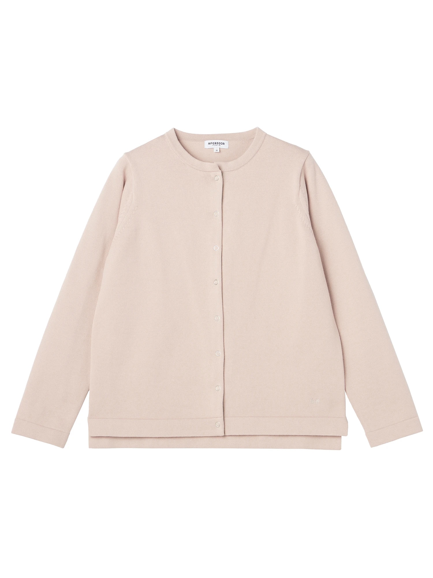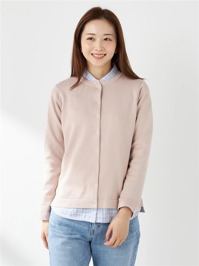 ■デザインベーシックなクルーネックのニットカーディガンです。前立て裏のグログランテープ配色と裾の前後差、ちびスリットがポイントです。