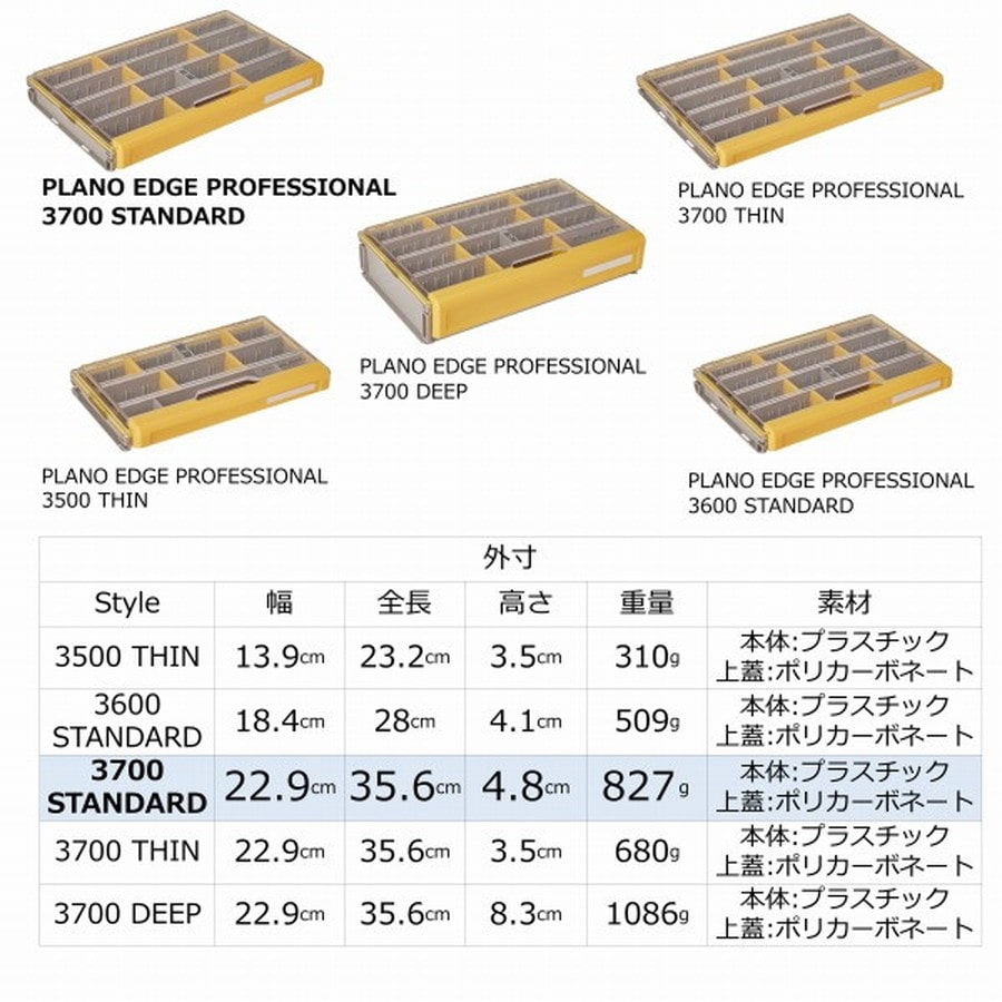 PLANO EDGE プロフェッショナル『EDGE 3500 THIN』、『EDGE 3600 STANDARD』、『EDGE 3700 STANDARD』、『EDGE 3700 THIN』、『EDGE 3700 DEEP』からなる、基本スペックをすべて網羅した画期的なタックルボックス。プレカットされた通気性のある仕切り、Dri-Loc防水シール、吸水性乾燥剤を備えており、ボックス内部の湿気を除去してサビを防ぐ。中身をすぐに識別できるDura View (透明なポリカーボネイト製の上蓋)や、片手で簡単に開閉できる特大ラッチで、使いやすさを追求。同サイズのユニットを複数積み重ねられるように設計され、システマチックな収納が可能。リブつきのフタとベース、スチール製のピンヒンジは、耐久性があり、掴みやすく、簡単に開閉できる。★Size(外寸): 全長(L)35.6cm Size(外寸): 幅(W)22.9cm Size(外寸): 高さ(H)4.8cm Style3700 STANDARD 素材本体プラスチック、上蓋ポリカーボネート 重量827g