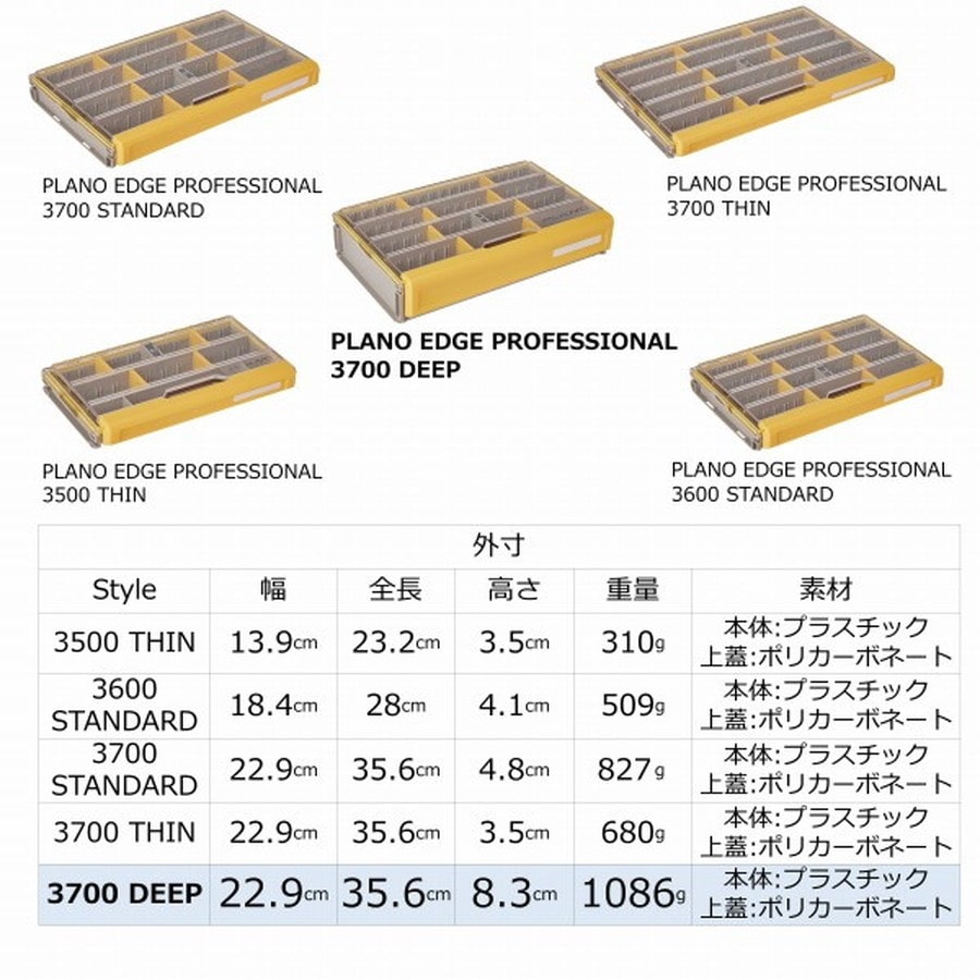 PLANO EDGE プロフェッショナル『EDGE 3500 THIN』、『EDGE 3600 STANDARD』、『EDGE 3700 STANDARD』、『EDGE 3700 THIN』、『EDGE 3700 DEEP』からなる、基本スペックをすべて網羅した画期的なタックルボックス。プレカットされた通気性のある仕切り、Dri-Loc防水シール、吸水性乾燥剤を備えており、ボックス内部の湿気を除去してサビを防ぐ。中身をすぐに識別できるDura View (透明なポリカーボネイト製の上蓋)や、片手で簡単に開閉できる特大ラッチで、使いやすさを追求。同サイズのユニットを複数積み重ねられるように設計され、システマチックな収納が可能。リブつきのフタとベース、スチール製のピンヒンジは、耐久性があり、掴みやすく、簡単に開閉できる。★Size(外寸): 全長(L)35.6cm Size(外寸): 幅(W)22.9cm Size(外寸): 高さ(H)8.3cm Style3700 DEEP 素材本体プラスチック、上蓋ポリカーボネート 重量1086g