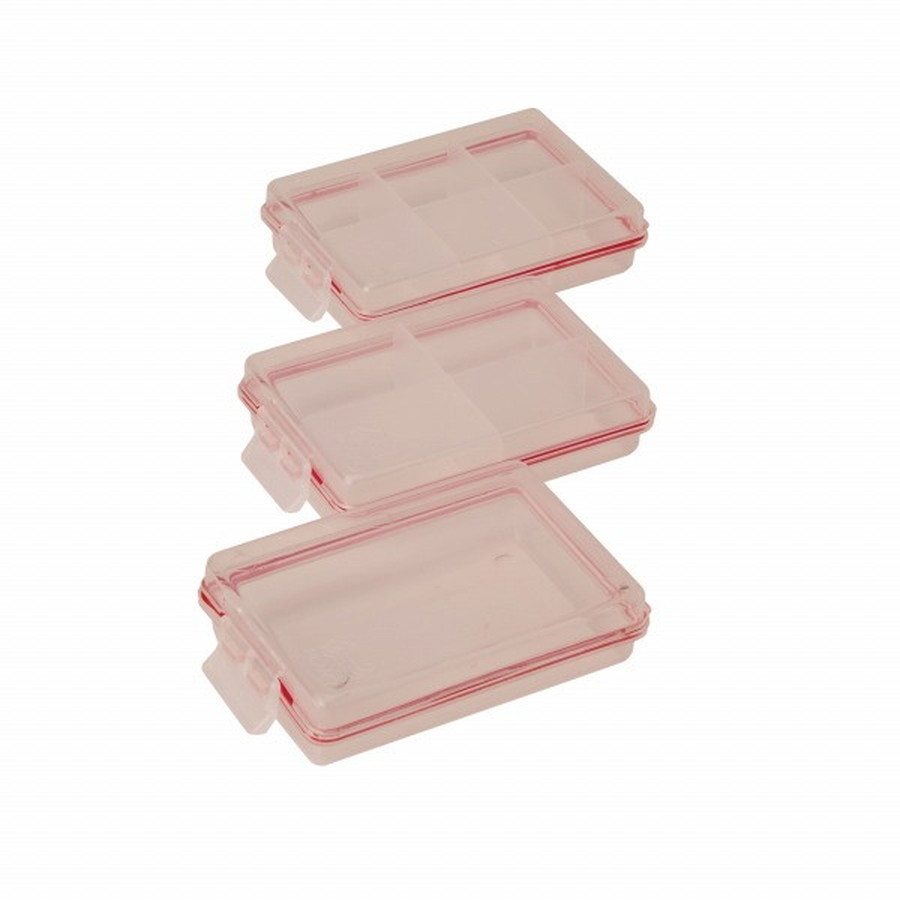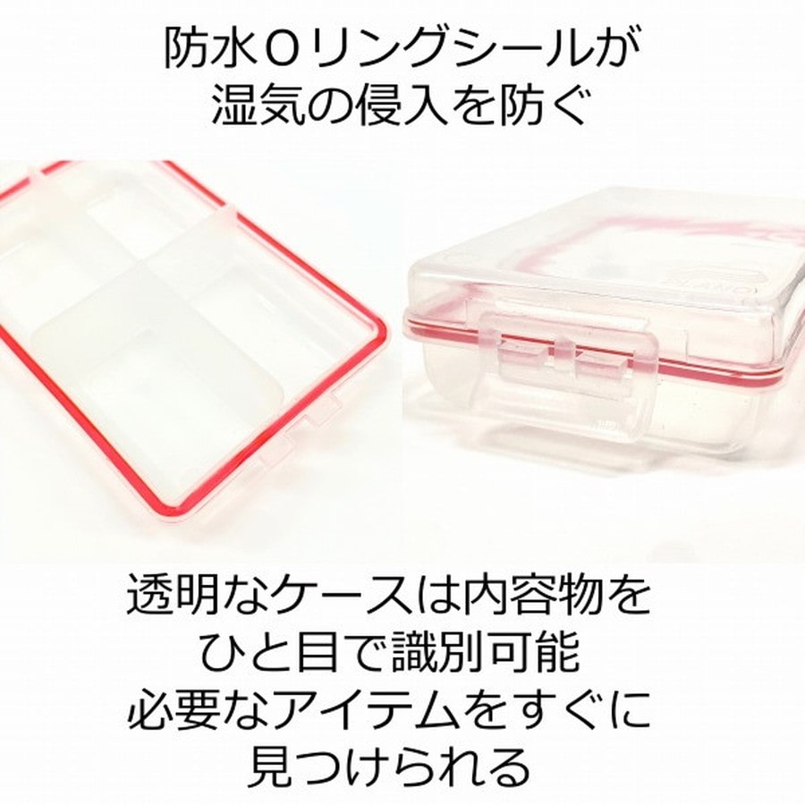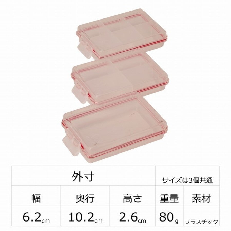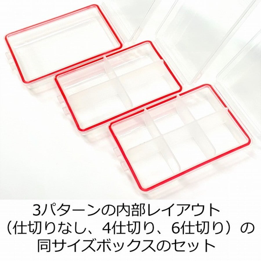 スモールウォータープルーフBOX 3-パックフックやシンカー、スイベルやスプリットリングといった、細かなターミナルタックルを整理、保管するのに最適なケース。3パターンの内部レイアウト(仕切りなし、4仕切り、6仕切り)の、同サイズボックスのセット。防水Oリングシールが、内部への湿気の侵入を防ぐ。透明なデザインにより、開けずに中身を識別できる。★Size: 幅(W)6.2cm Size: 奥行(D)10.2cm Size: 高さ(H)2.6cm StyleSM Waterproof (3-Pack) 素材プラスチック 重量80g