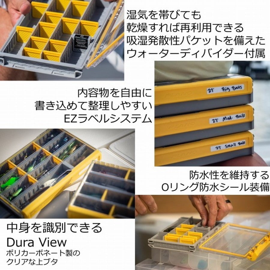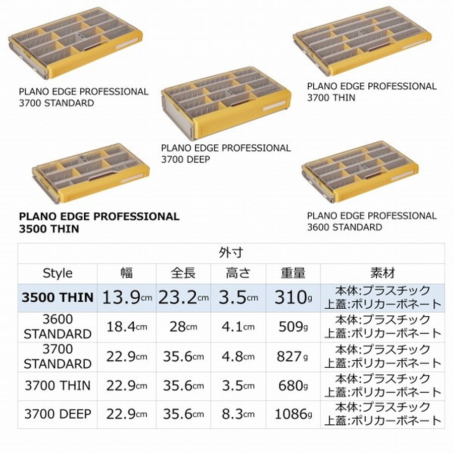 PLANO EDGE プロフェッショナル『EDGE 3500 THIN』、『EDGE 3600 STANDARD』、『EDGE 3700 STANDARD』、『EDGE 3700 THIN』、『EDGE 3700 DEEP』からなる、基本スペックをすべて網羅した画期的なタックルボックス。プレカットされた通気性のある仕切り、Dri-Loc防水シール、吸水性乾燥剤を備えており、ボックス内部の湿気を除去してサビを防ぐ。中身をすぐに識別できるDura View (透明なポリカーボネイト製の上蓋)や、片手で簡単に開閉できる特大ラッチで、使いやすさを追求。同サイズのユニットを複数積み重ねられるように設計され、システマチックな収納が可能。リブつきのフタとベース、スチール製のピンヒンジは、耐久性があり、掴みやすく、簡単に開閉できる。★Size(外寸): 全長(L)23.2cm Size(外寸): 幅(W)13.9cm Size(外寸): 高さ(H)3.5cm Style3500 THIN 素材本体プラスチック、上蓋ポリカーボネート 重量310g