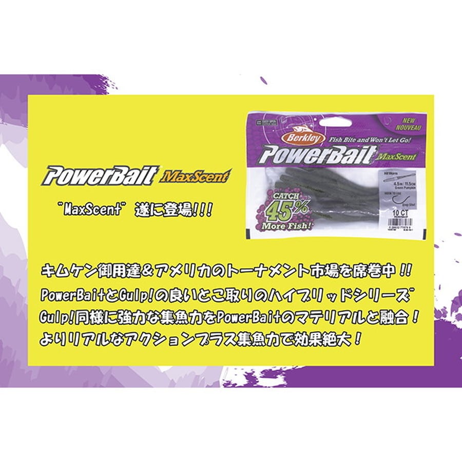 2018年、数量限定で緊急発売決定!!! キムケン御用達&アメリカのトーナメント市場を席巻中!!! PowerBaitとGulp!の良いとこ取りのハイブリッドシリーズ”MaxScent”遂に登場!!!